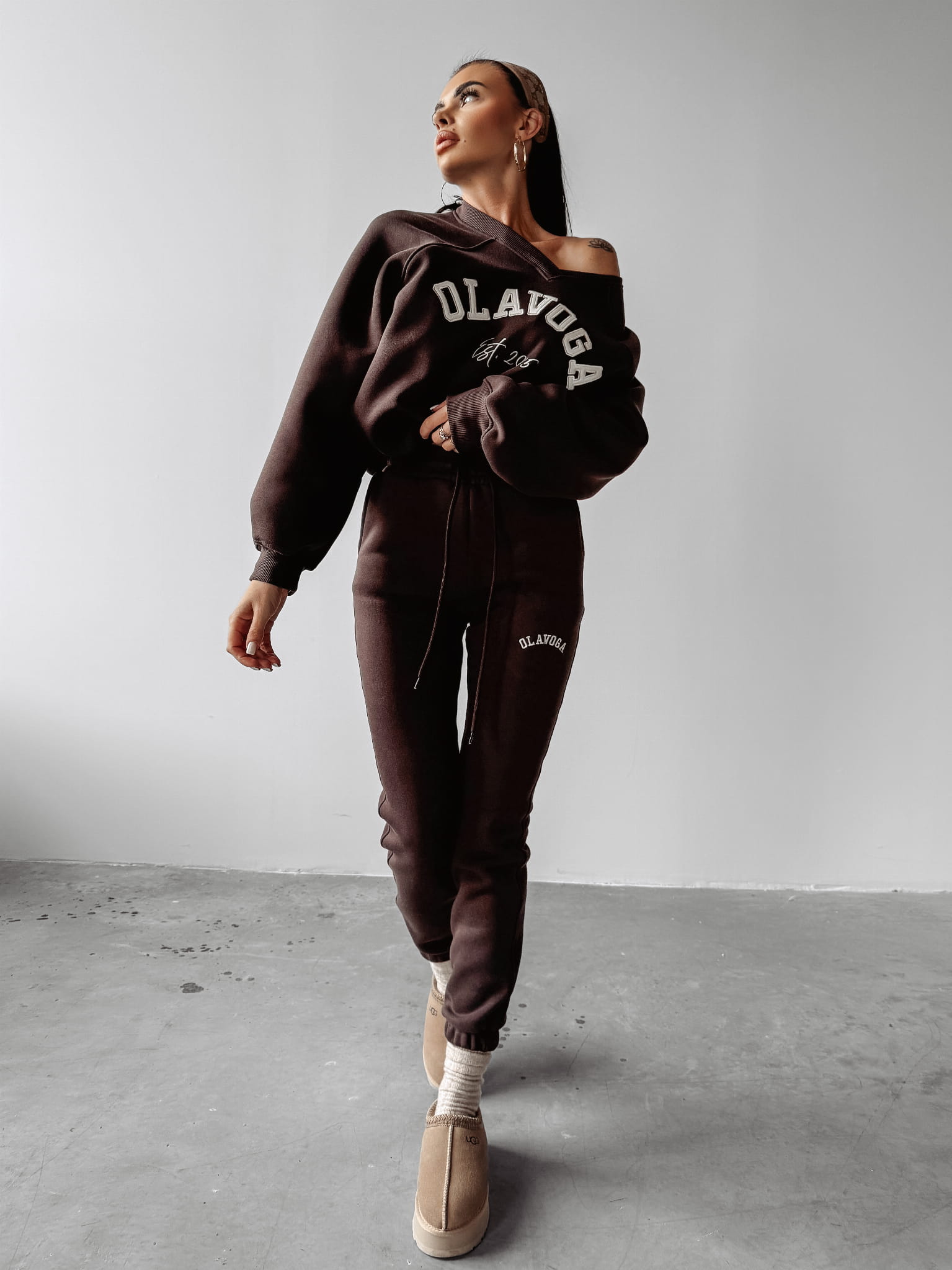 Ocieplany komplet dresowy, wykonany z wysokiej jakości bawełnianego materiału. Góra - delikatnie oversiz’owa bluza o krótszym kroju, z przeszyciami. Na przodzie naszywka z logo marki oraz pisany napis EST. 2015. Na rękawach prążkowane ściągacze. Talia posiada gumę. Dół - dresowe, wiązane spodnie. Po bokach kieszenie. Na przodzie minimalistyczny haft z logo marki OLAVOGA.