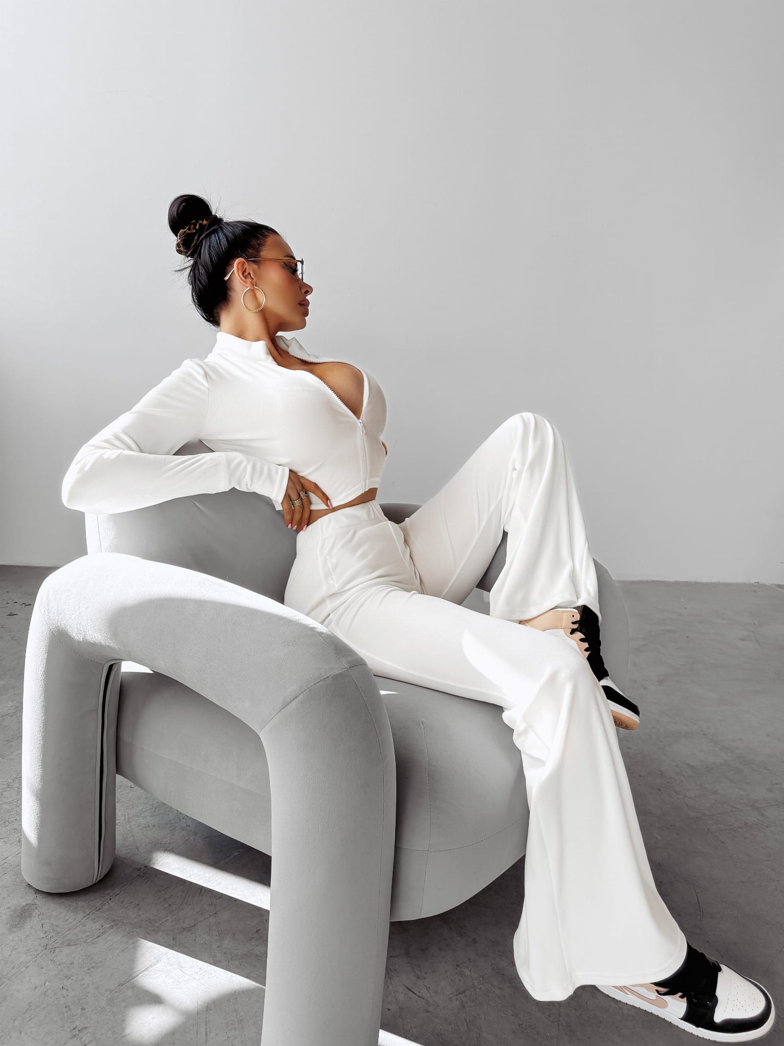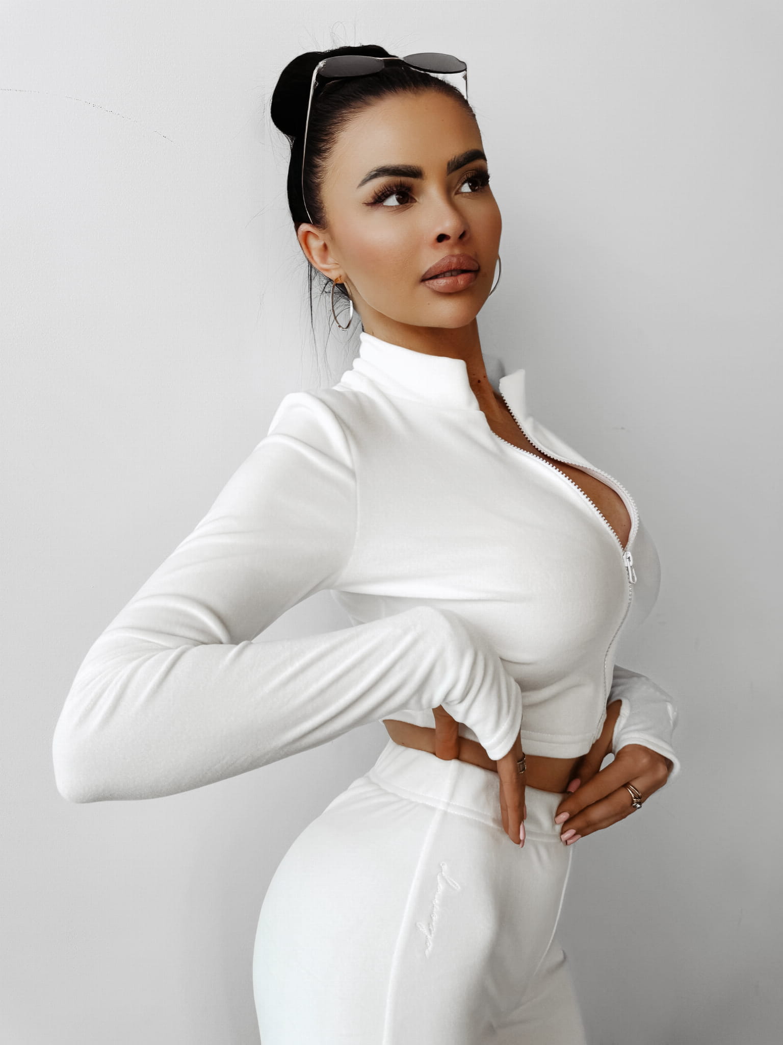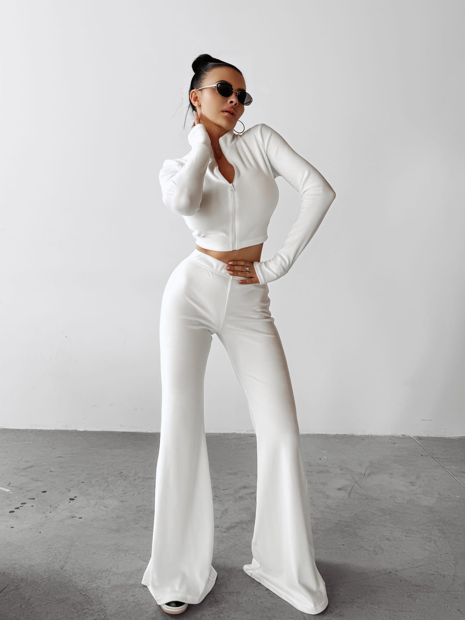 Komplet damski wykonany z miękkiego w dotyku weluru. Góra - przylegająca, rozpinana na suwak bluzka z długim rękawem. Produkt psująca wycięcie na kciuk. Na jednym z rękawów pisany, minimalistyczny haft z logo marki OLAVOGA. Dół - spodnie rozszerzane ku dołowi. Guma w talii. Produkt posiada wysoki stan. Na przodzie minimalistyczny haft z logo brandu.