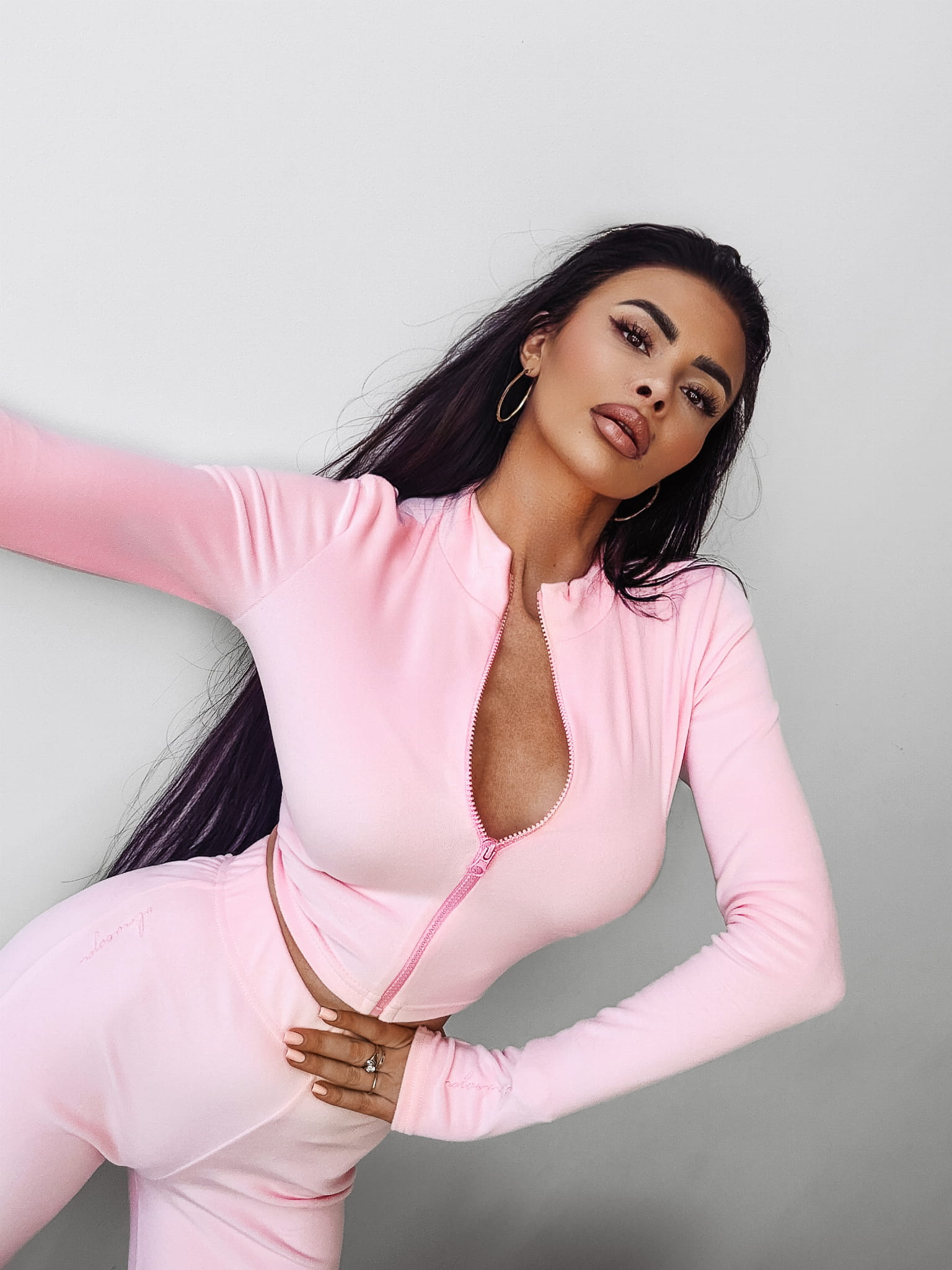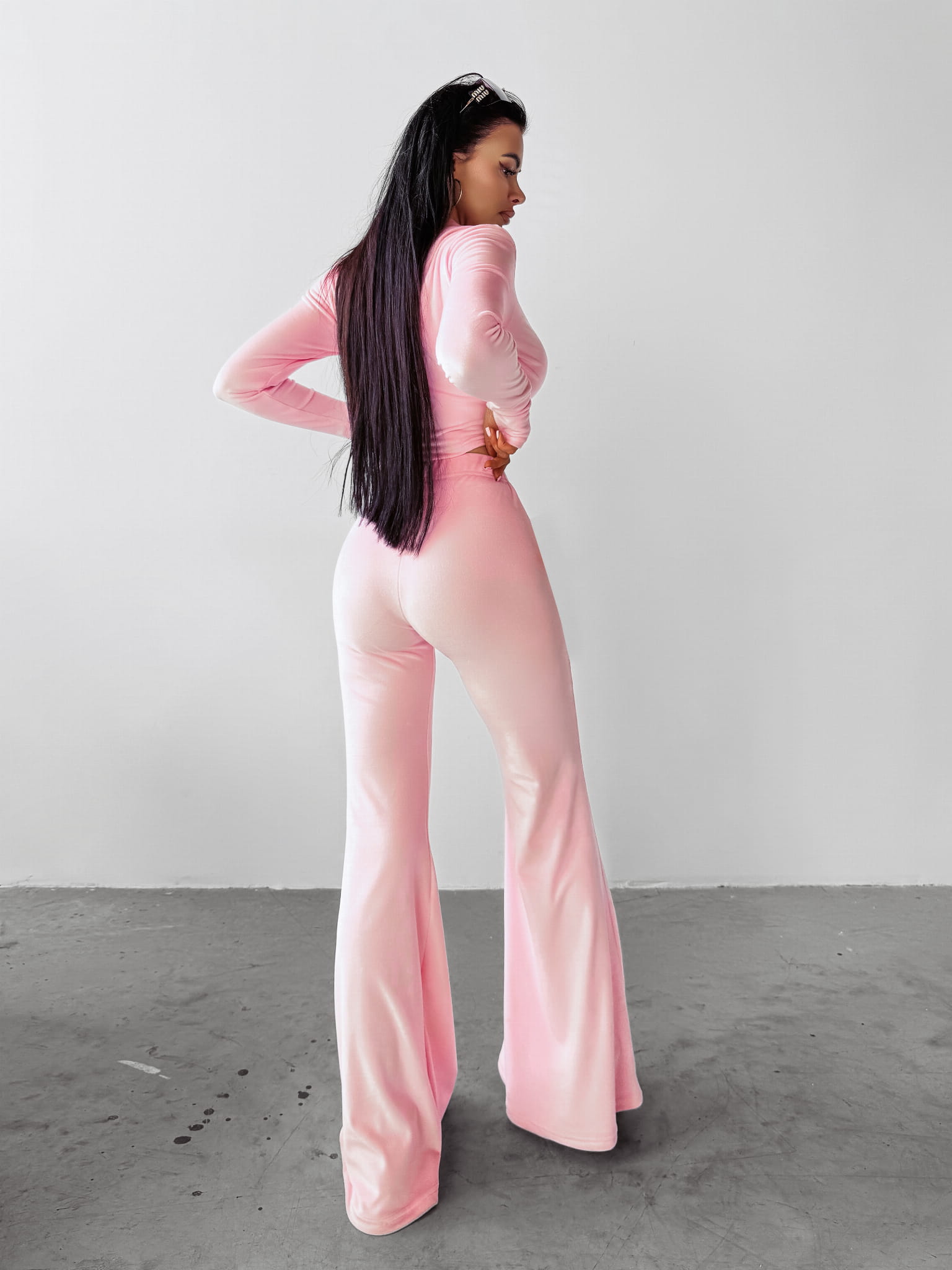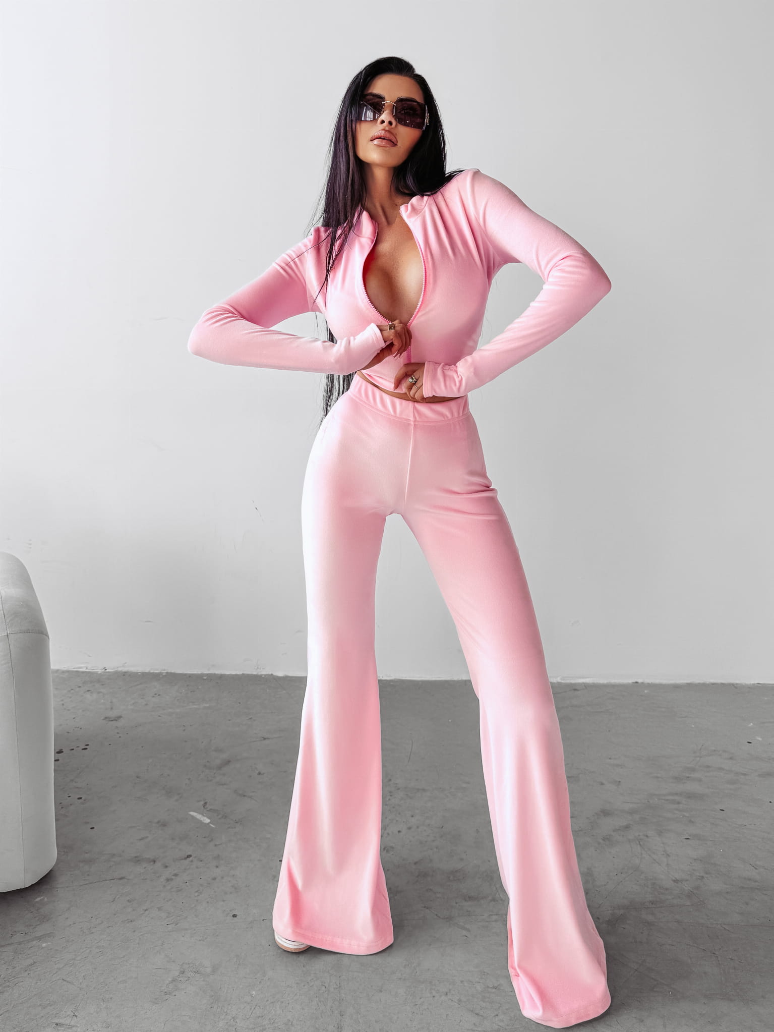 Komplet damski wykonany z miękkiego w dotyku weluru. Góra - przylegająca, rozpinana na suwak bluzka z długim rękawem. Produkt psująca wycięcie na kciuk. Na jednym z rękawów pisany, minimalistyczny haft z logo marki OLAVOGA. Dół - spodnie rozszerzane ku dołowi. Guma w talii. Produkt posiada wysoki stan. Na przodzie minimalistyczny haft z logo brandu.