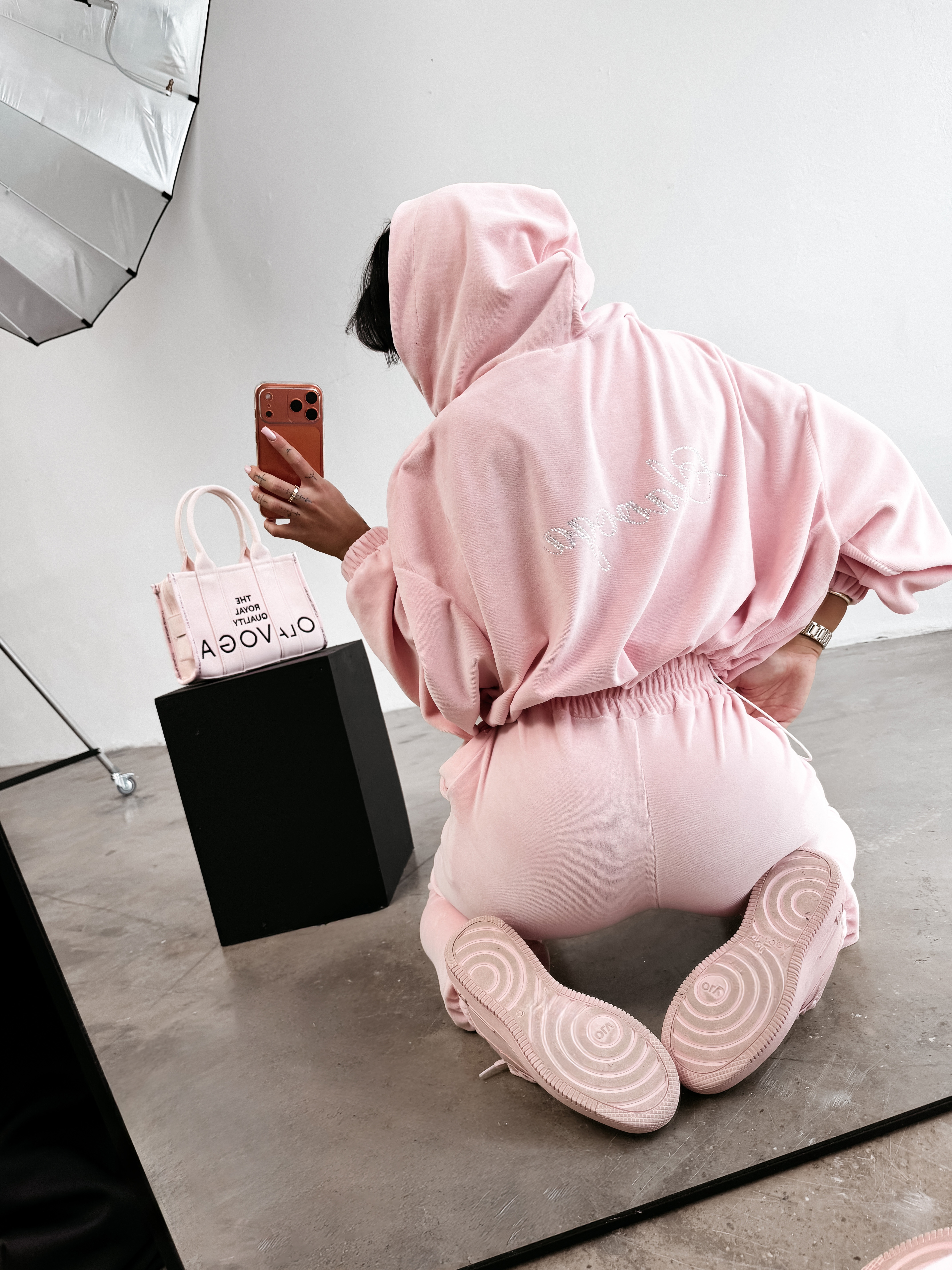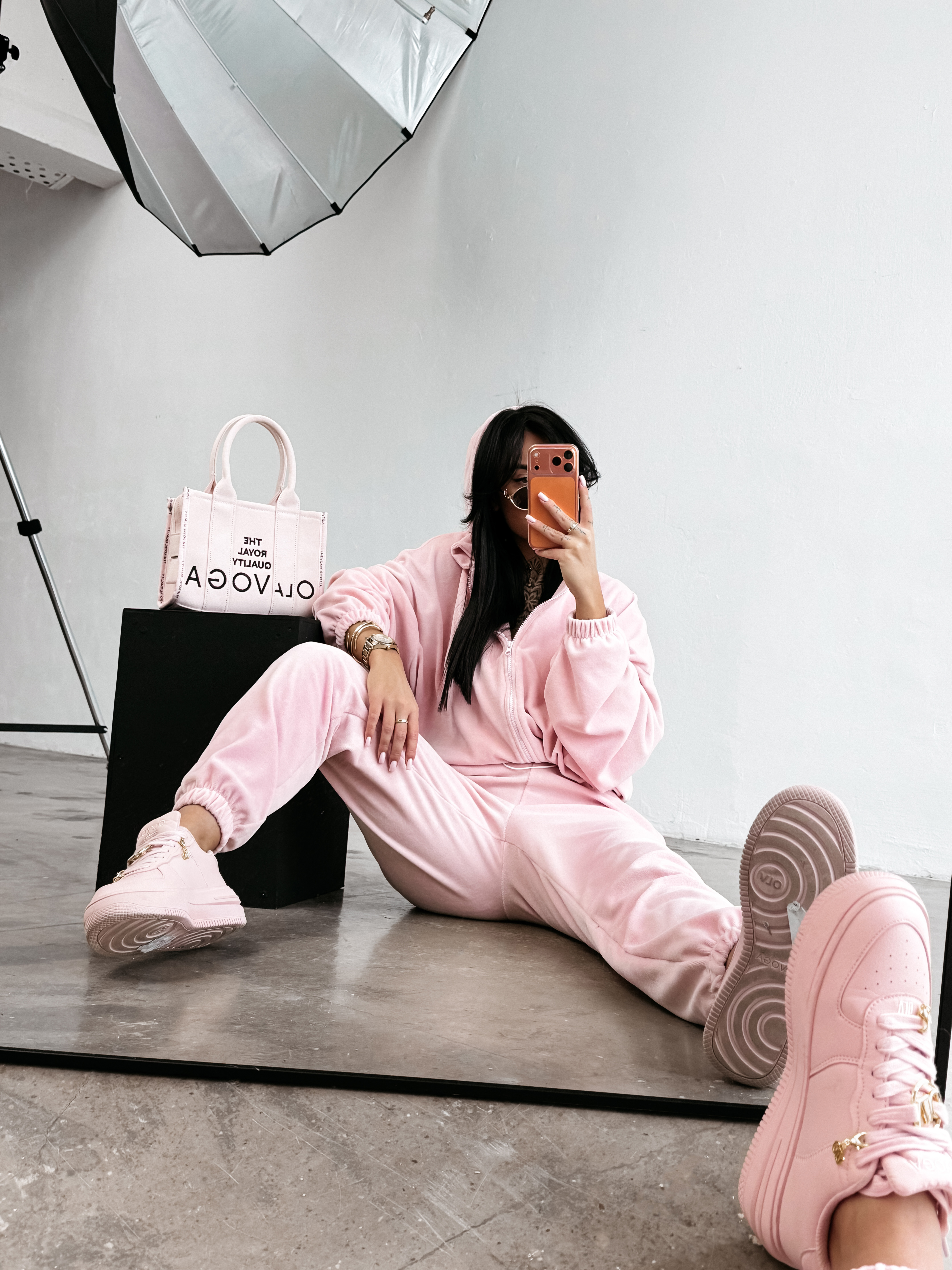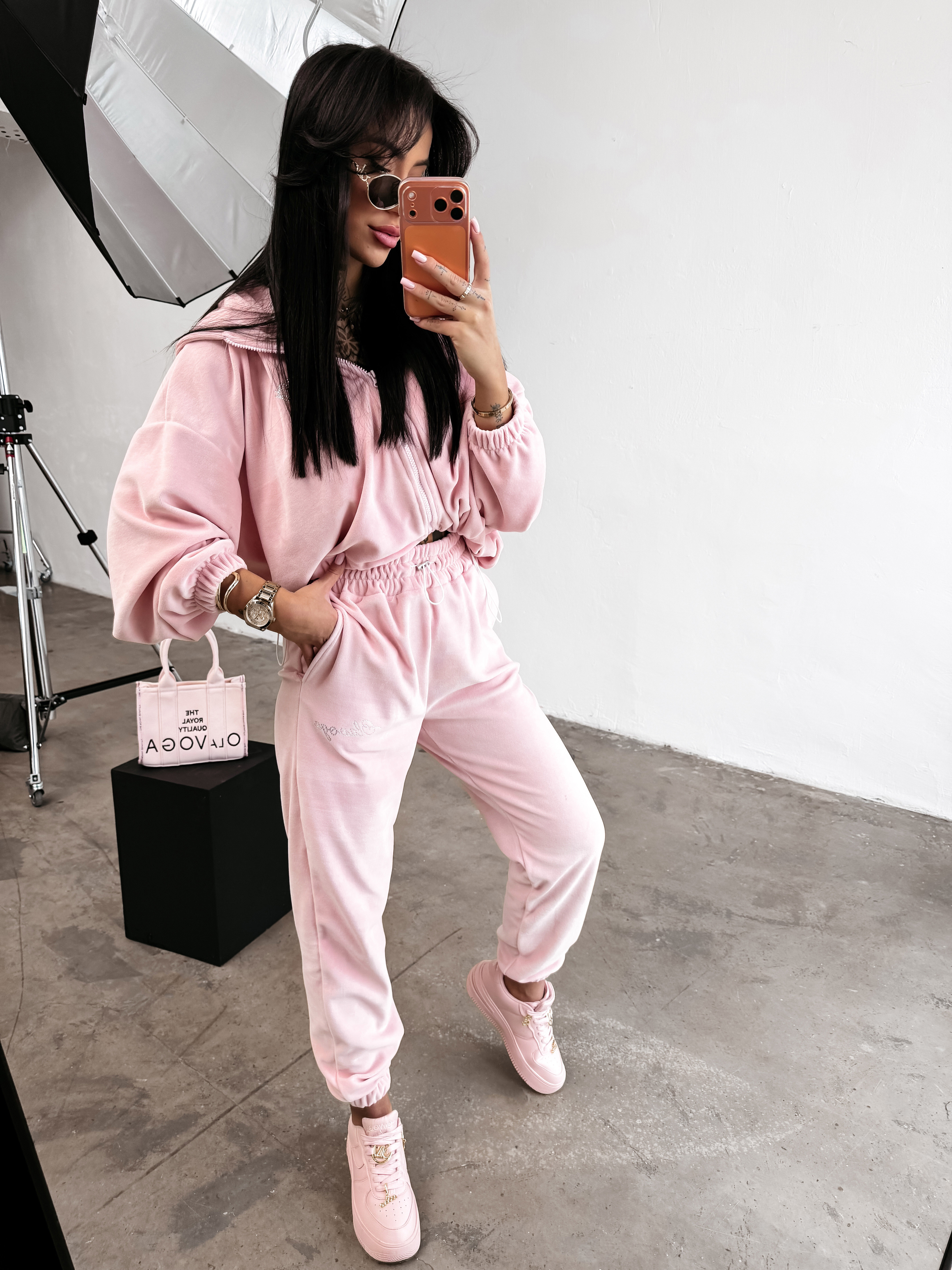 Welurowy komplet o casualowym charakterze. Wykonany z miękkiego, przyjemnego w dotyku weluru. Góra - bluza o luźnym, lekko skróconym kroju, zapinana na zamek, z obszernym kapturem. Długie rękawy oraz dół wykończone elastycznymi ściągaczami. Na przodzie subtelne, połyskujące logo marki OLAVOGA wykonane z aplikacji kryształkowej. Na plecach efektowny, obszerny napis, który stanowi mocny, biżuteryjny akcent. Dół - spodnie z wysokim stanem i elastyczną talią. Nogawki o prostym, lekko zwężanym kroju, zakończone ściągaczami. Delikatne logo OLAVOGA na nogawce.