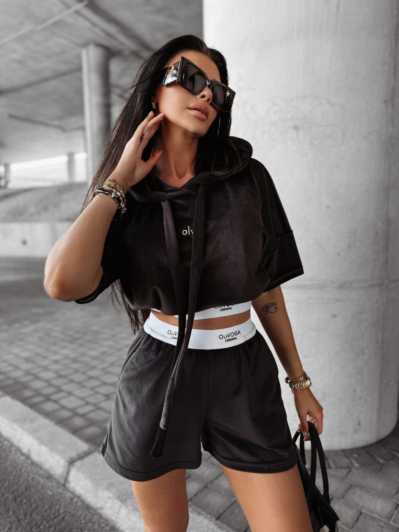Sportowy komplet damski wykonany z miękkiego w dotyku weluru. Góra - bluza z kapturem z krótkim rękawem. Logowana guma w talii. Kaptur regulowany poprzez sznurek. Na przodzie haft OLV. Dół - szorty z logowana guma w talii. Po bokach kieszenie.