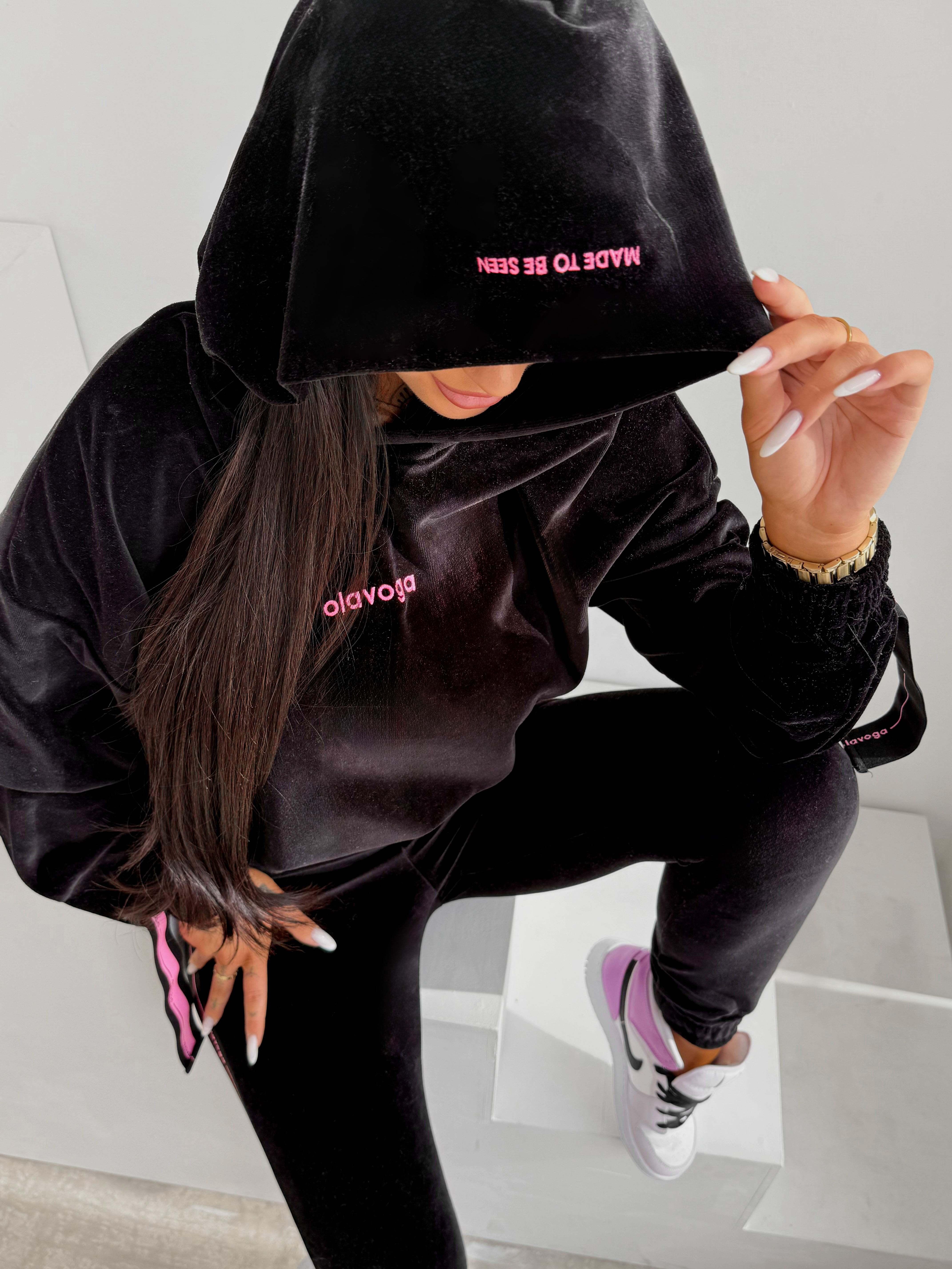 Bluza o luźnym skróconym fasonie - miękki welurowy materiał - kaptur - elastyczne wykończenie u dołu i przy rękawach - haft OLAVOGA na przodzie - haft z hasłem made to be seen na kapturze - kontrastowe wstawki z logowaną gumą - nowoczesny charakter