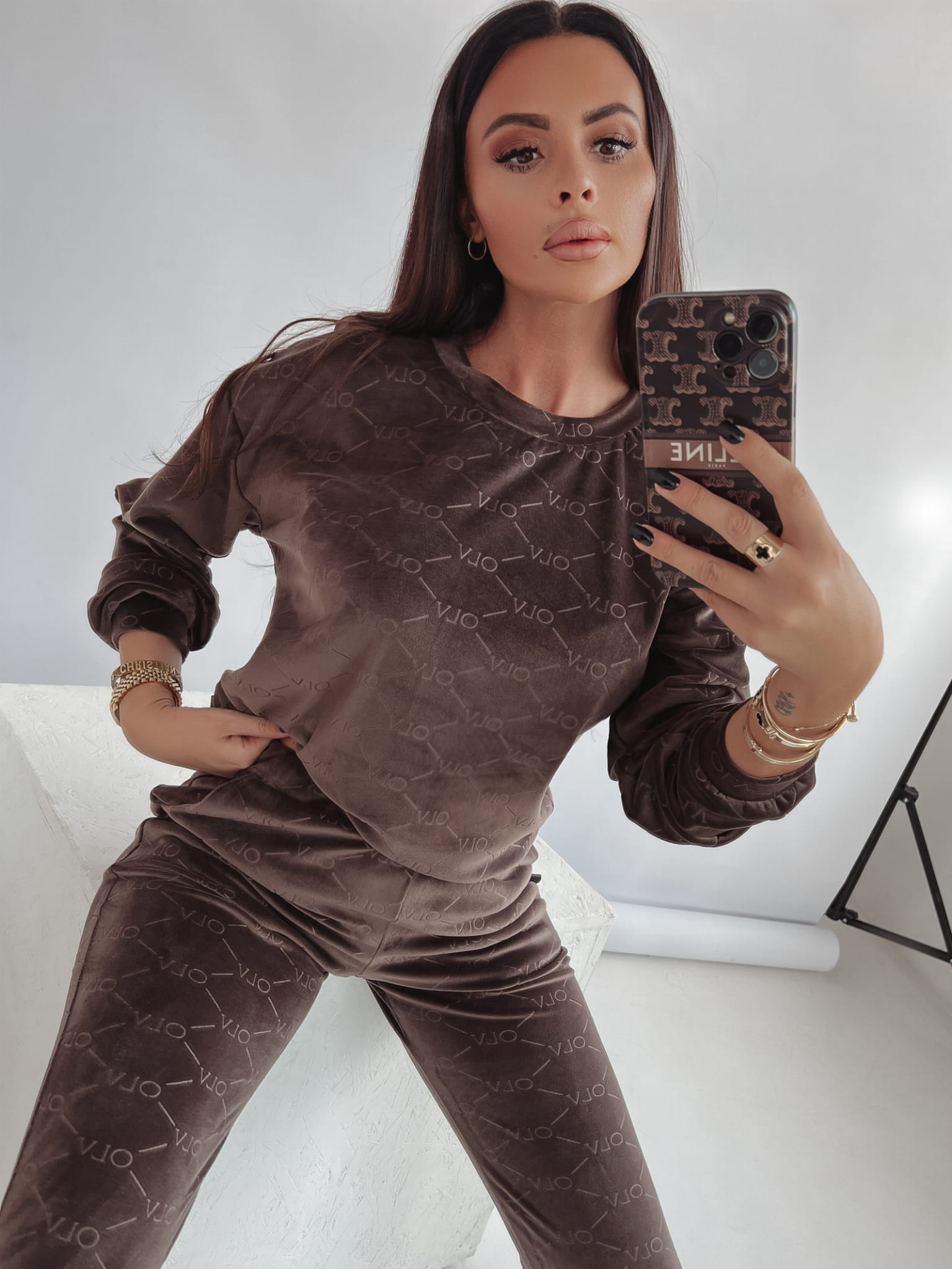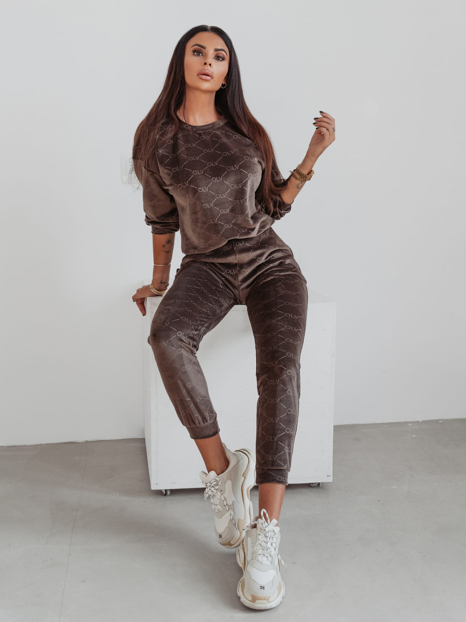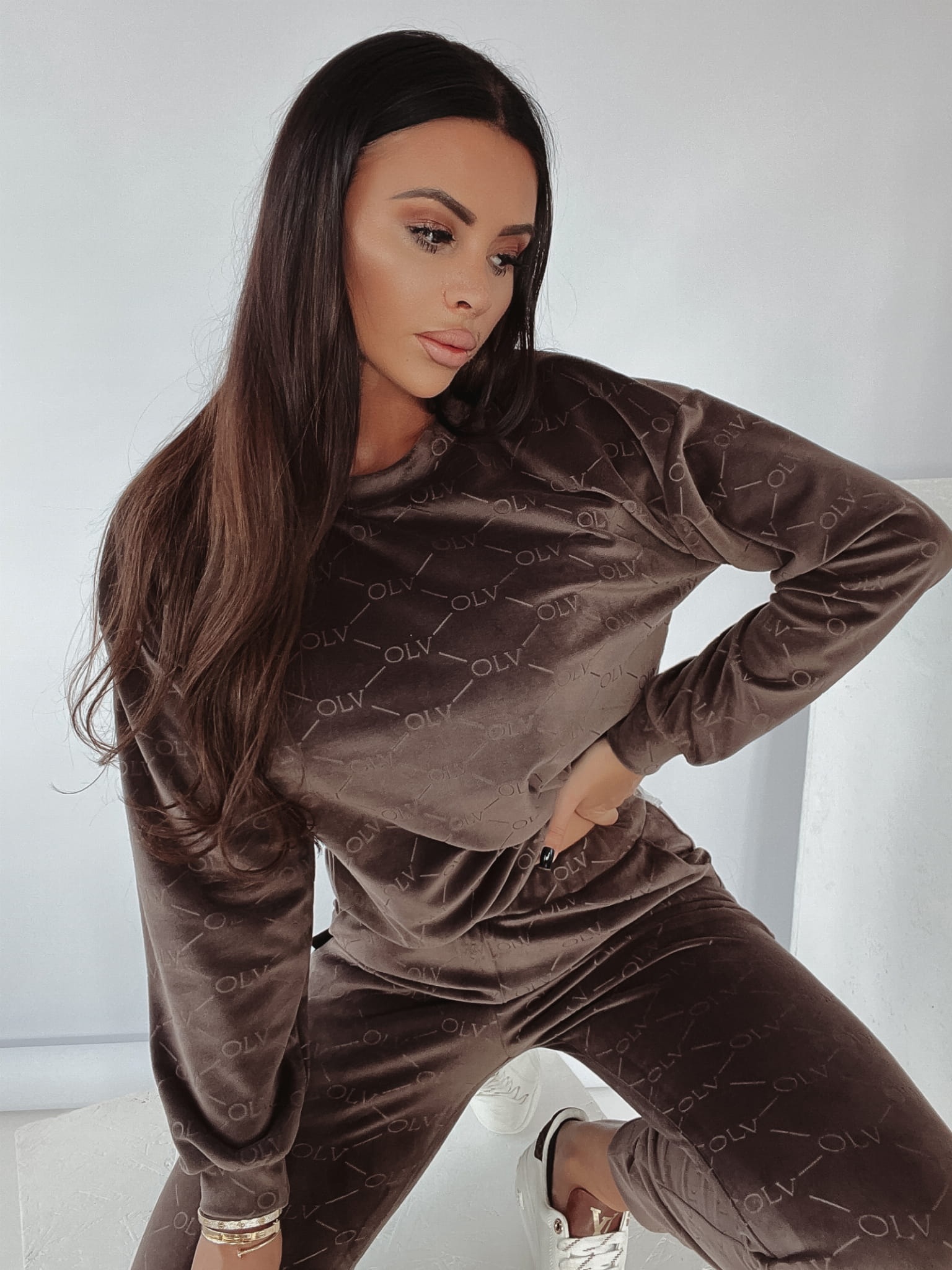 Welurowy komplet damski drukowany charakterystycznym printem marki OLAVOGA. Miękki, niezwykle przyjemny w dotyku materiał zapewni Ci komfort noszenia nawet w najbardziej chłodne dni.