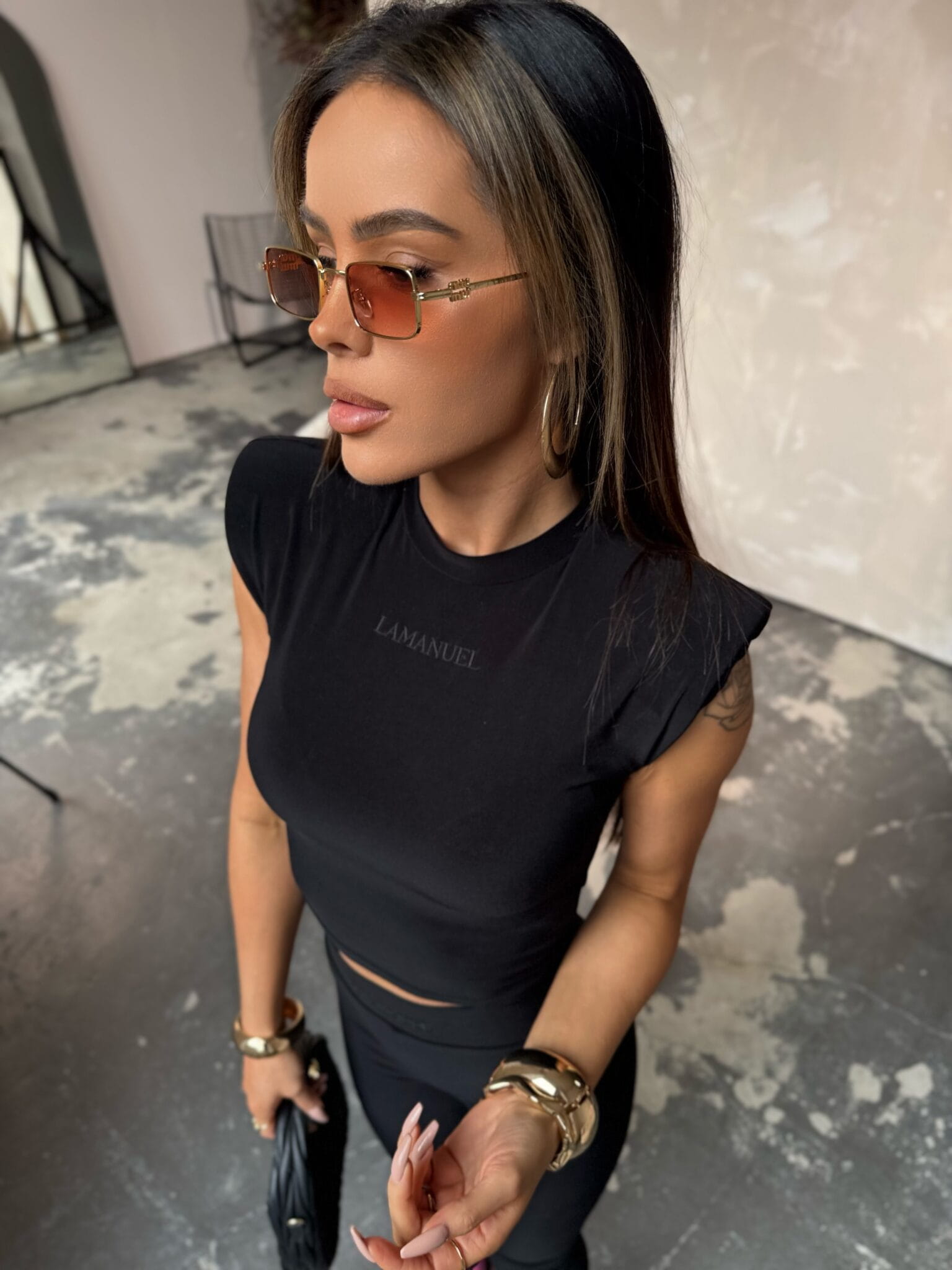 Nowoczesny komplet, który łączy minimalistyczny design z odważnym charakterem. Dopasowany top z poduszkami na ramionach i legginsy z wysokim stanem tworzą idealne zestawienie, które modeluje sylwetkę i zapewnia efektowny wygląd.