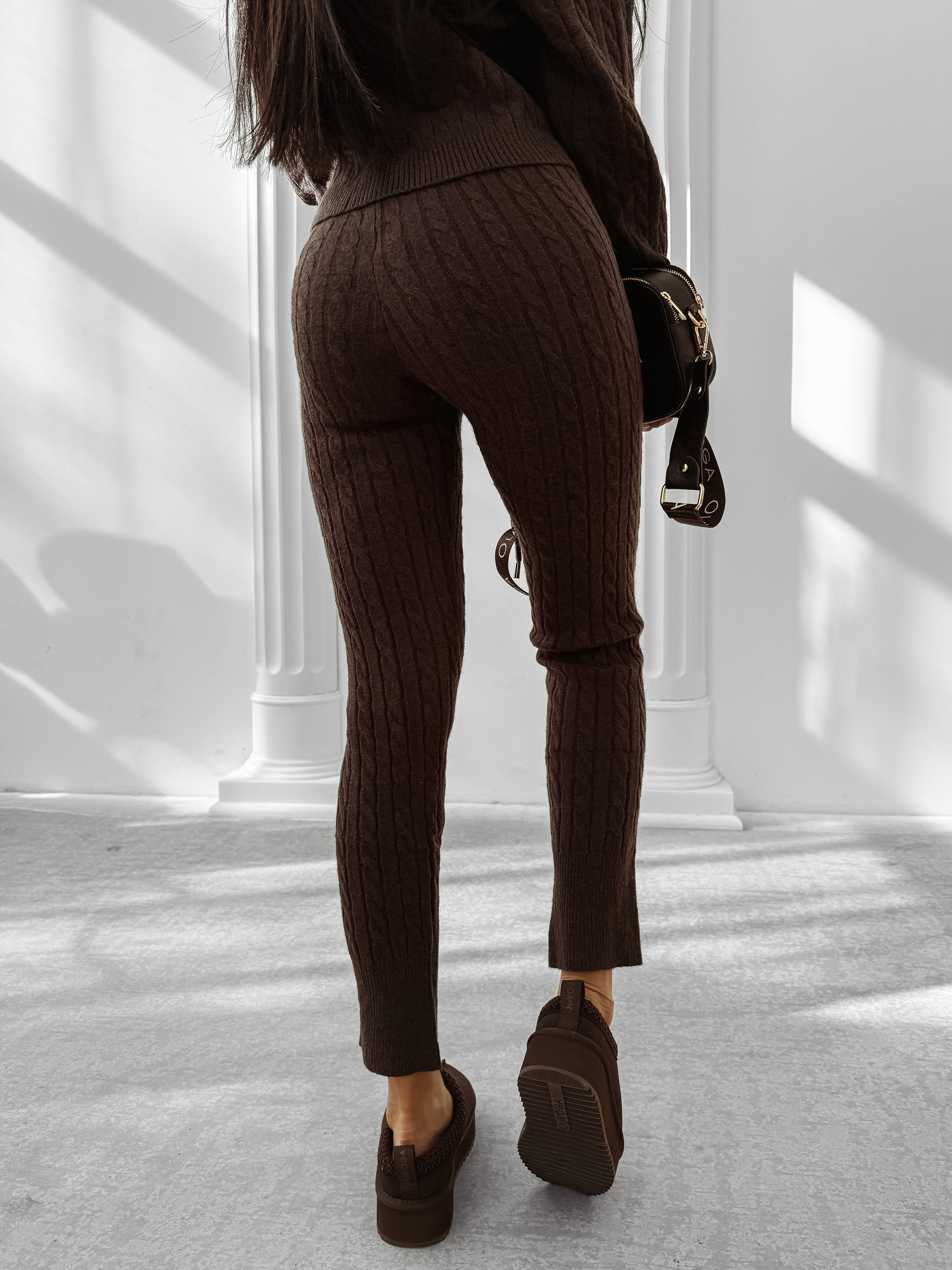 Komplet damski wykonany z miękkiej dzianiny o wyraźnym, warkoczowym splocie. Góra – krótki sweter o kroju crop, z długim rękawem i okrągłym dekoltem. Na piersi subtelne logo OLV. Dół – spodnie o dopasowanym kroju, z wysokim stanem i elastyczną talią regulowaną sznurkiem, wykończone ściągaczami przy nogawkach. Po boku logo OLV w tonacji produktu.