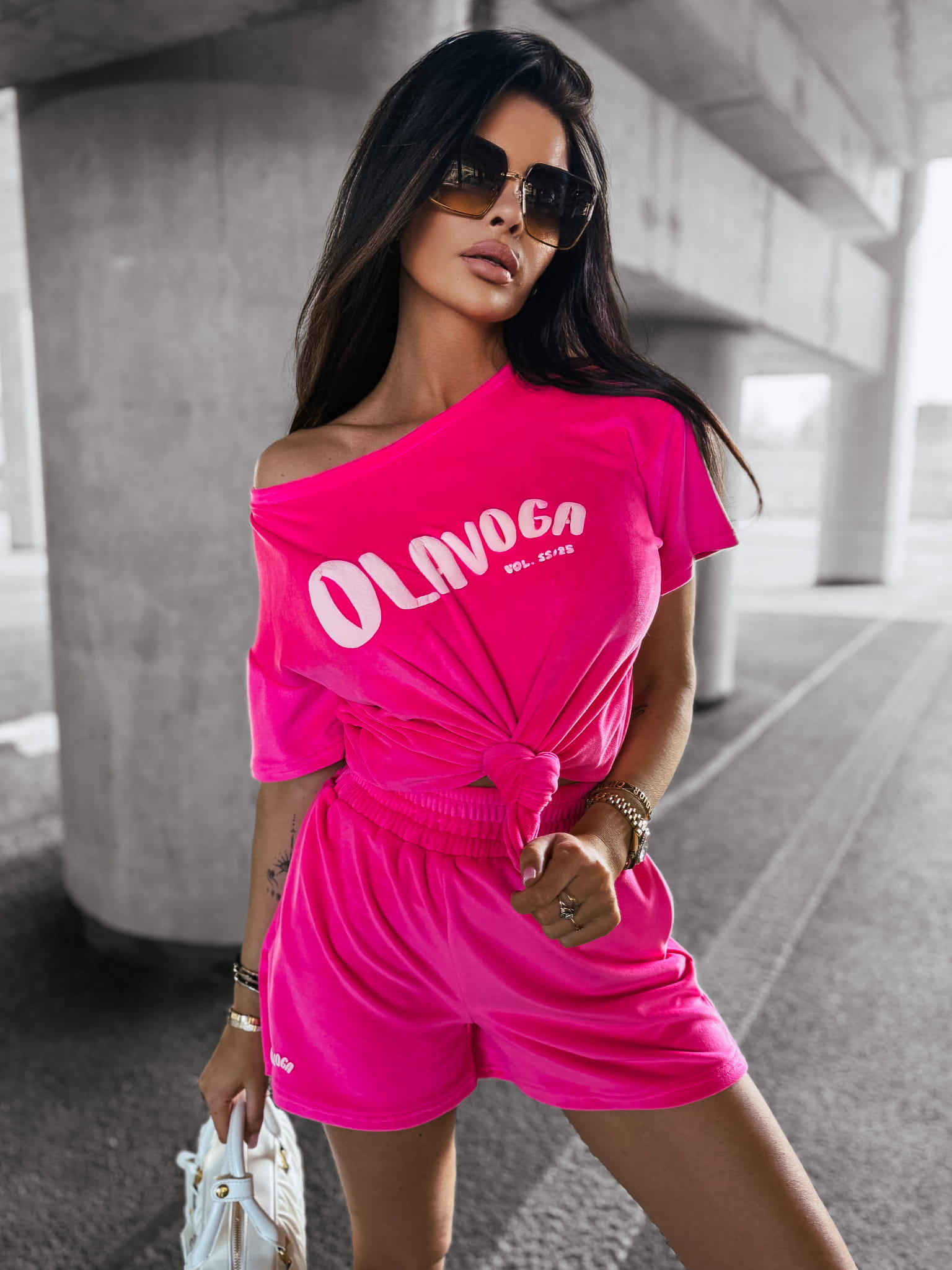 Casualowy komplet damski wykonany z miękkiego w dotyku weluru. Góra - bluzka o dłuższym kroju z krótkim rękawem. Na przodzie obszerne logo marki OLAVOGA w ciekawym princie. Dok - szorty z wysokim stanem. Po bokach kieszenie. Na przodzie minimalistyczne logo brandu.