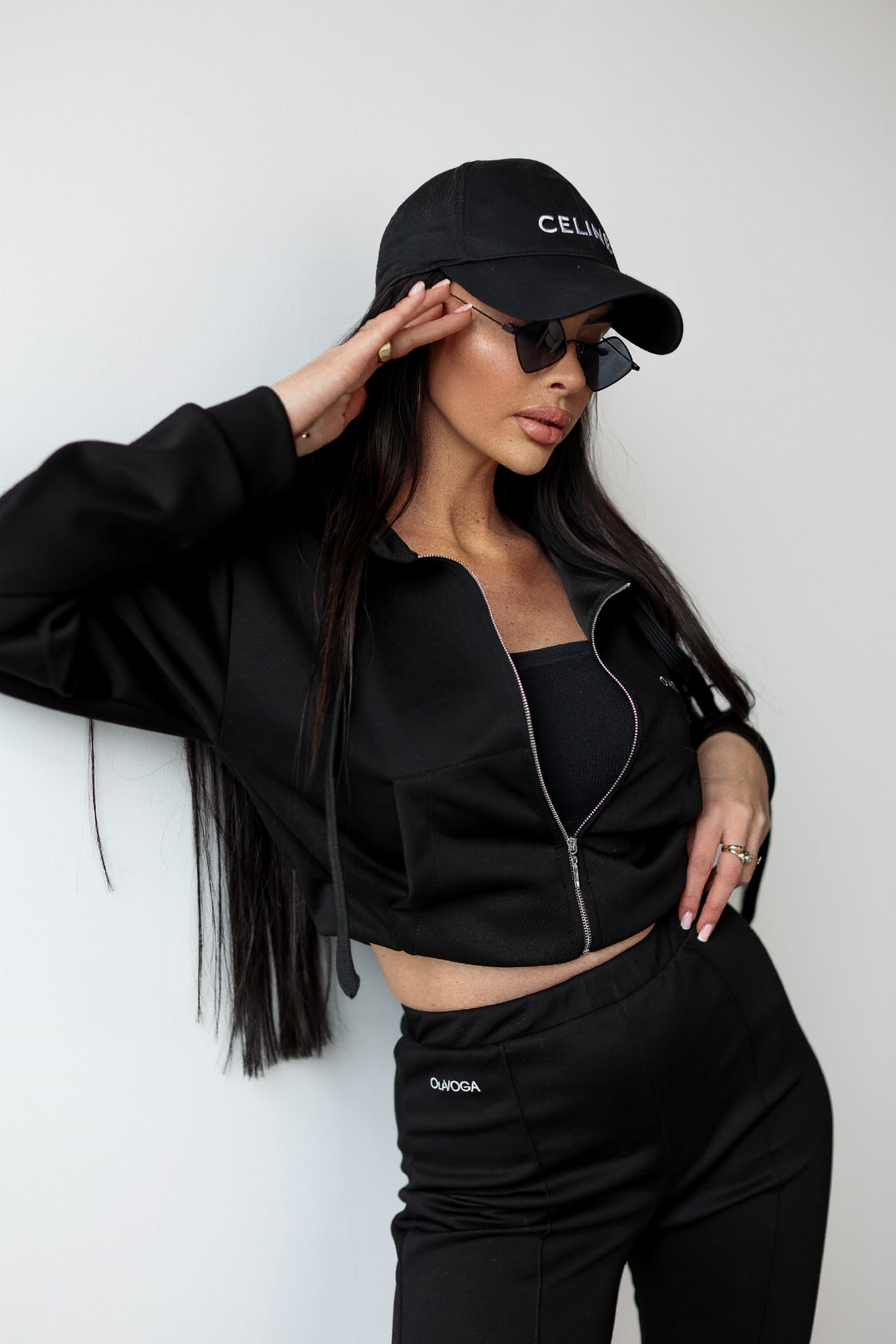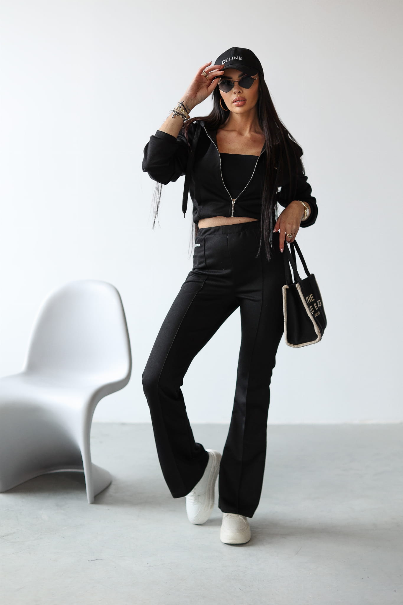 Komplet wykonany z wysokiej jakości dobrze układającego się materiału. Góra - bluza z kapturem o krótszym kroju. Po bokach kieszenie. Na przodzie minimalistyczny haft z logo marki OLAVOGA. Dół - przylegające legginsy rozszerzane ku dołowi. Posiada modne w tym sezonie przeszycia. Na przodzie minimalistyczny haft z logo brandu.