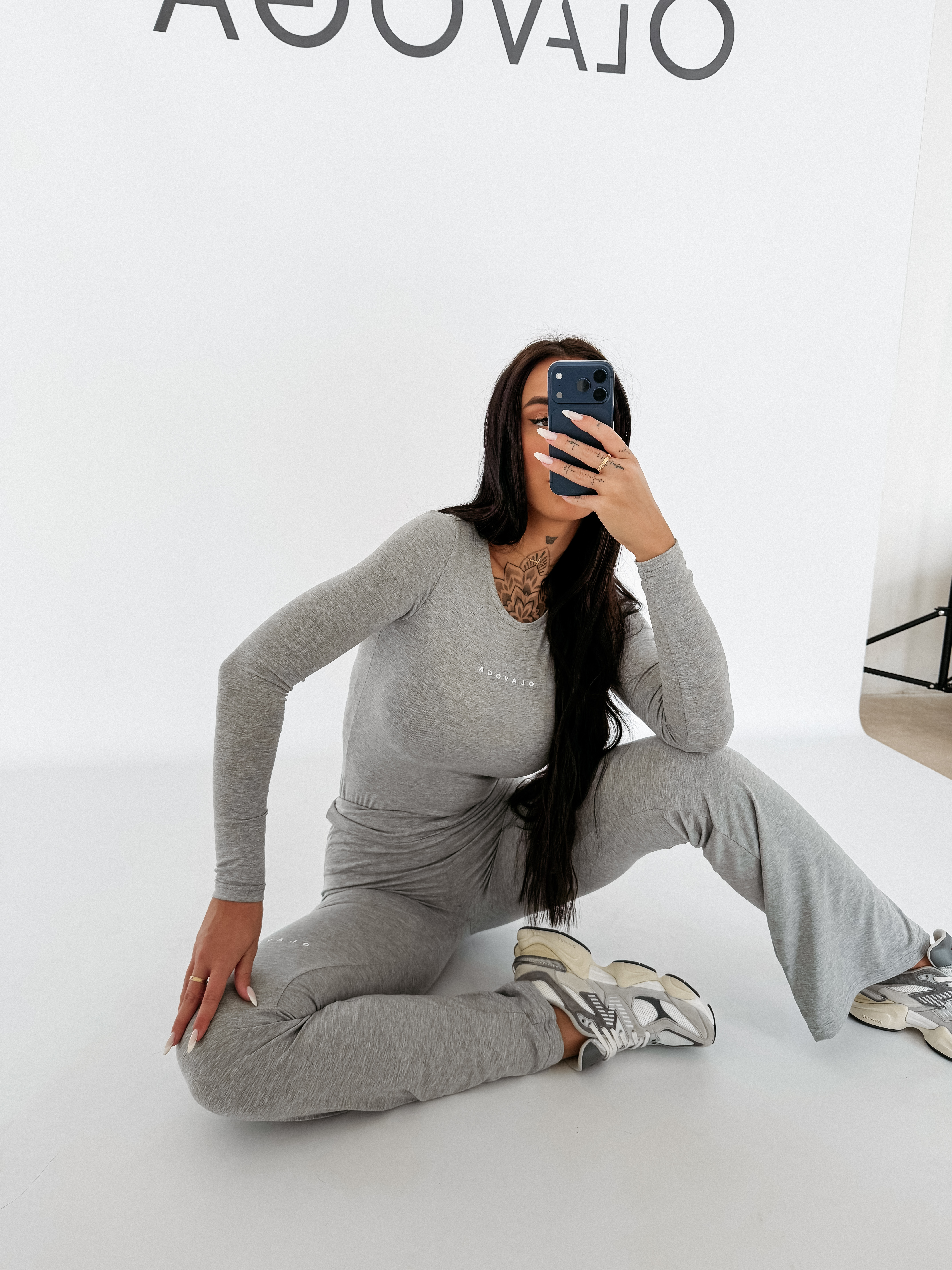 Dopasowany komplet o nowoczesnym, sportowo-casualowym charakterze. Wykonany z elastycznej, miękkiej dzianiny. Bluzka z długim rękawem oraz spodnie z wysokim stanem i lekko rozszerzaną nogawką podkreślają sylwetkę. Subtelne logowanie OLAVOGA. Ważne aspekty: dopasowany fason, elastyczny materiał, wysoki stan, rozszerzana nogawka, miękka dzianina, logo marki OLAVOGA, sportowo-elegancki styl.