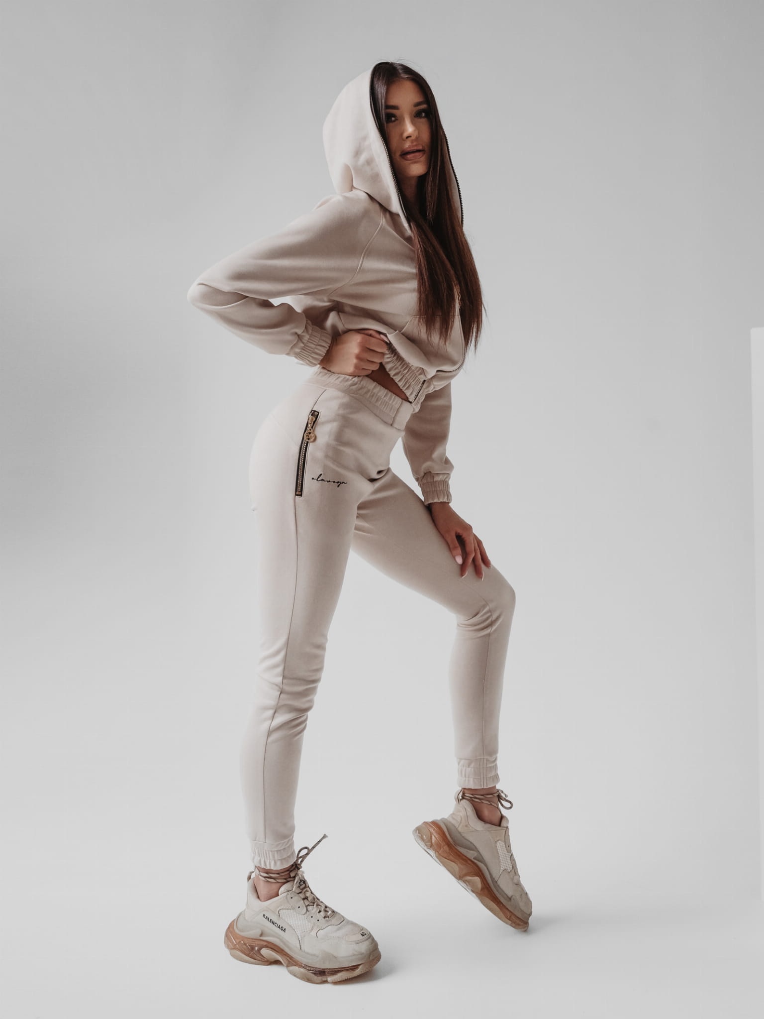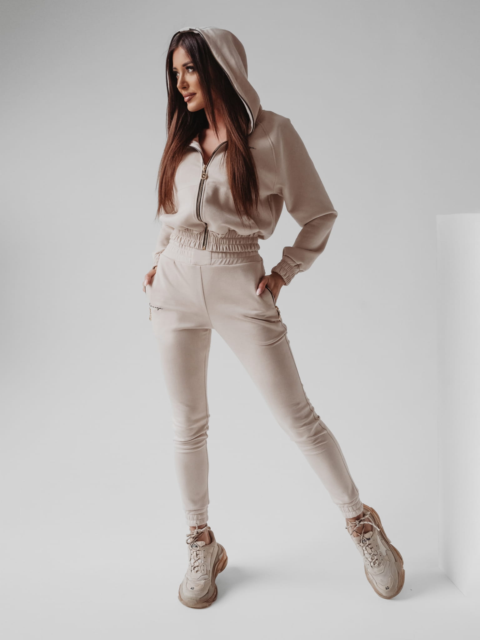 Komplet uszyty z najwyższej jakości, grubego zamszu. Rozpinana bluza z kapturem, obszytym dookoła złotym suwakiem. Na przodzie bluzy i nogawce spodni delikatny haft - pisane logo marki. Mankiety i nogawki wykończone marszczonym ściągaczem. Komplet może stanowić duet z męską wersją tego samego modelu.