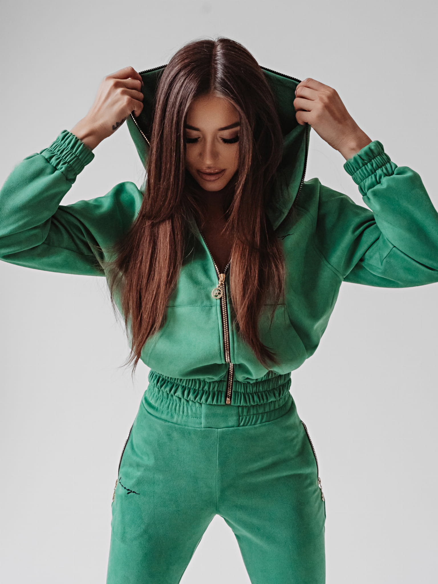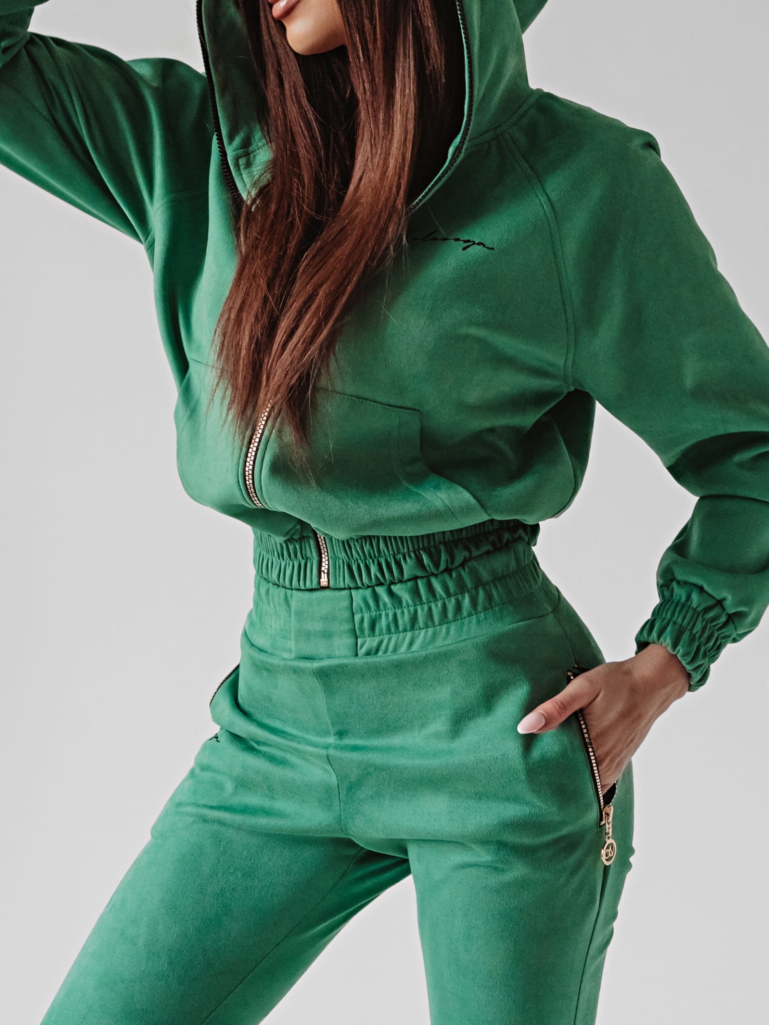Komplet uszyty z najwyższej jakości, grubego zamszu. Rozpinana bluza z kapturem, obszytym dookoła złotym suwakiem. Na przodzie bluzy i nogawce spodni delikatny haft - pisane logo marki. Mankiety i nogawki wykończone marszczonym ściągaczem. Komplet może stanowić duet z męską wersją tego samego modelu.