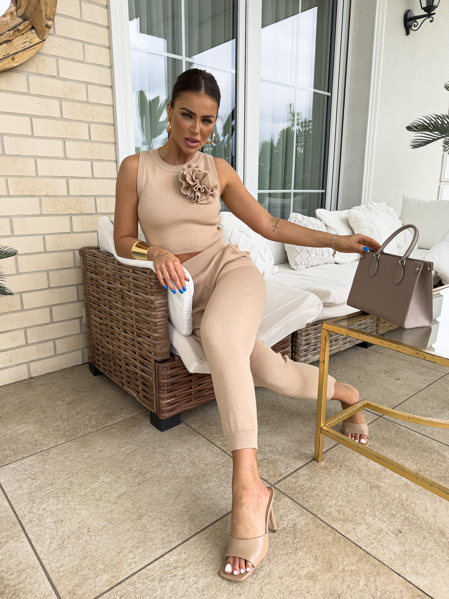Komplet składający się z krótkiego topu bez rękawów oraz długich spodni z gumką w pasie. Kwiat jest odpinany.