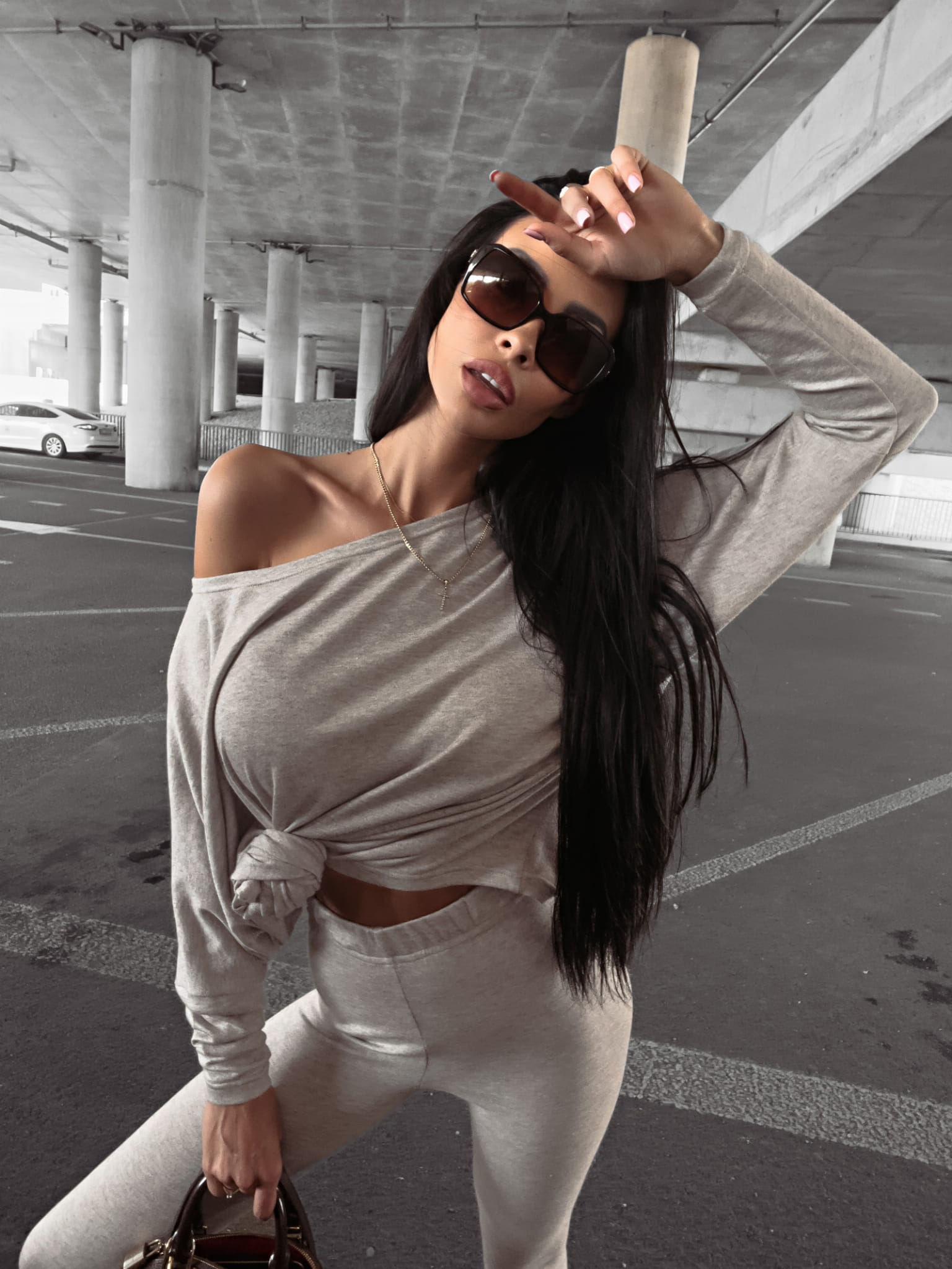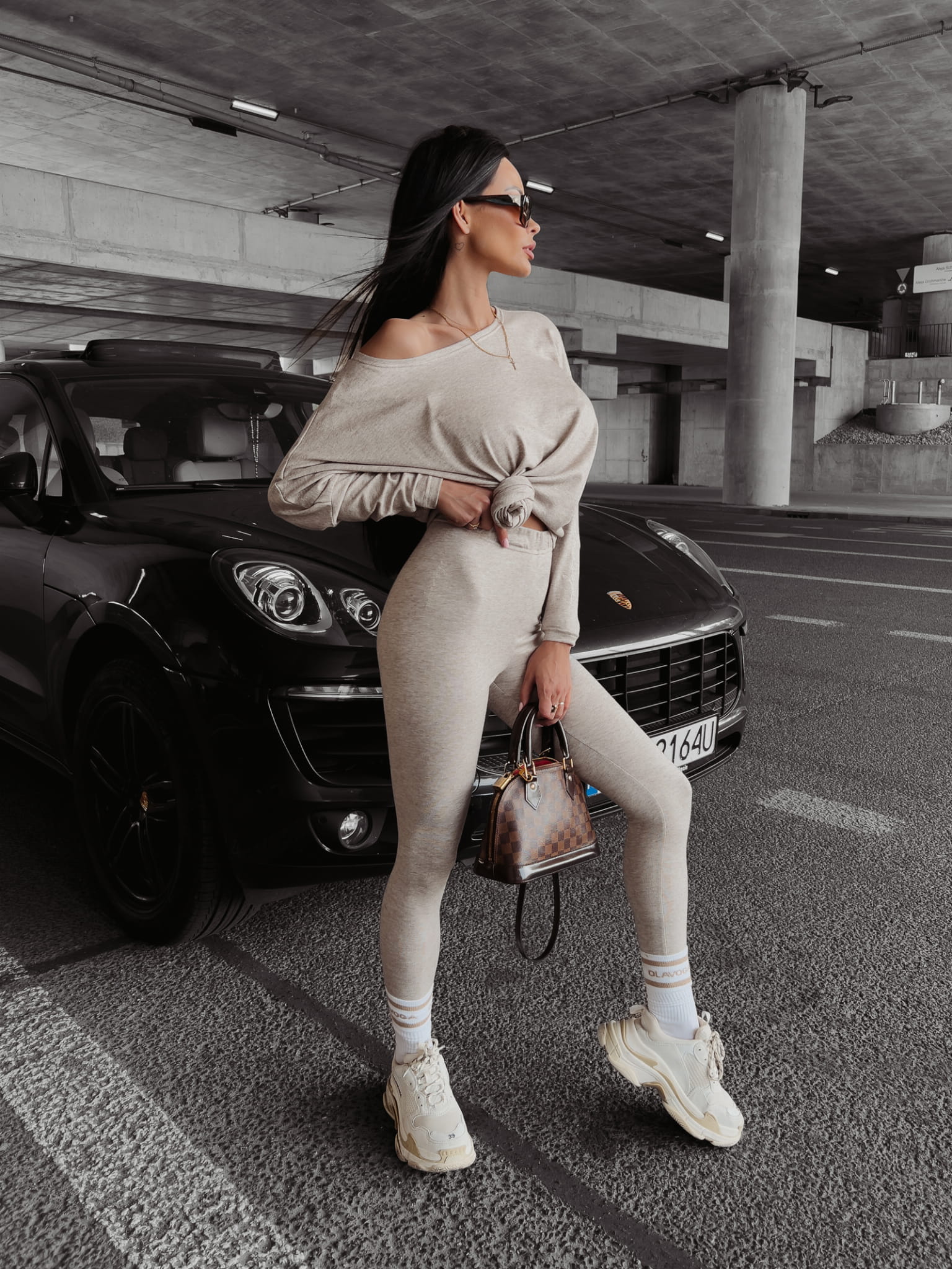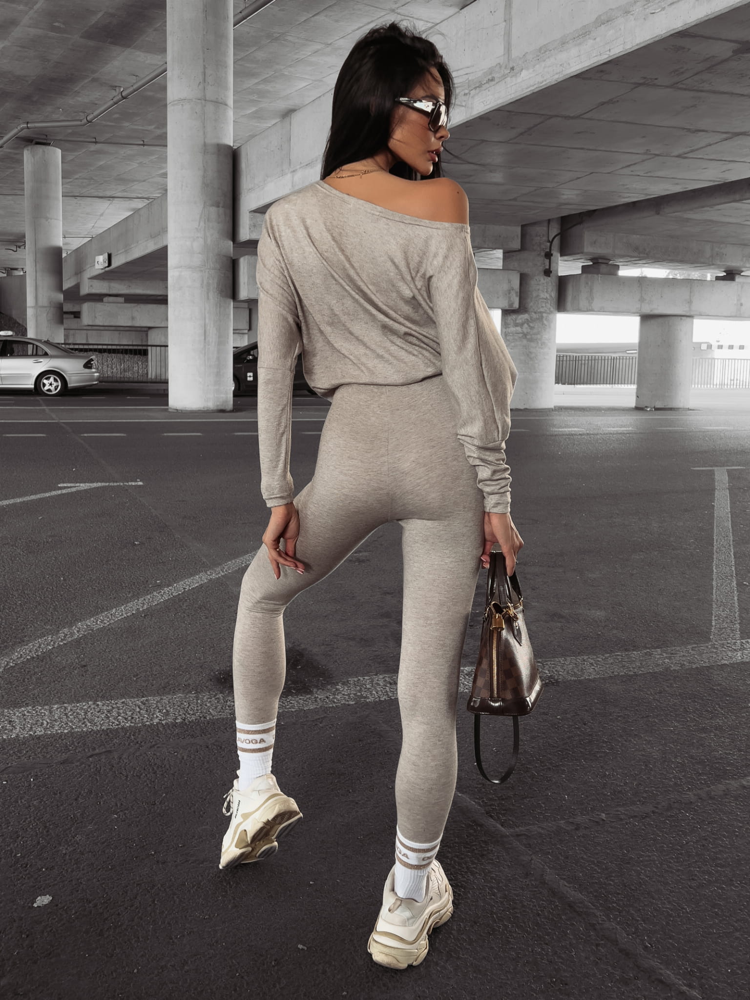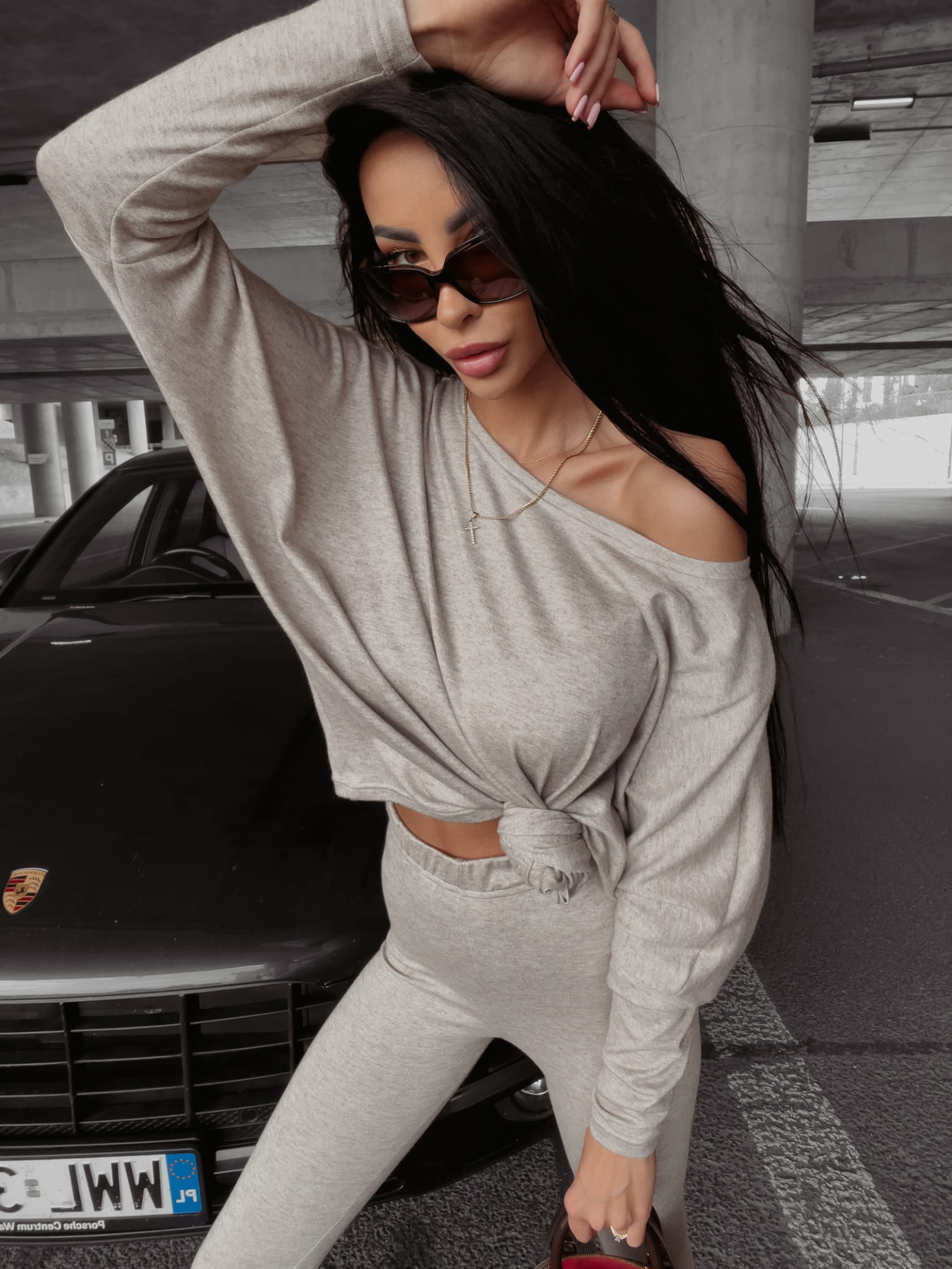Komplet uszyty z miękkiej dzianiny swetrowej, dopasowane legginsy i oversizow’a góra. Obniżona linia ramion, haft z pisanym logo na rękawie.