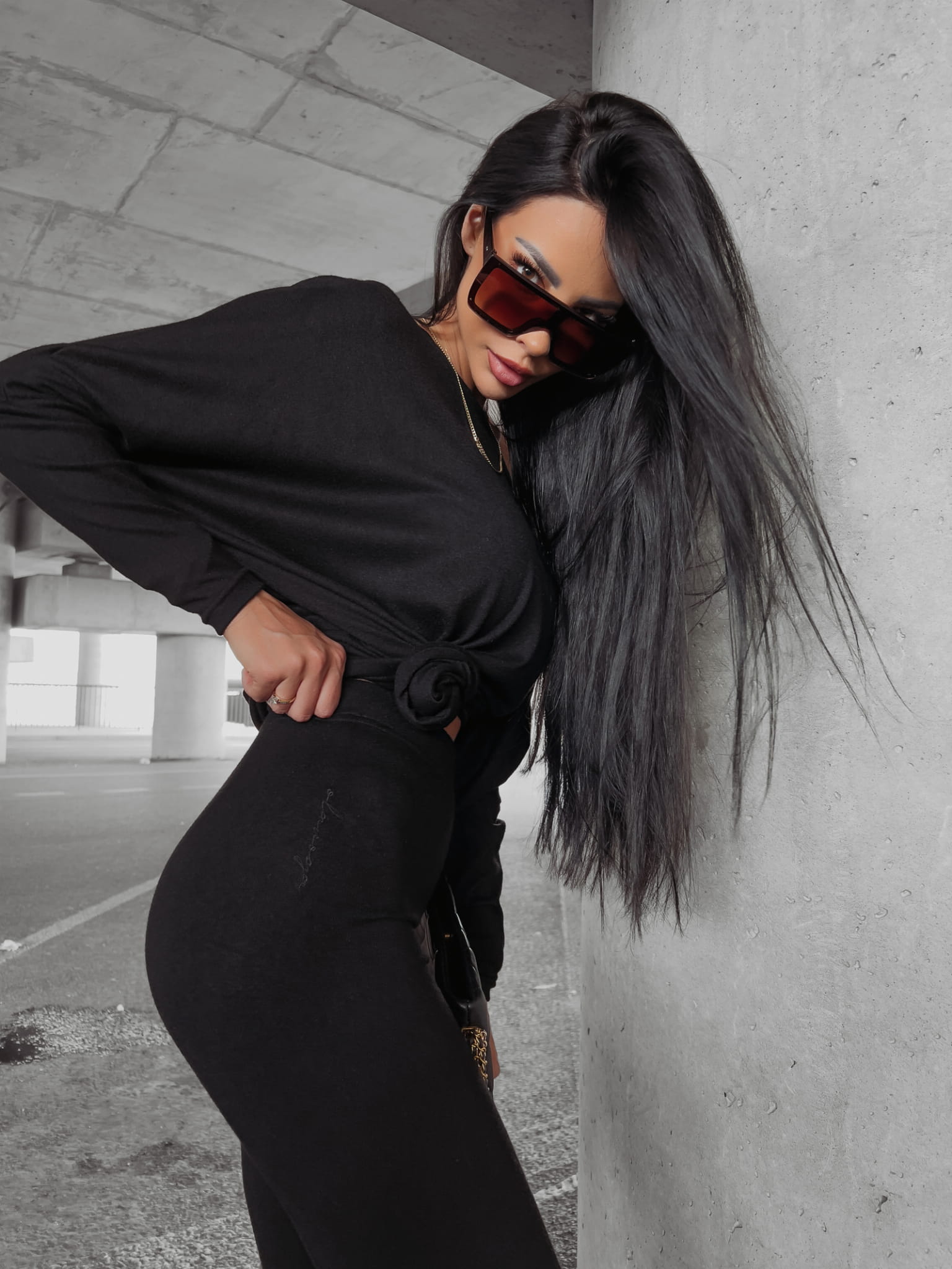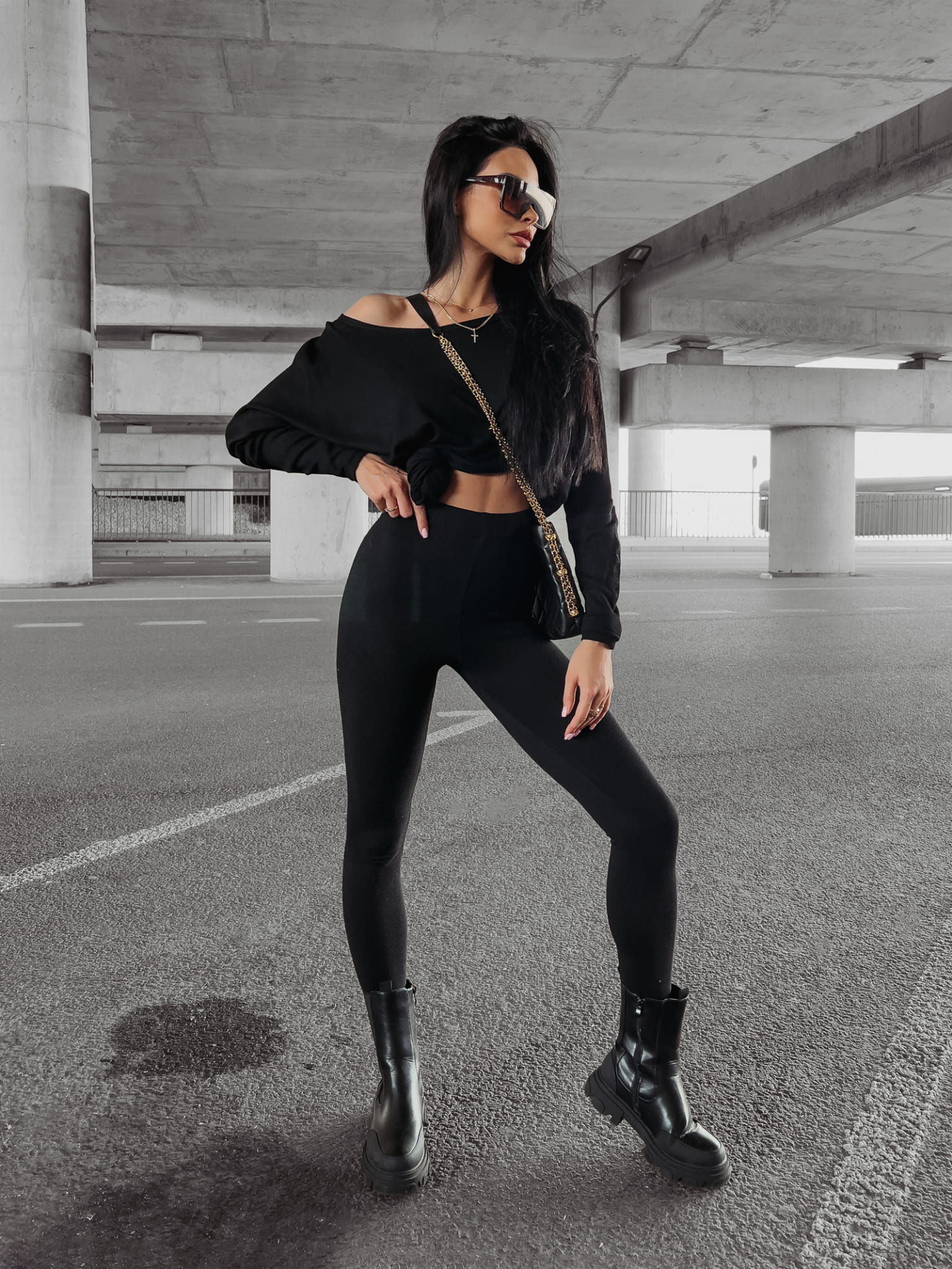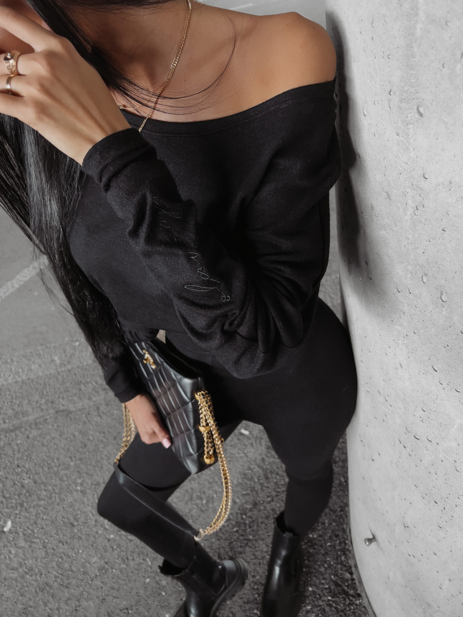 Komplet uszyty z miękkiej dzianiny swetrowej, dopasowane legginsy i oversizow’a góra. Obniżona linia ramion, haft z pisanym logo na rękawie.