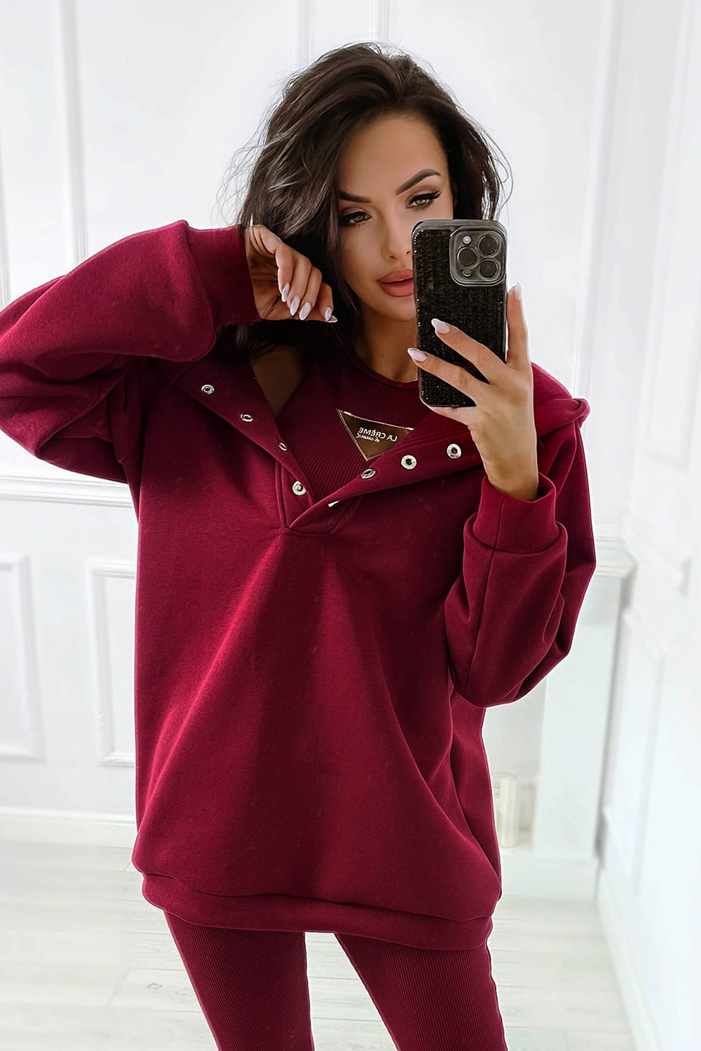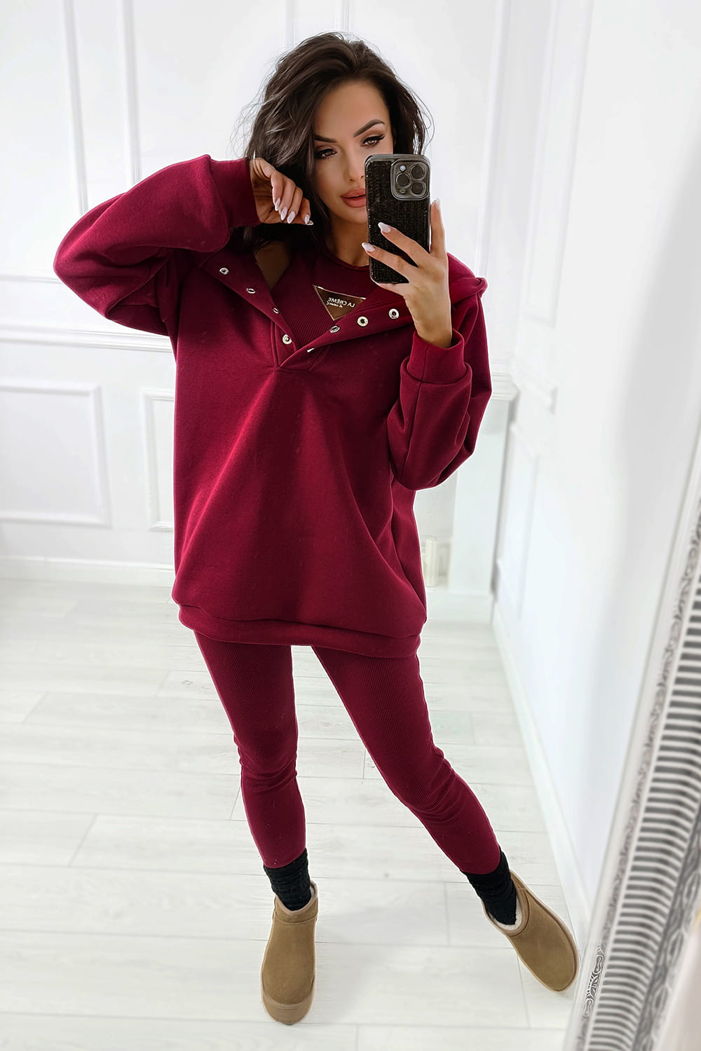 Kompletdresowy, który składa się z Ocieplanej bluzy oversize z napami, oraz prążkowanych legginsów i topu z ozdobną blaszką. Megakomfortowy bawełniany materiał- super baza do sportowychstylizacji!