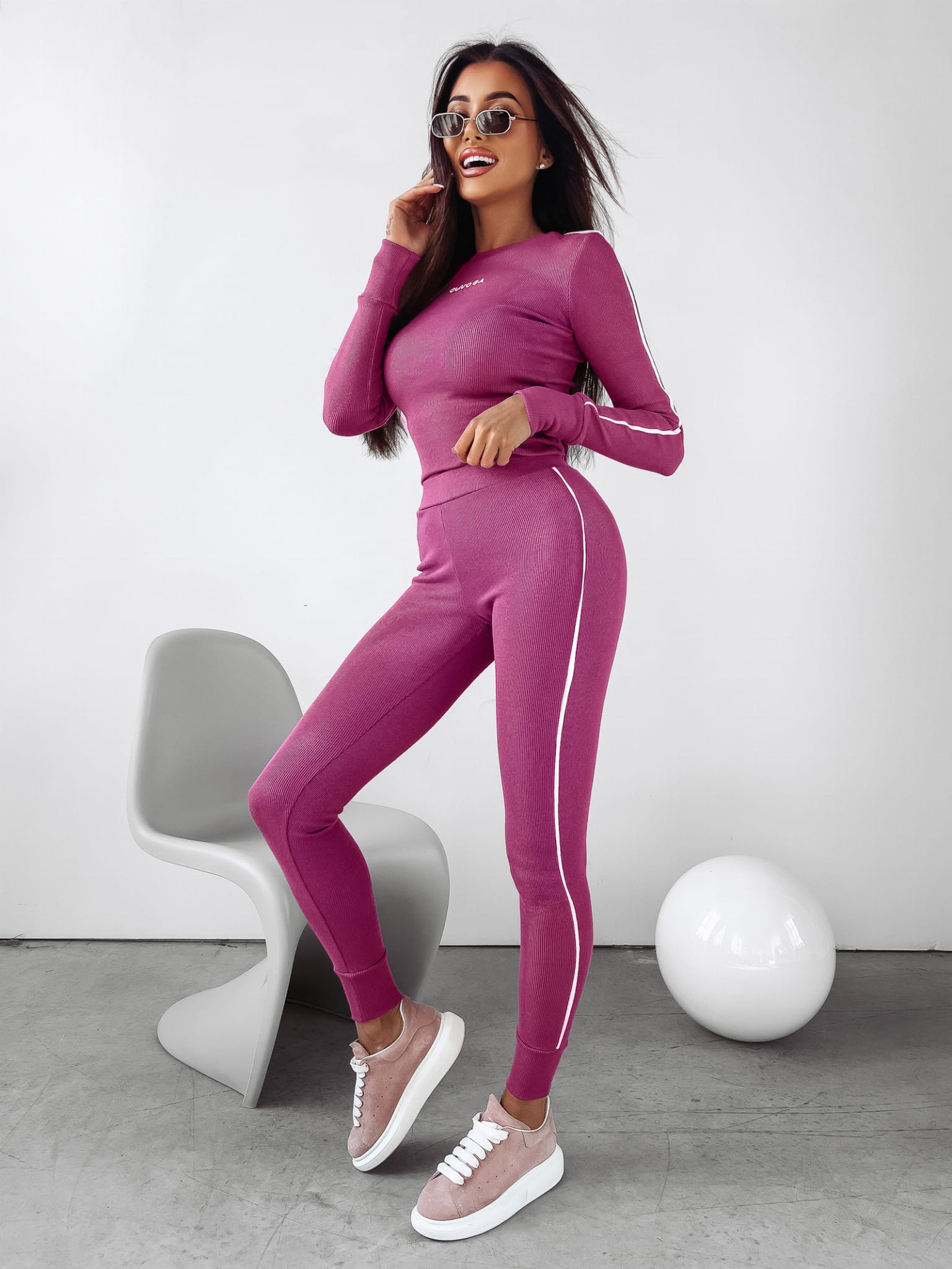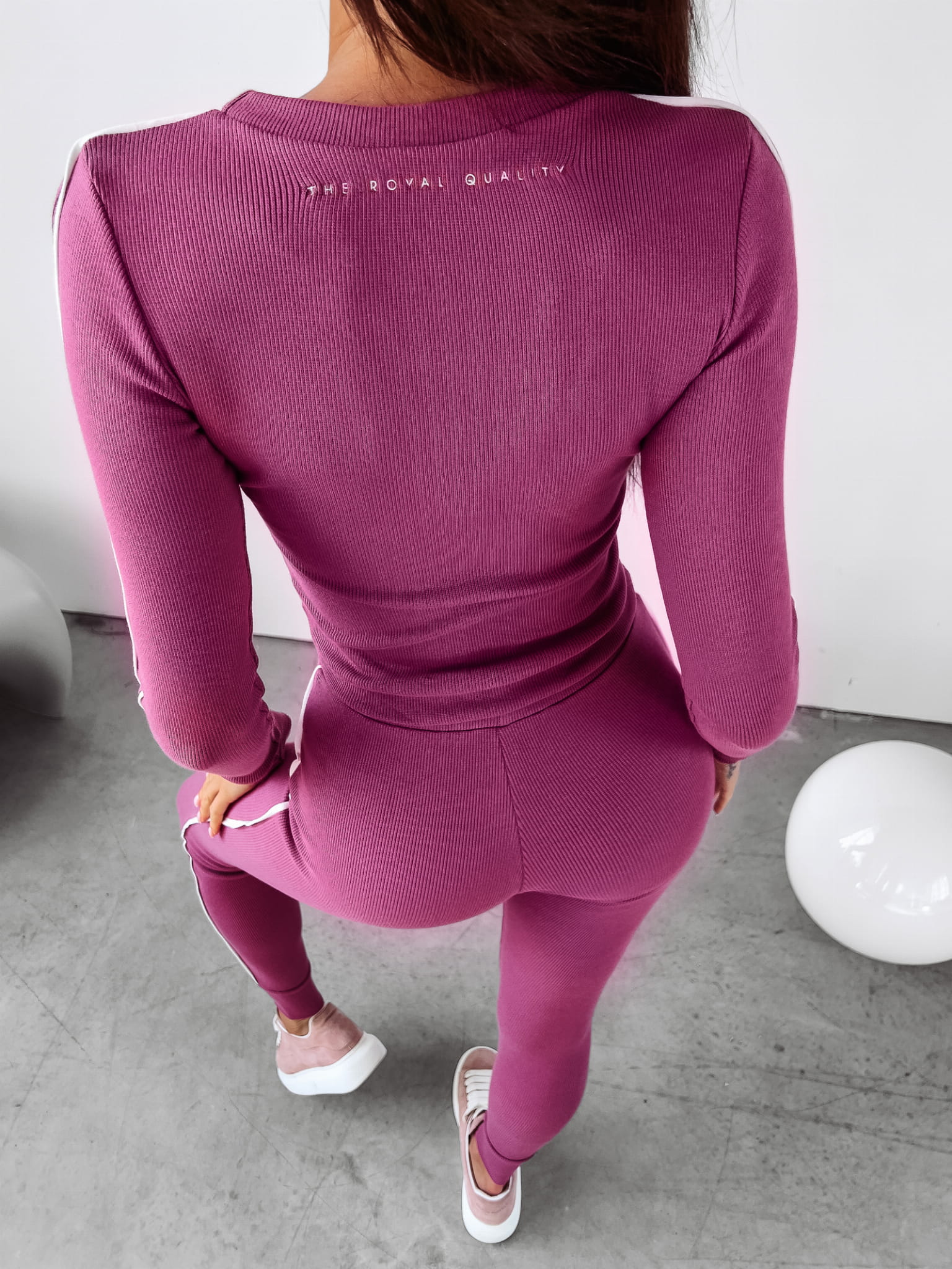 Komplet uszyty z wysokiej jakości materiału prążkowanego. Góra kompletu posiada bluzkę z długim rękawem, na której znajduje się logo marki OLAVOGA. Na brzegach kompletu prążkowany ściągacz. Dół kompletu to spodnie zwężanie ku dołowi. Na gumie minimalistyczne logo marki. Ozdobny lampas naszyty na całości kompletu. Przy kołnierzy haft THE ROYAL QUALITY.