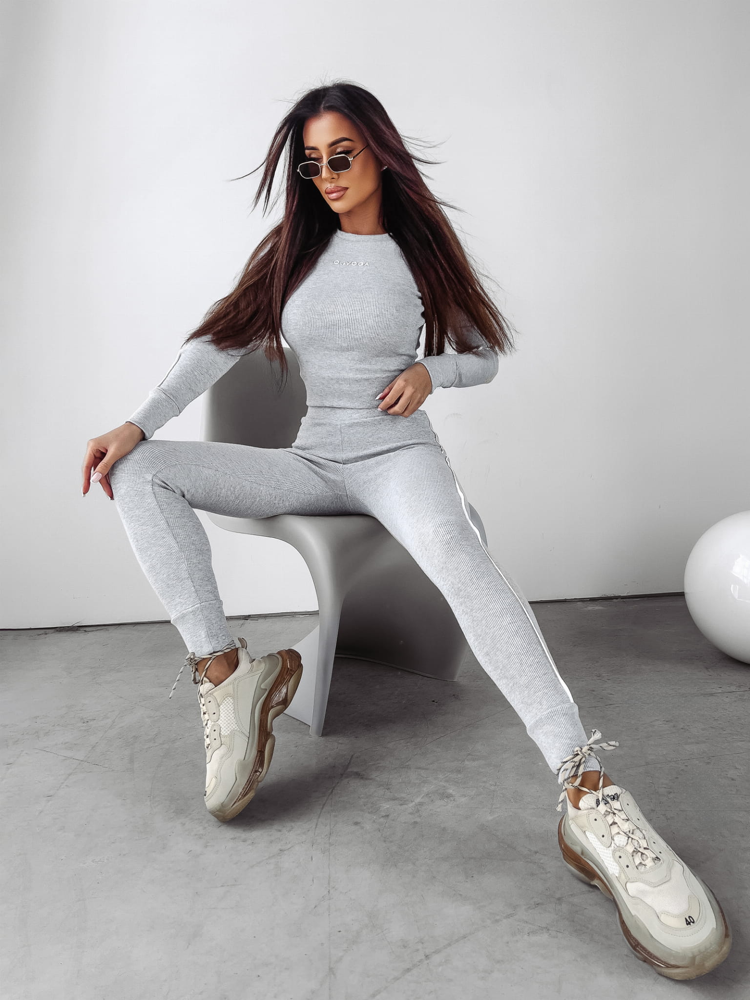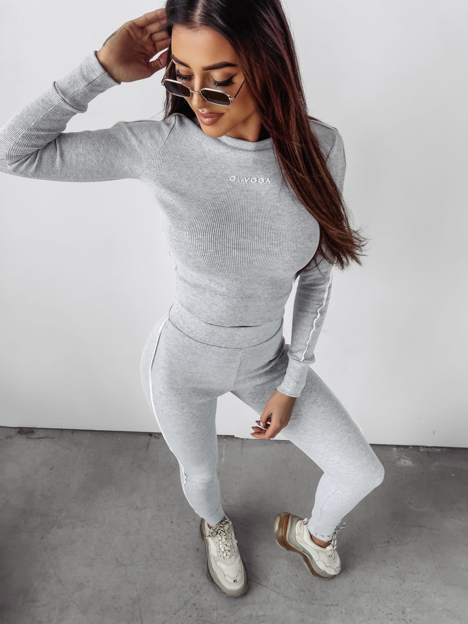 Komplet uszyty z wysokiej jakości materiału prążkowanego. Góra kompletu posiada bluzkę z długim rękawem, na której znajduje się logo marki OLAVOGA. Na brzegach kompletu prążkowany ściągacz. Dół kompletu to spodnie zwężanie ku dołowi. Na gumie minimalistyczne logo marki. Ozdobny lampas naszyty na całości kompletu. Przy kołnierzy haft THE ROYAL QUALITY.