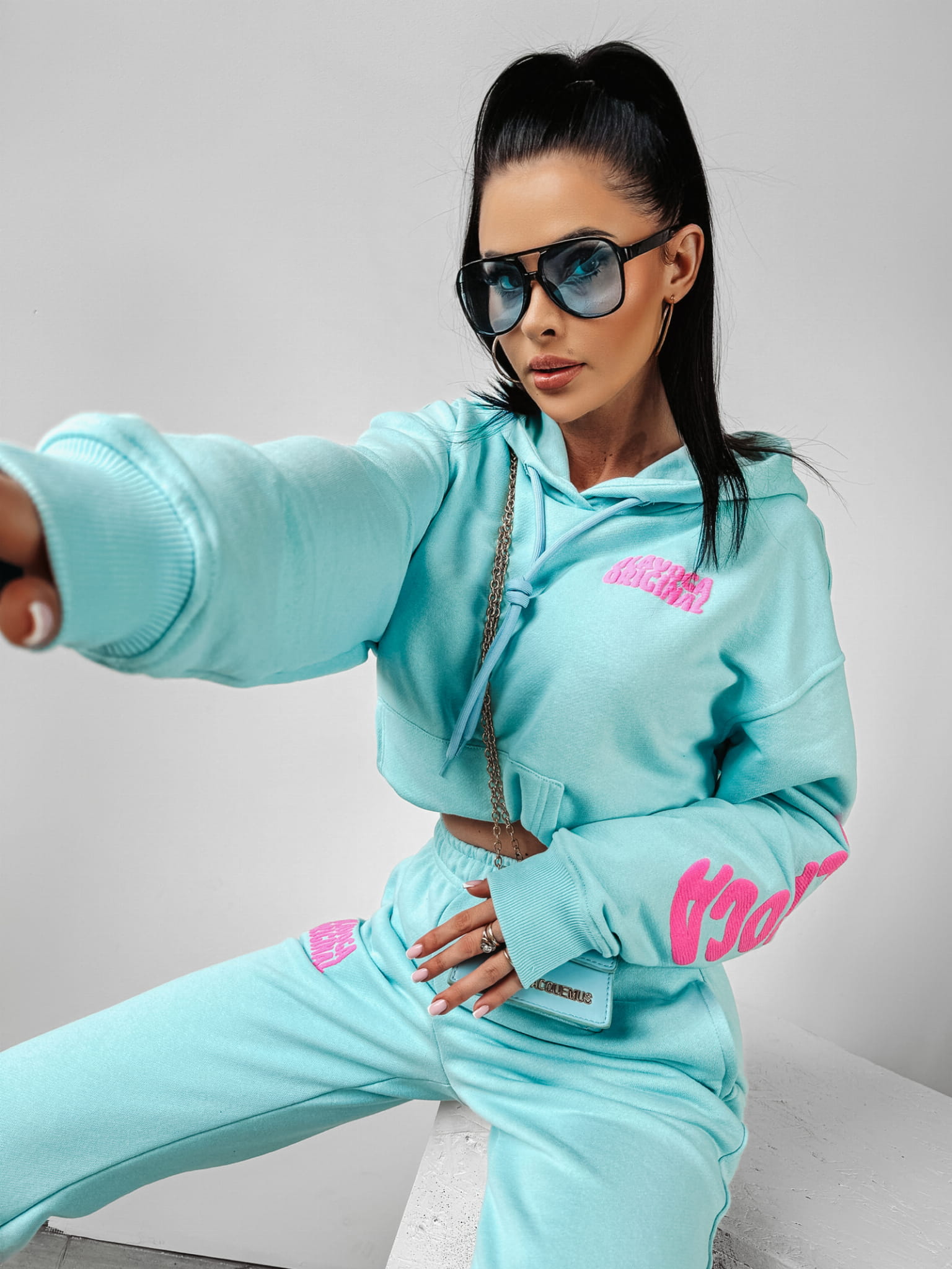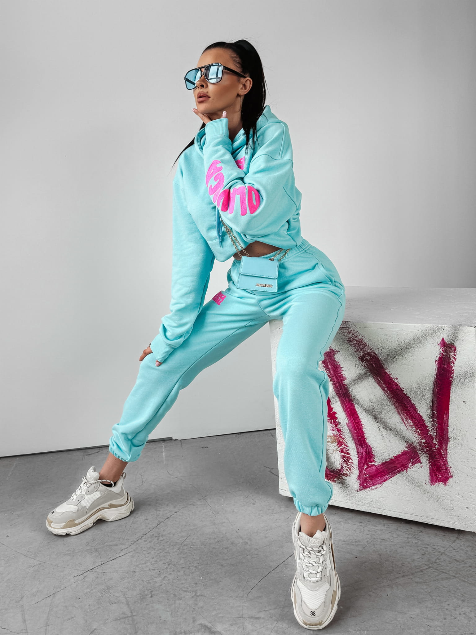 Sportowy komplet wykonany z wysokiej jakości dzianiny dresowej. Brzegi zakończone ściągaczem. Posiada ozdobne logo marki na przodzie kompletu.