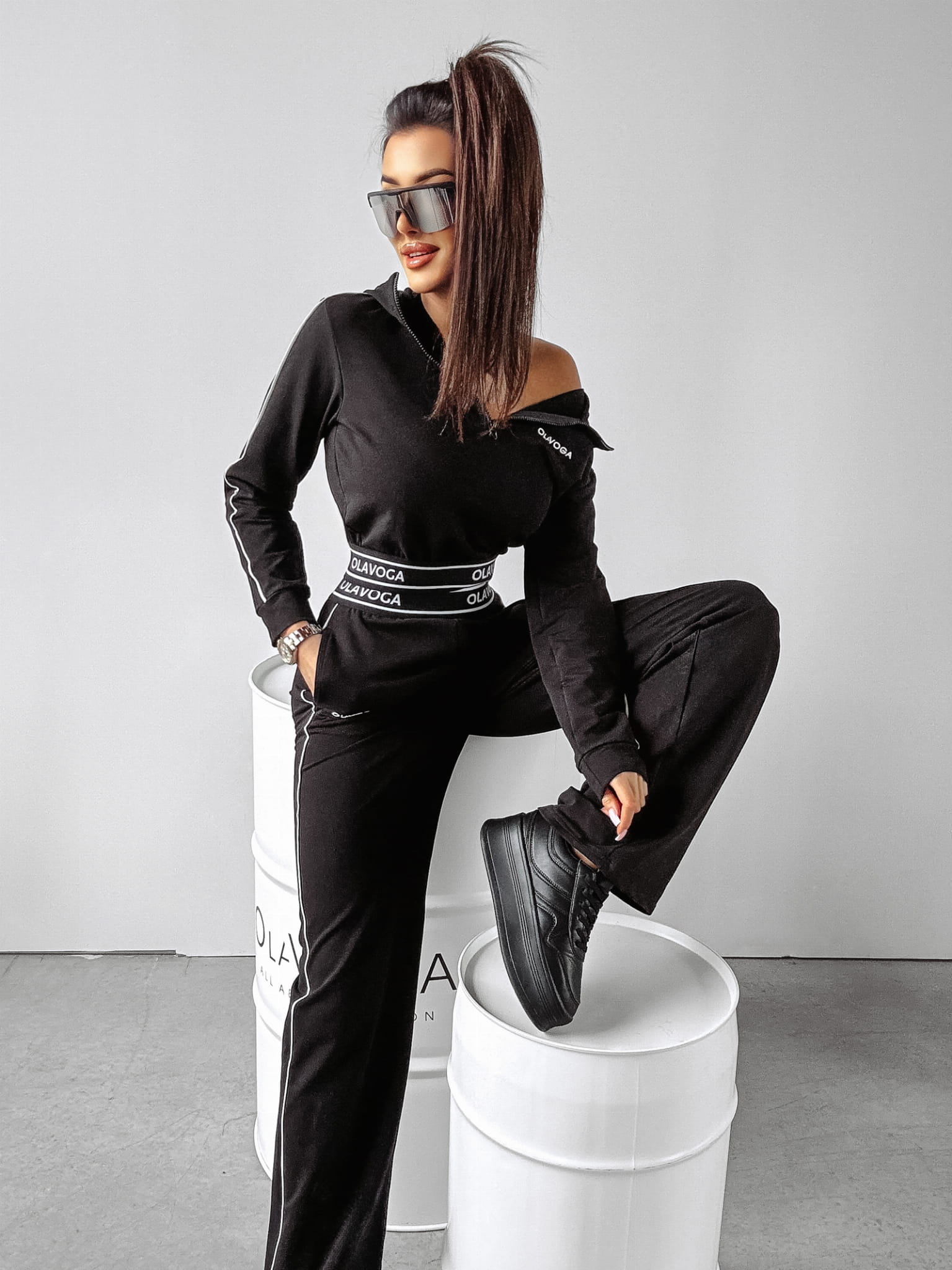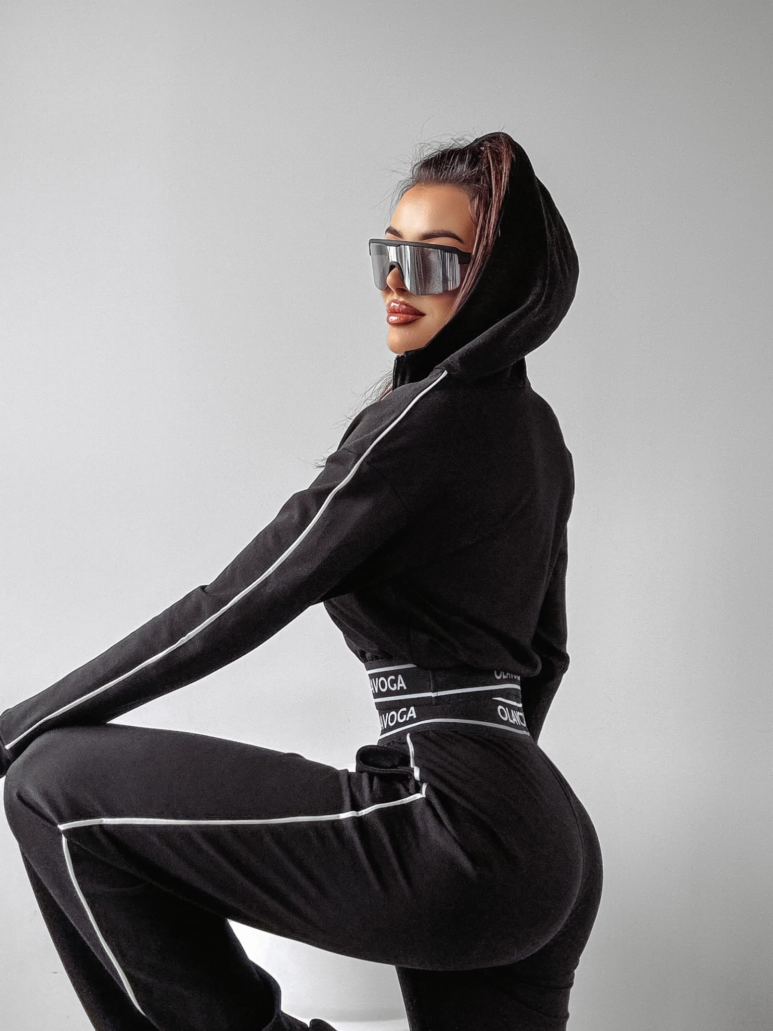 Komplet wykonany z wysokiej jakości materiału bawełnianego. Góra - bluza o krótszym kroju z kapturem, dekolt regulowany poprzez suwak. Dół - spodnie z wysokim stanem o prostym kroju. Produkty posiadają logowaną gumę. Na przodzie logo marki OLAVOGA.