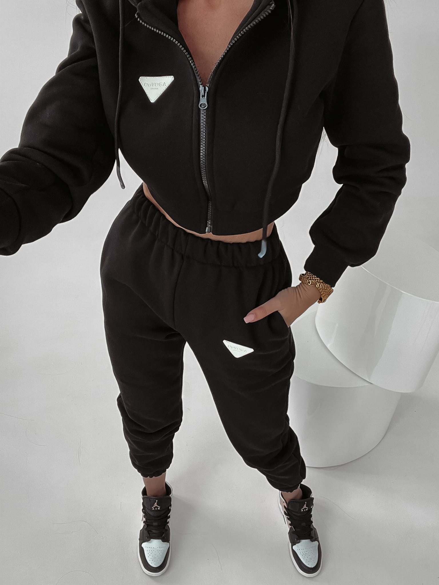 Dresowy, niezwykle wygodny komplet składający się z rozpinanej bluzy z kapturem i klasycznych, dresowych spodni. Na przodzie, zarówno na bluzie, jak i na spodniach złota metalowa naszywka z logo. Komplet idealny na rower, rolki czy wiosenny spacer.