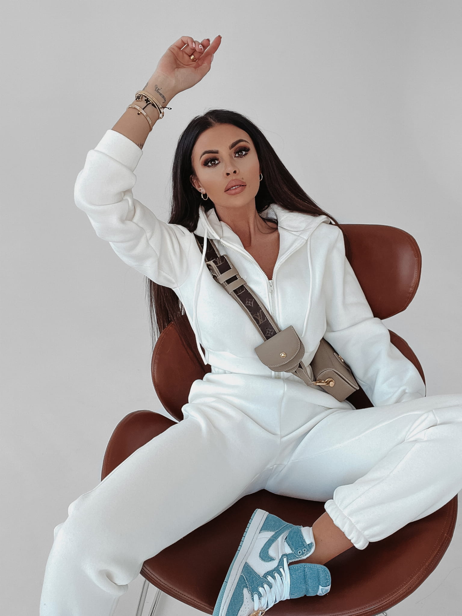 Dresowy, niezwykle wygodny komplet składający się z rozpinanej bluzy z kapturem i klasycznych, dresowych spodni. Na przodzie, zarówno na bluzie, jak i na spodniach złota metalowa naszywka z logo. Komplet idealny na rower, rolki czy wiosenny spacer.