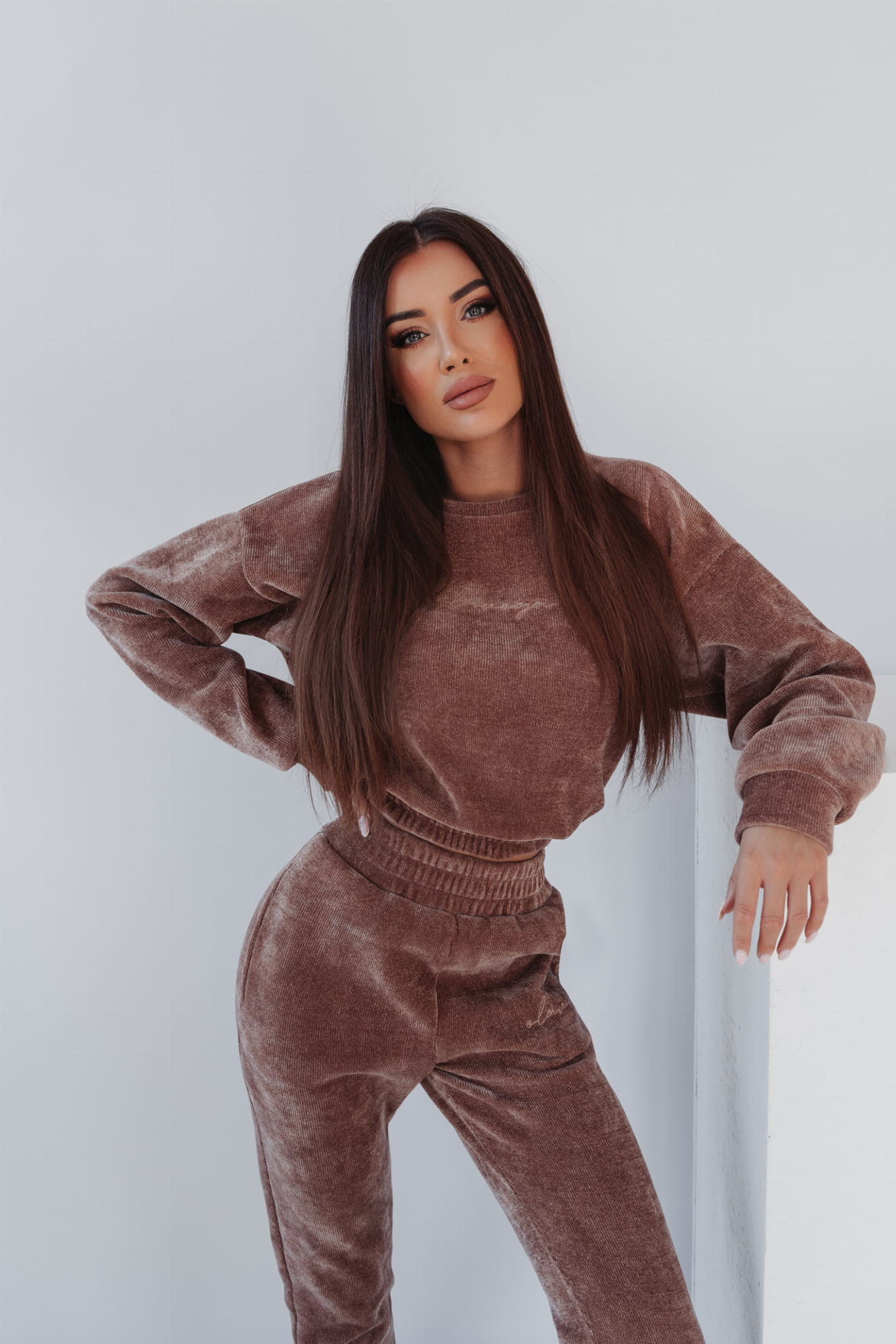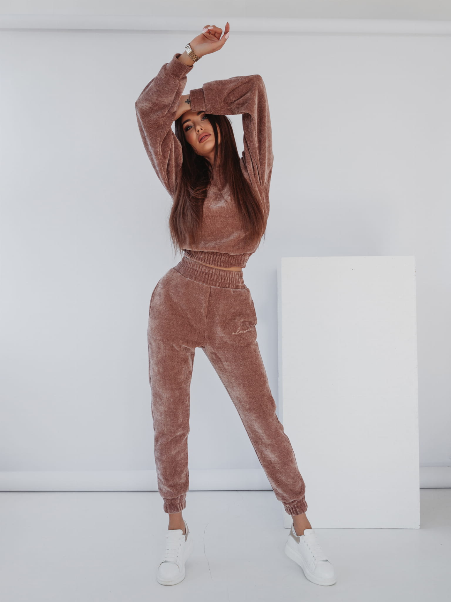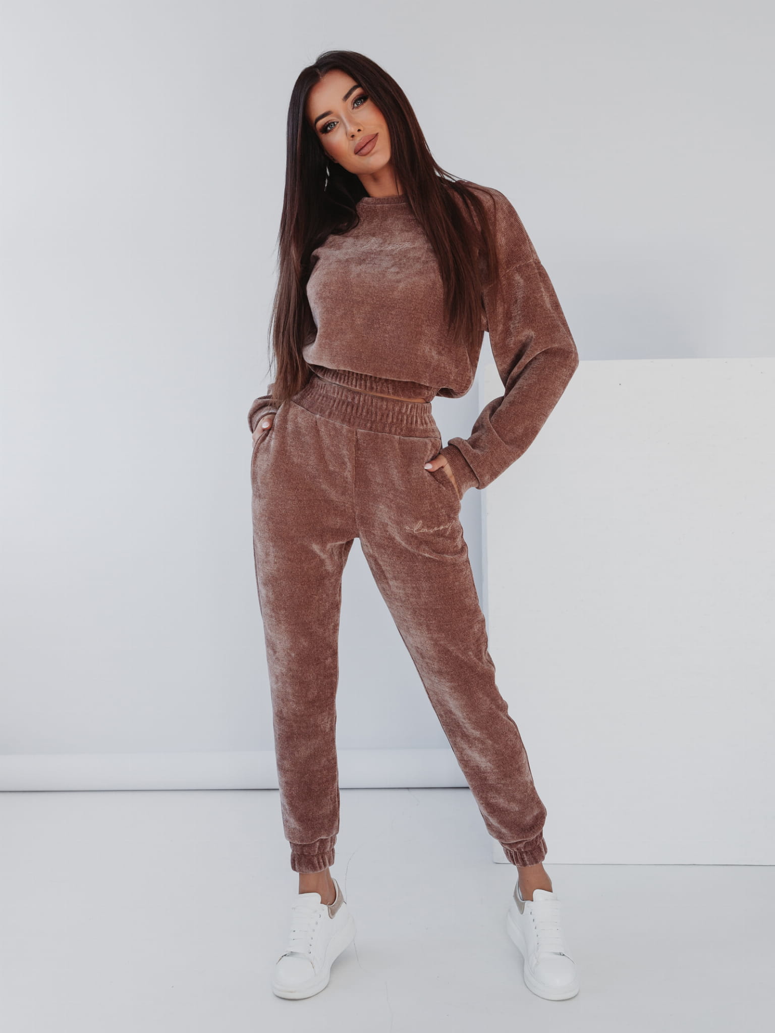 Komplet damski „HONEY” wykonany z niespotykanego materiału, z haftem na bluzie i nogawce. Model, który zadowoli najbardziej wymagających, stworzony dla miłośników nietuzinkowych rozwiązań w modzie.