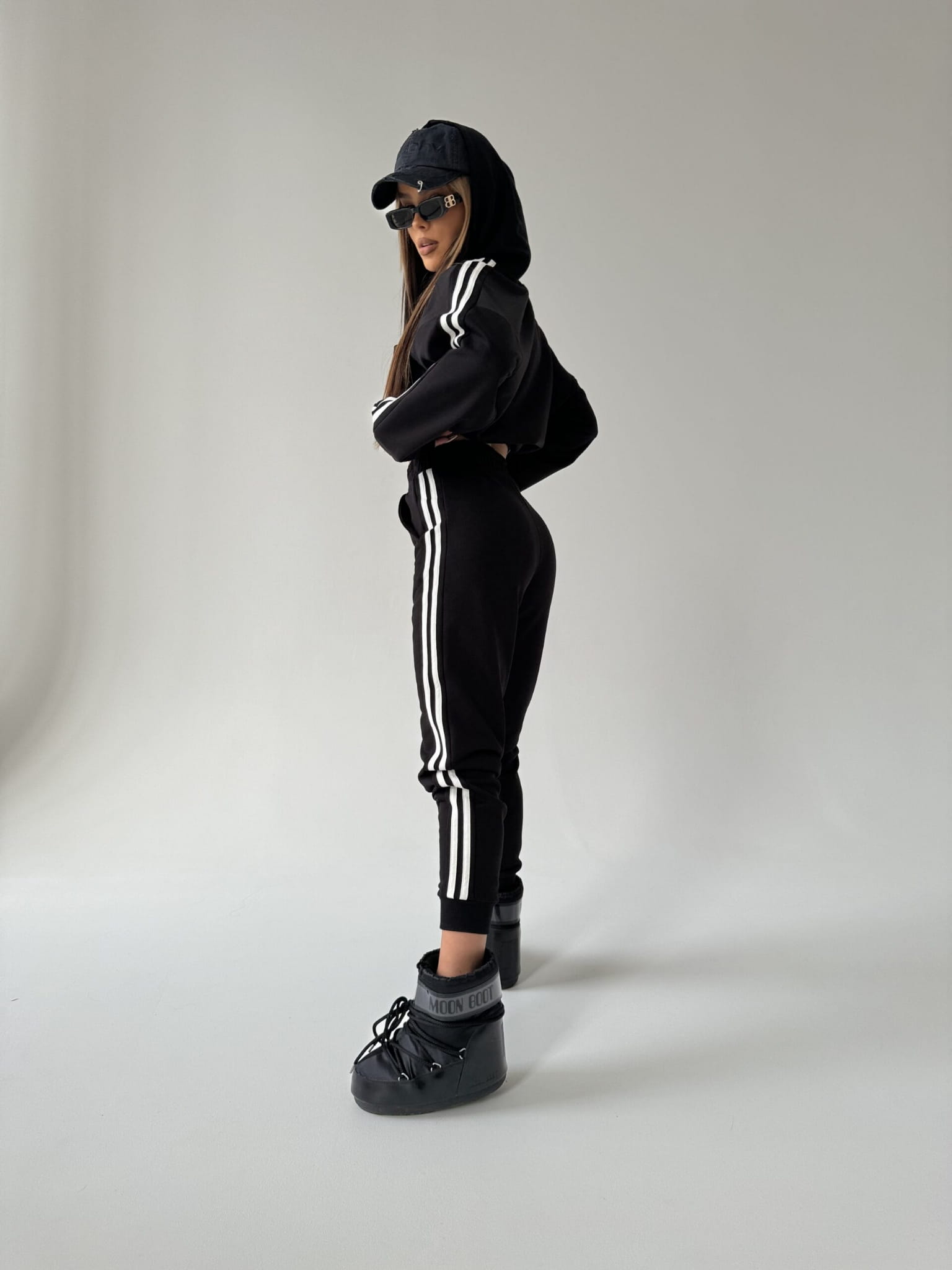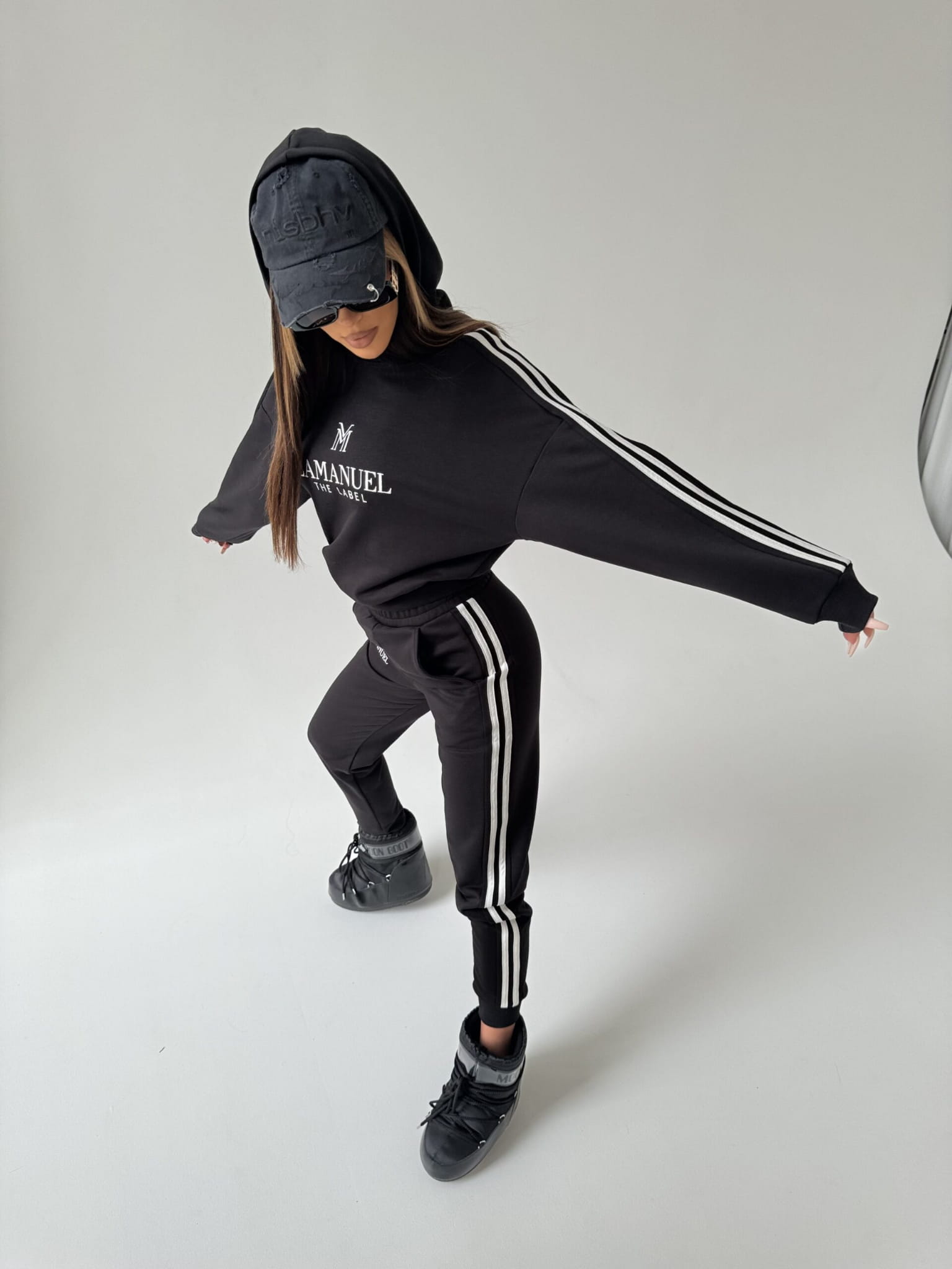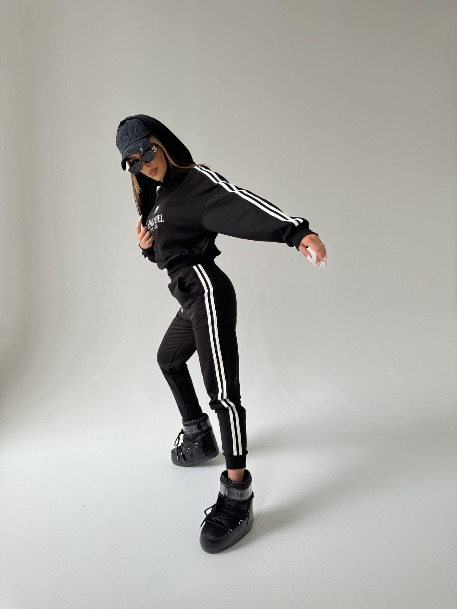 Odkryj nowy wymiar stylu z naszym niepowtarzalnym kompletu damskim, stworzonym z myślą o współczesnych trendach i niepowtarzalnym designie. Komplet składa się z bluzy z kapturem oraz spodni z podwyższonym stanem z gumą w pasie.. Wykonana z wysokiej jakości miękkiego materiału, bluza damska prezentuje się nie tylko stylowo, ale również zapewnia wyjątkowy komfort noszenia. Zarówno spodnie jak i bluzę zdobią białe lampasy po bokach, nadając całemu zestawowi dynamicznego charakteru. Wykonany z wysokiej jakości miękkiego materiału. Nasza definicja komfortu na co dzień!