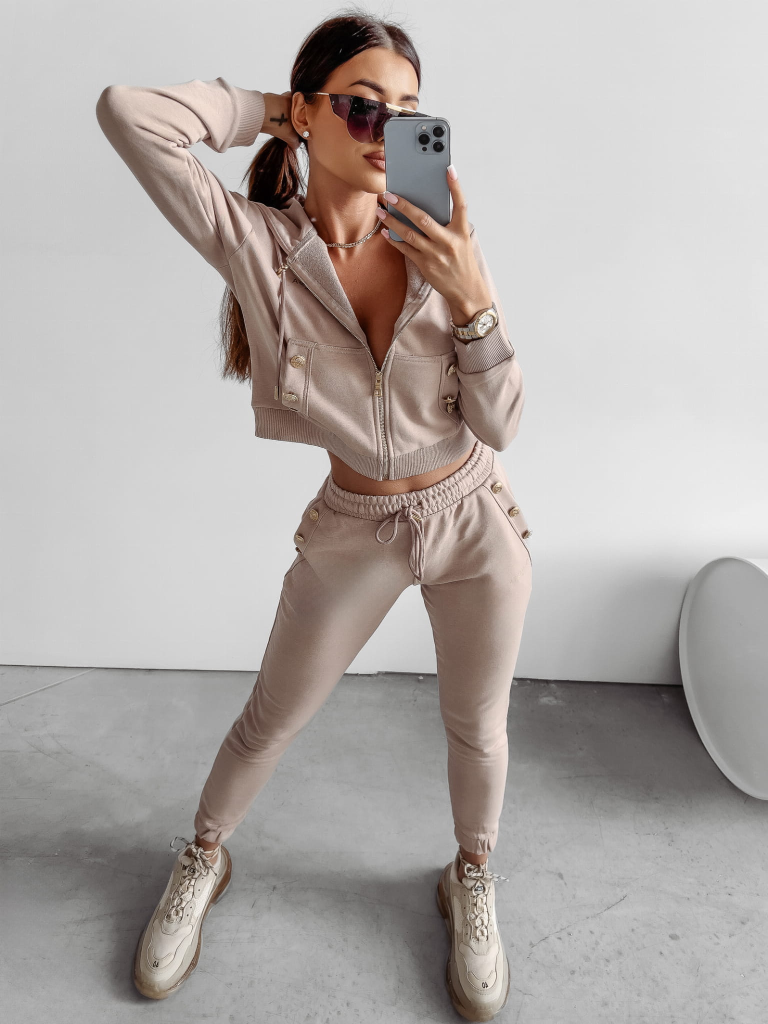 Sportowy komplet uszyty z wysokiej jakości dzianiny dresowej. Na brzegach posiada prążkowane ściągacze. Rozpinana bluza z kapturem. Na kieszeniach kompletu guziki. Na przodzie znajduje się minimalistyczne logo marki