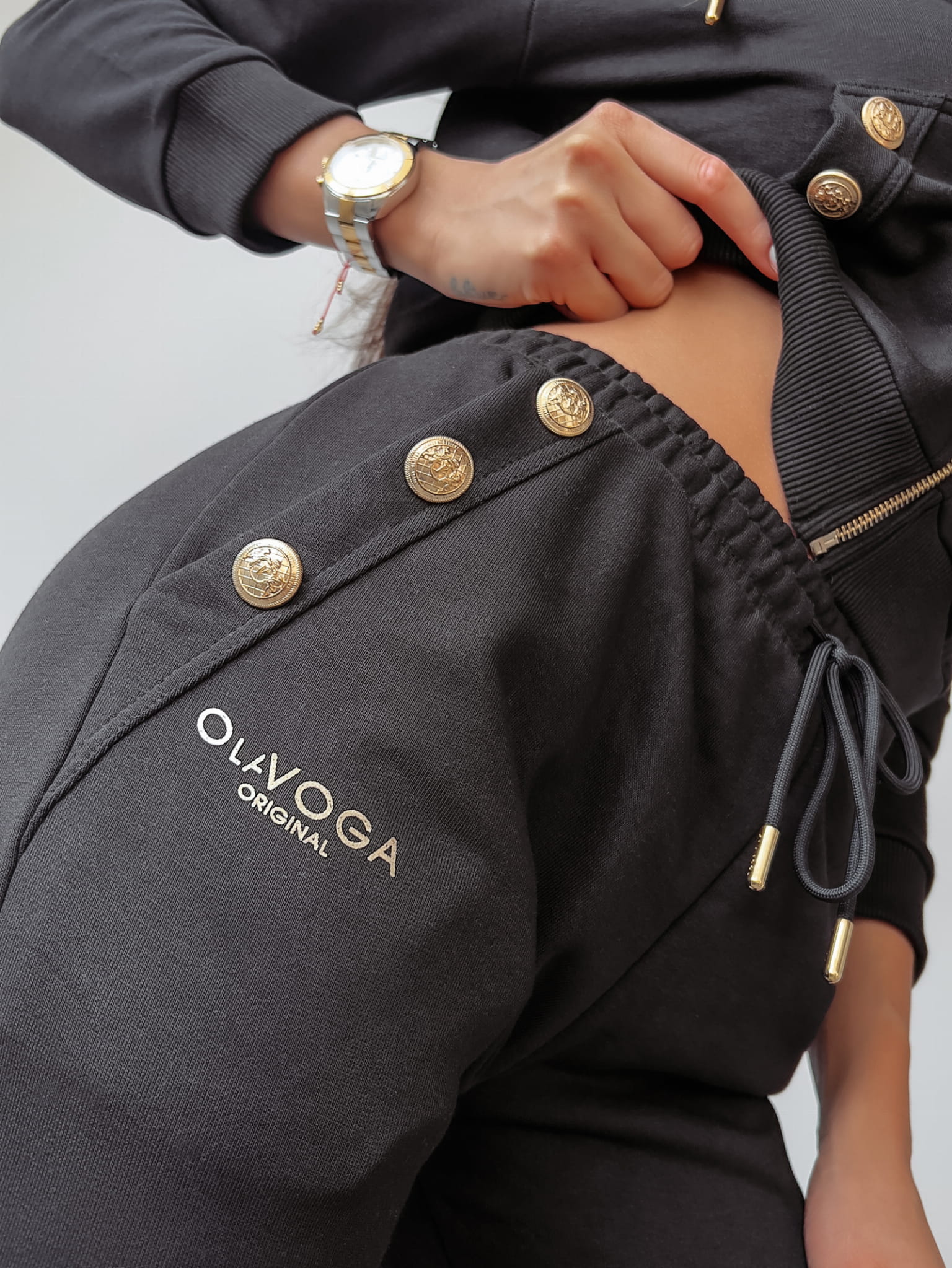 Sportowy komplet uszyty z wysokiej jakości dzianiny dresowej. Na brzegach posiada prążkowane ściągacze. Rozpinana bluza z kapturem. Na kieszeniach kompletu guziki. Na przodzie znajduje się minimalistyczne logo marki