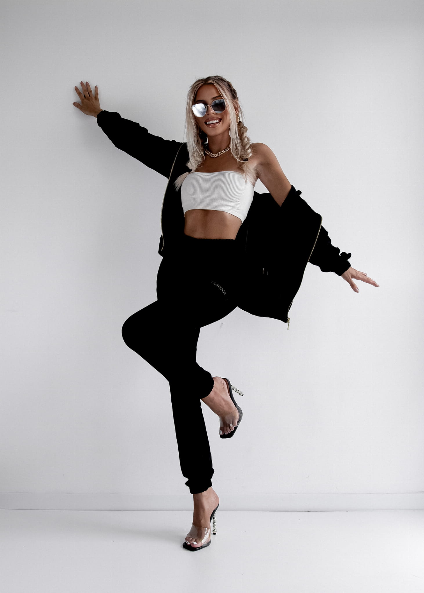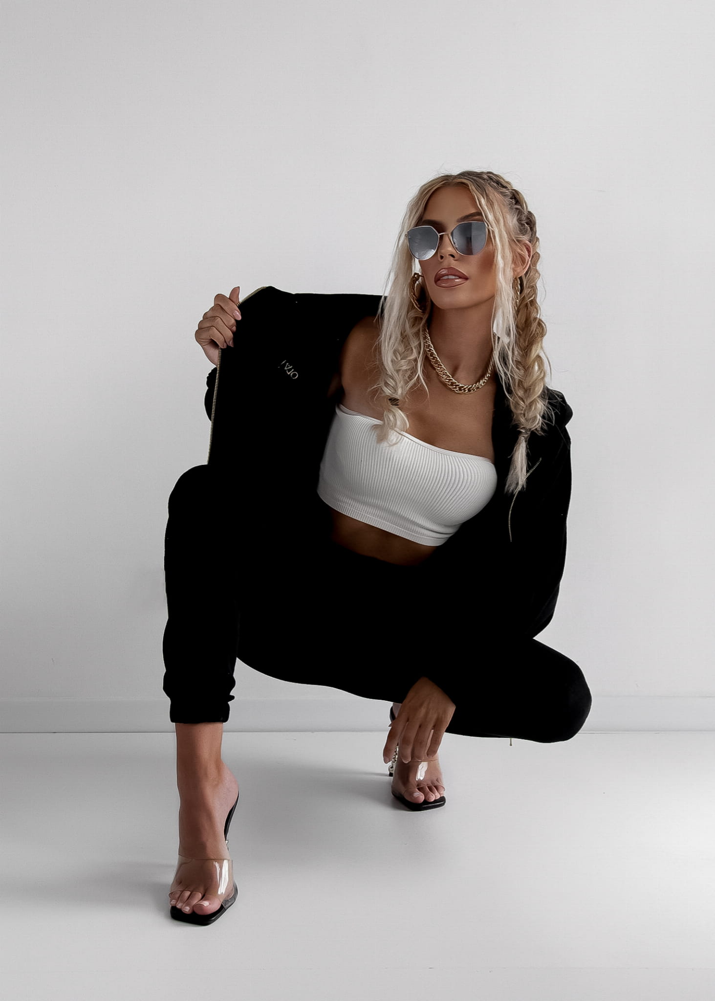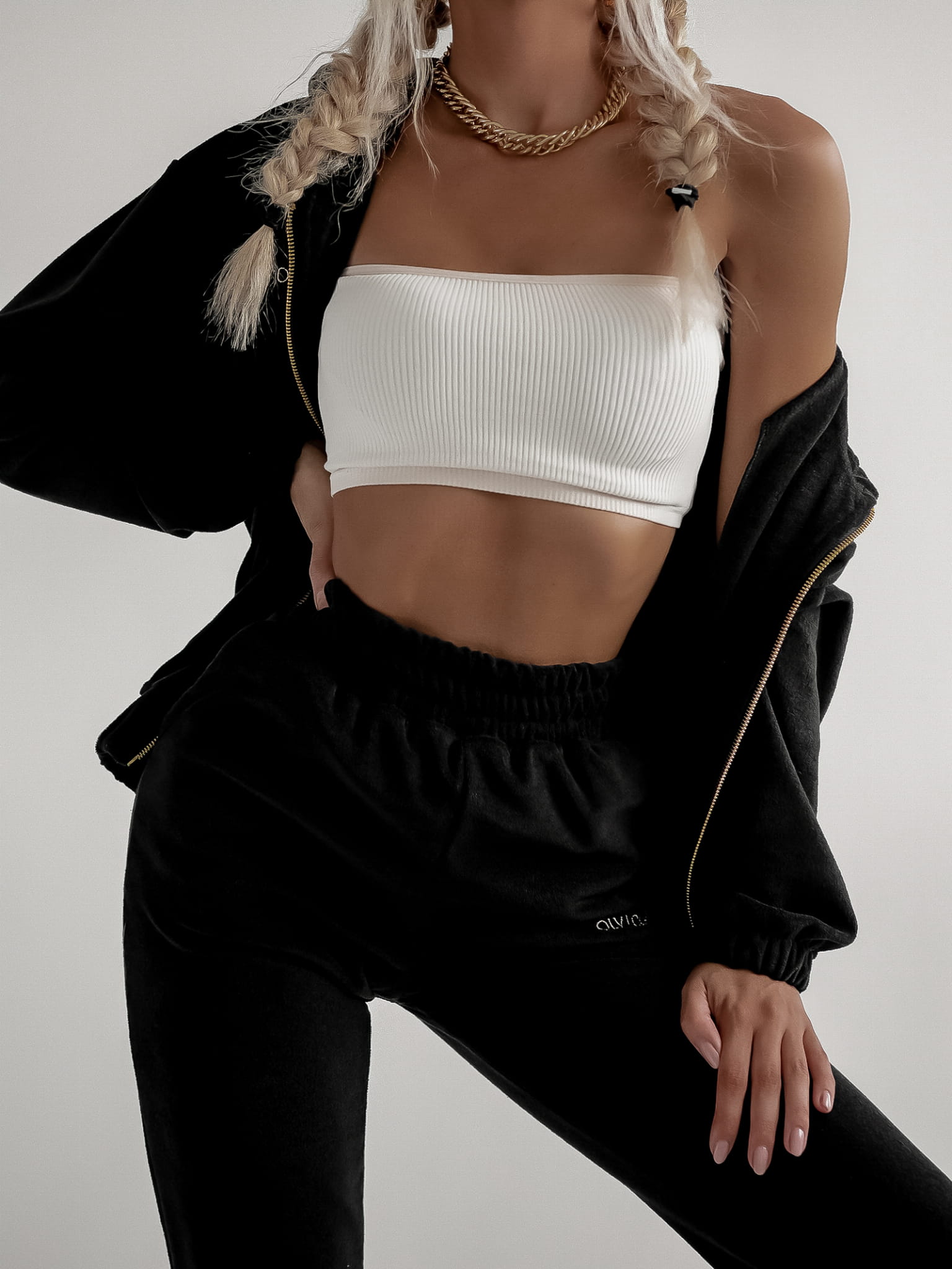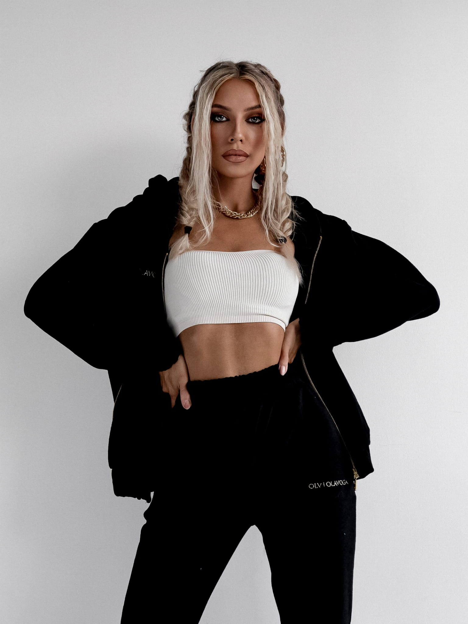 Komplet damski Janet, został wykonany z materiału bawełnianego typu frota. Bluza z kapturem i ściągaczem na rękawach i pasie. Klasyczne spodnie dresowe z kieszeniami i minimalistycznym haftem na nogawce. Identyczny zestaw zaprojektowany został również dla twojego partnera.