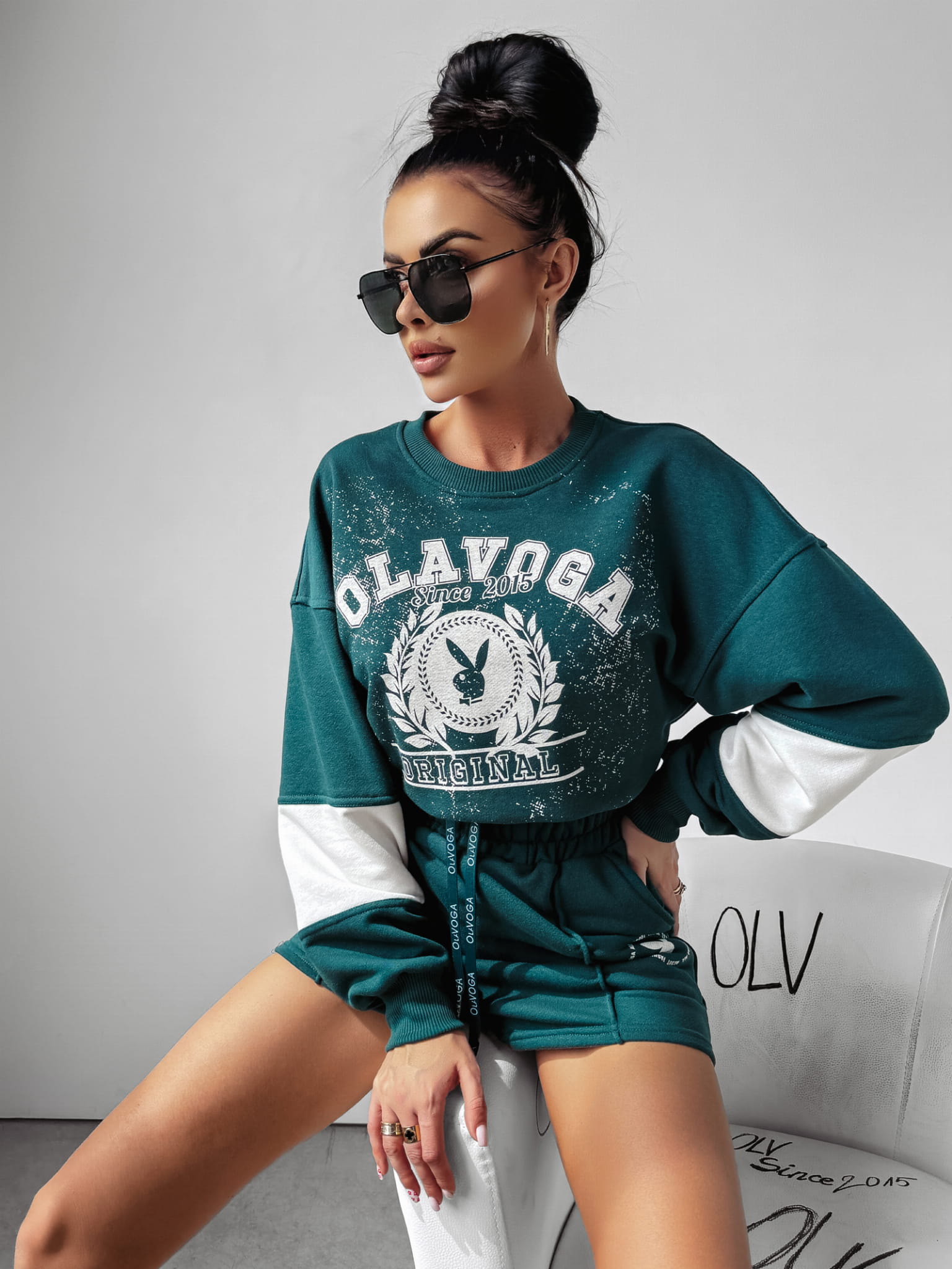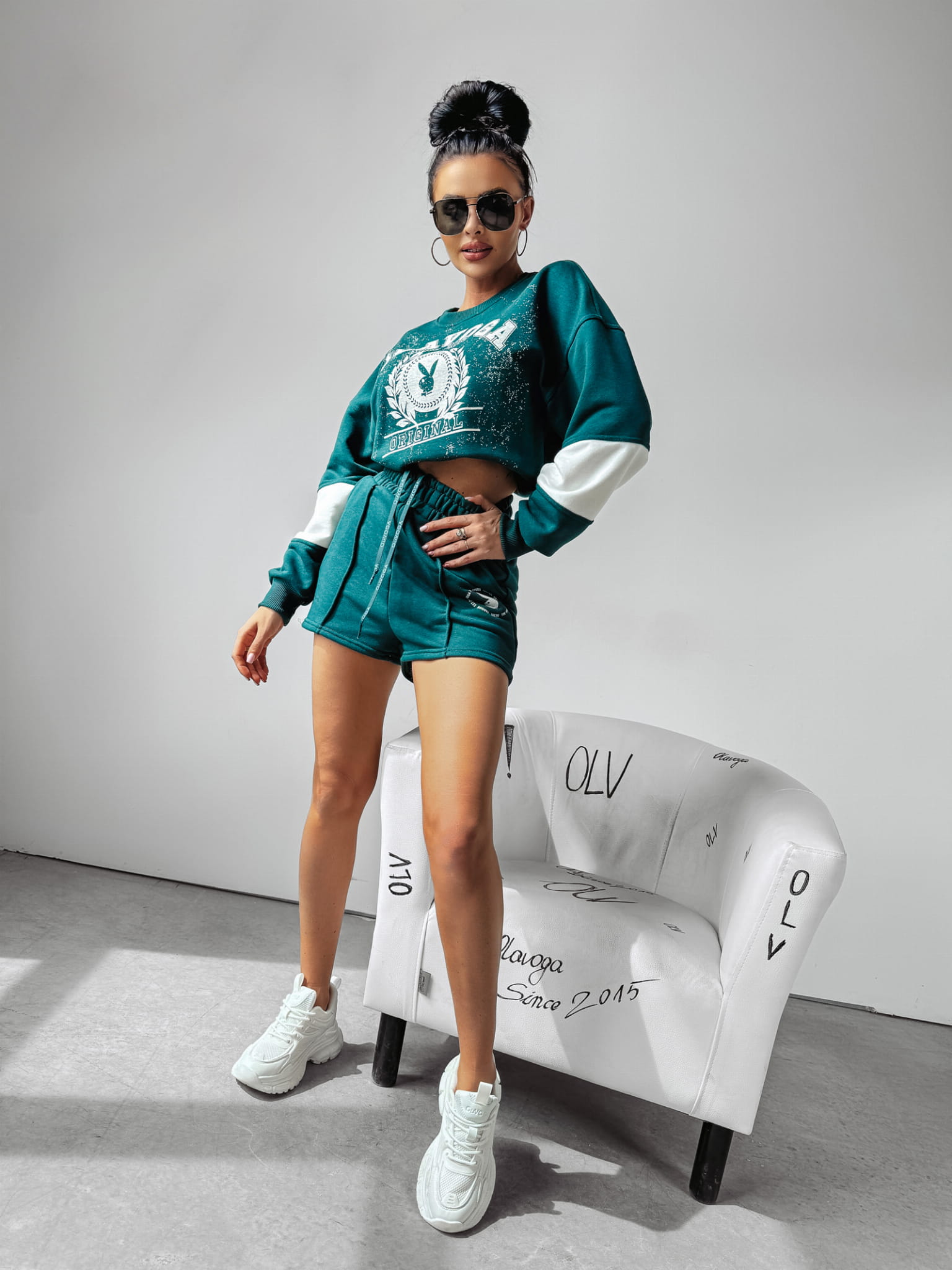 Komplet wykonany z wysokiej jakości materiału bawełnianego. Góra - bluza typu crewneck z ciekawym printem - króliczek. Obszerne logo marki na przodzie. Na rękawach znajduje się przeszycie. Dół - sportowe krótkie spodnki. Regulacja poprzez logowane sznurki. Produkt posiada modne w tym sezonie przeszycia. Po bokach kieszenie.