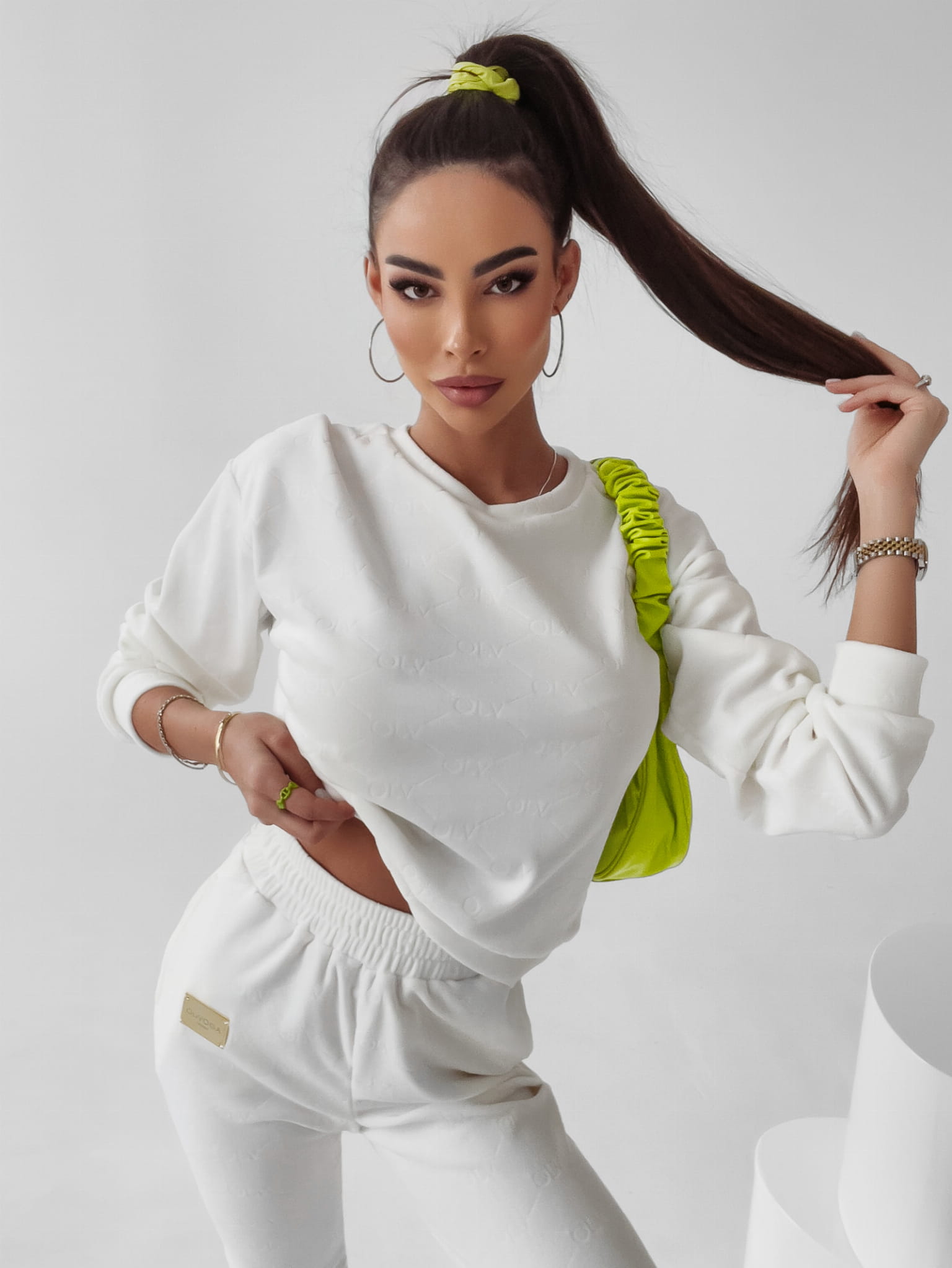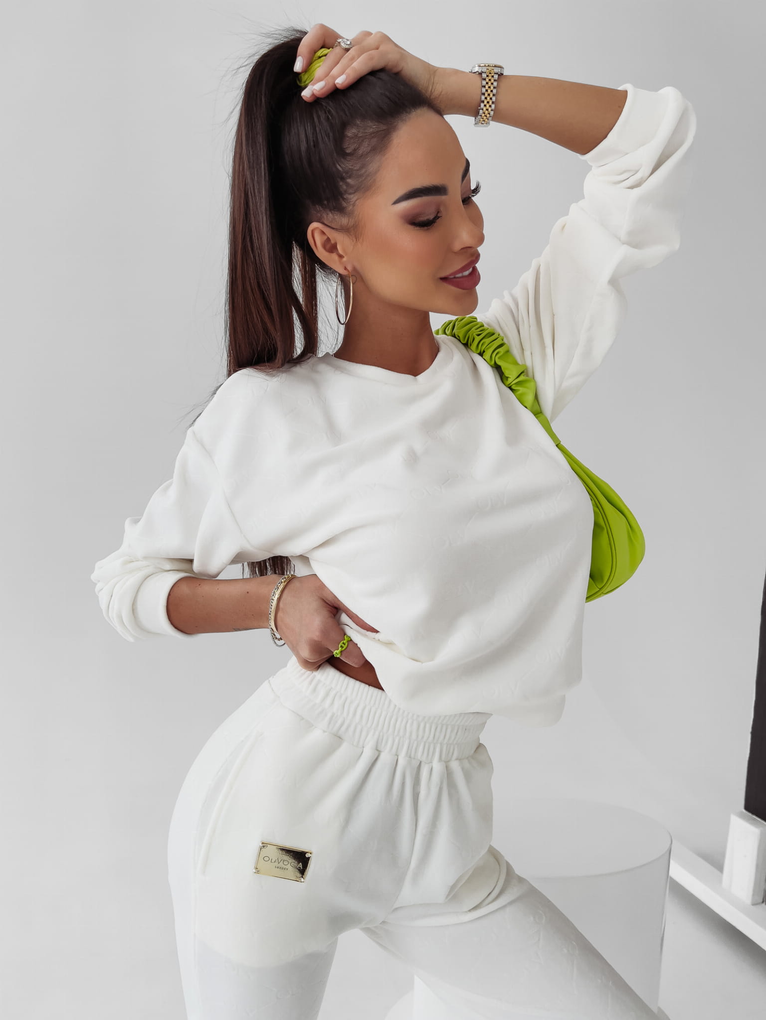 Casualowy, logowany komplet z miękkiego, przyjemnego w dotyku weluru. Luźny fason bluzy, rękawy i nogawki zakończone ściągaczem. Na górze nogawki złota, ozdobna naszywka z logo OLV. Komplet idealny na rower, wiosenny spacer czy leniwą niedzielę na kanapie.