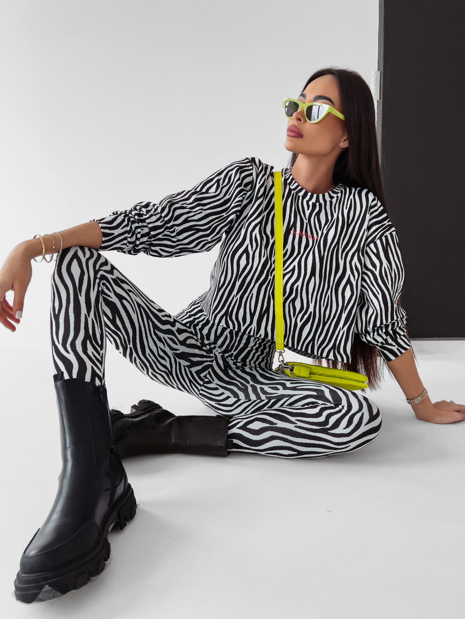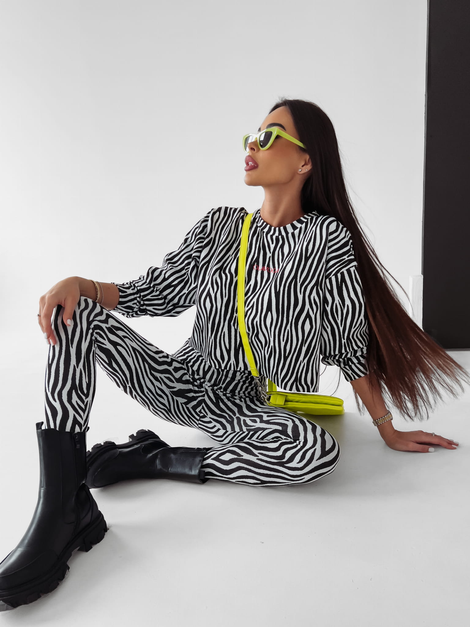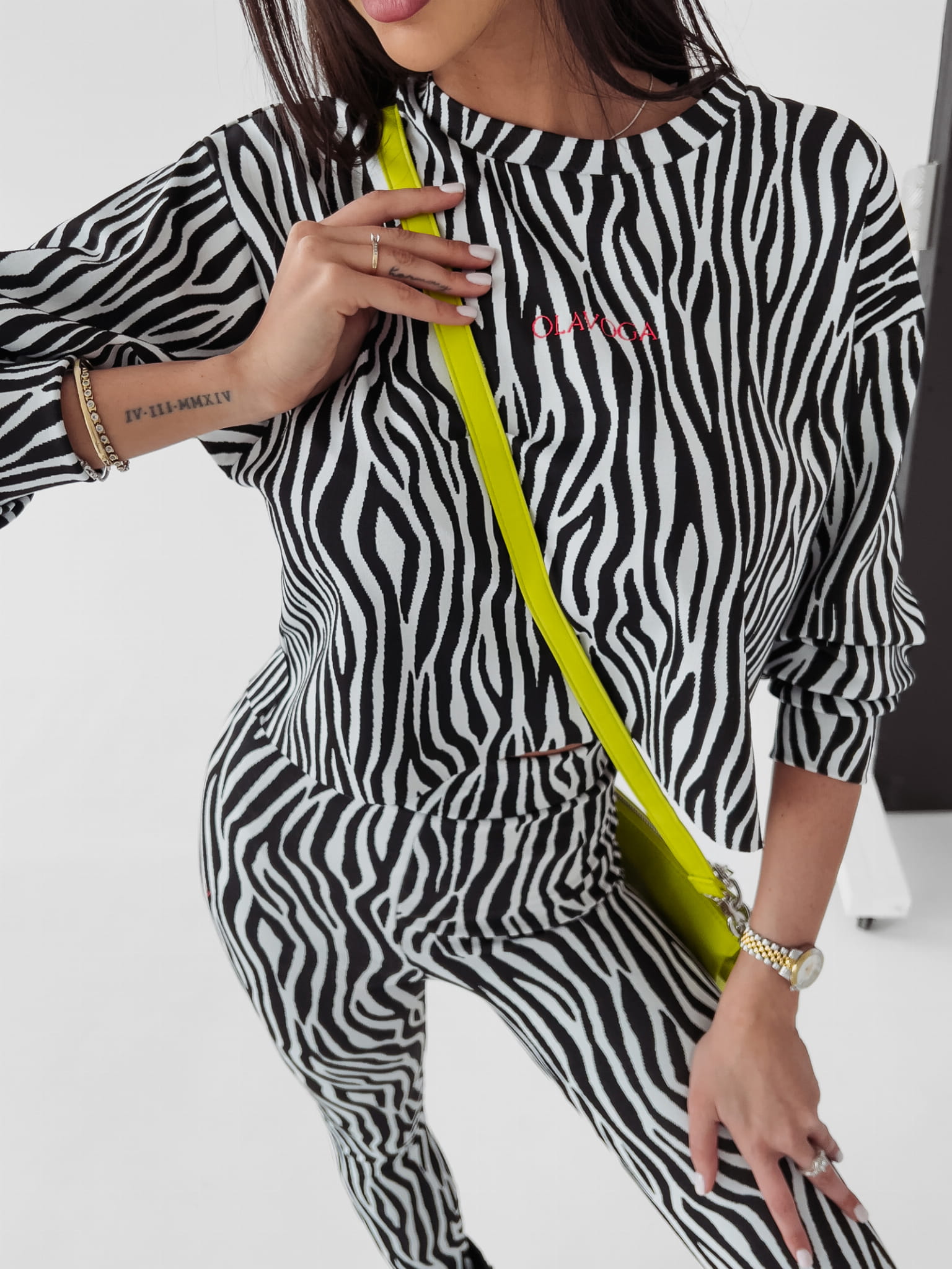 Stylowy, nietuzinkowy komplet drukowany w mocny, zwierzęcy print typu zebra. Górę stanowi cienka, rozszerzana ku dołowi bluza. Na przodzie różowy haft OLAVOGA, rękawy z delikatnie obniżoną liczbą ramion. Legginsy z wysokim stanem, optycznie wyszczuplającym talię.