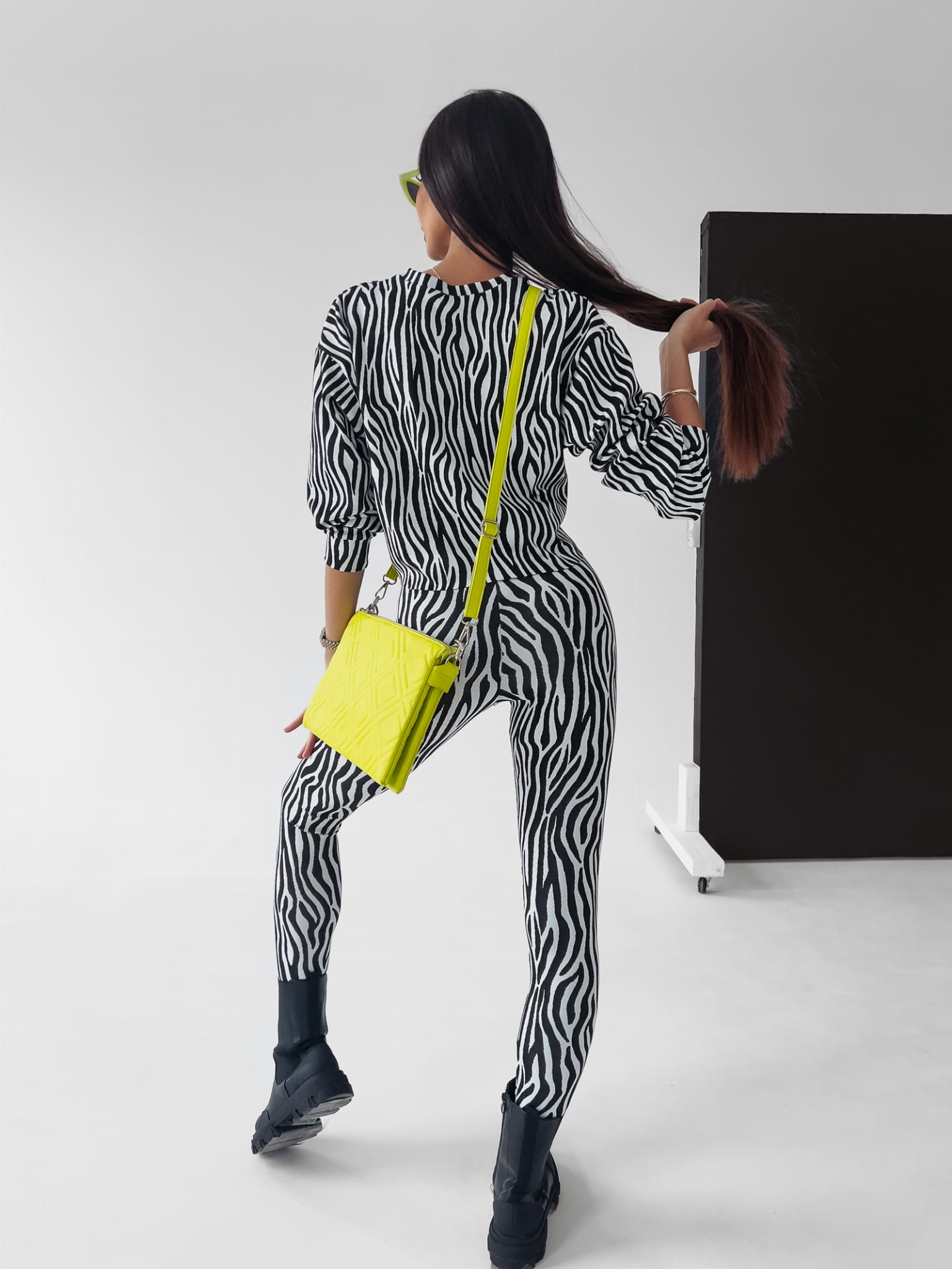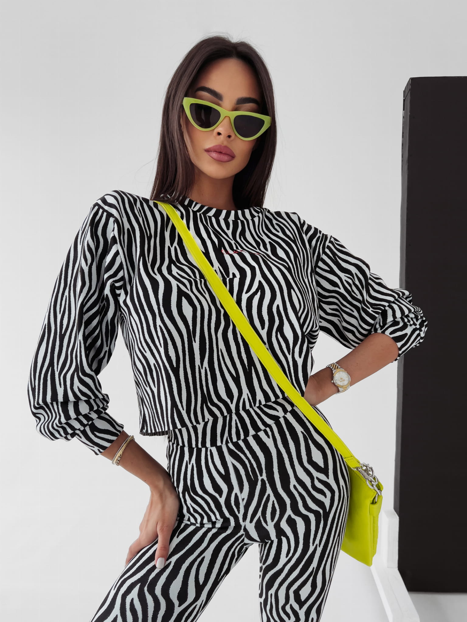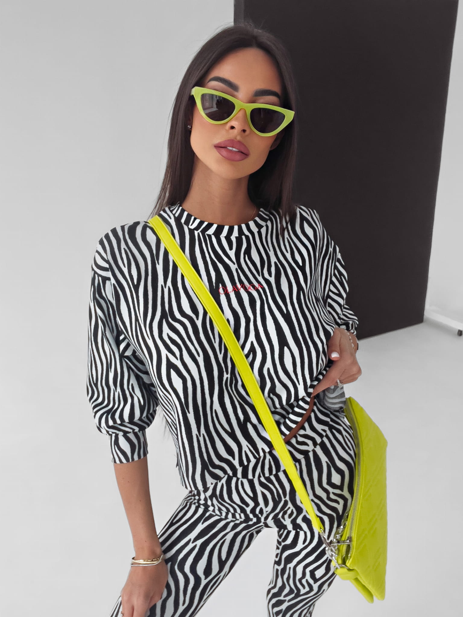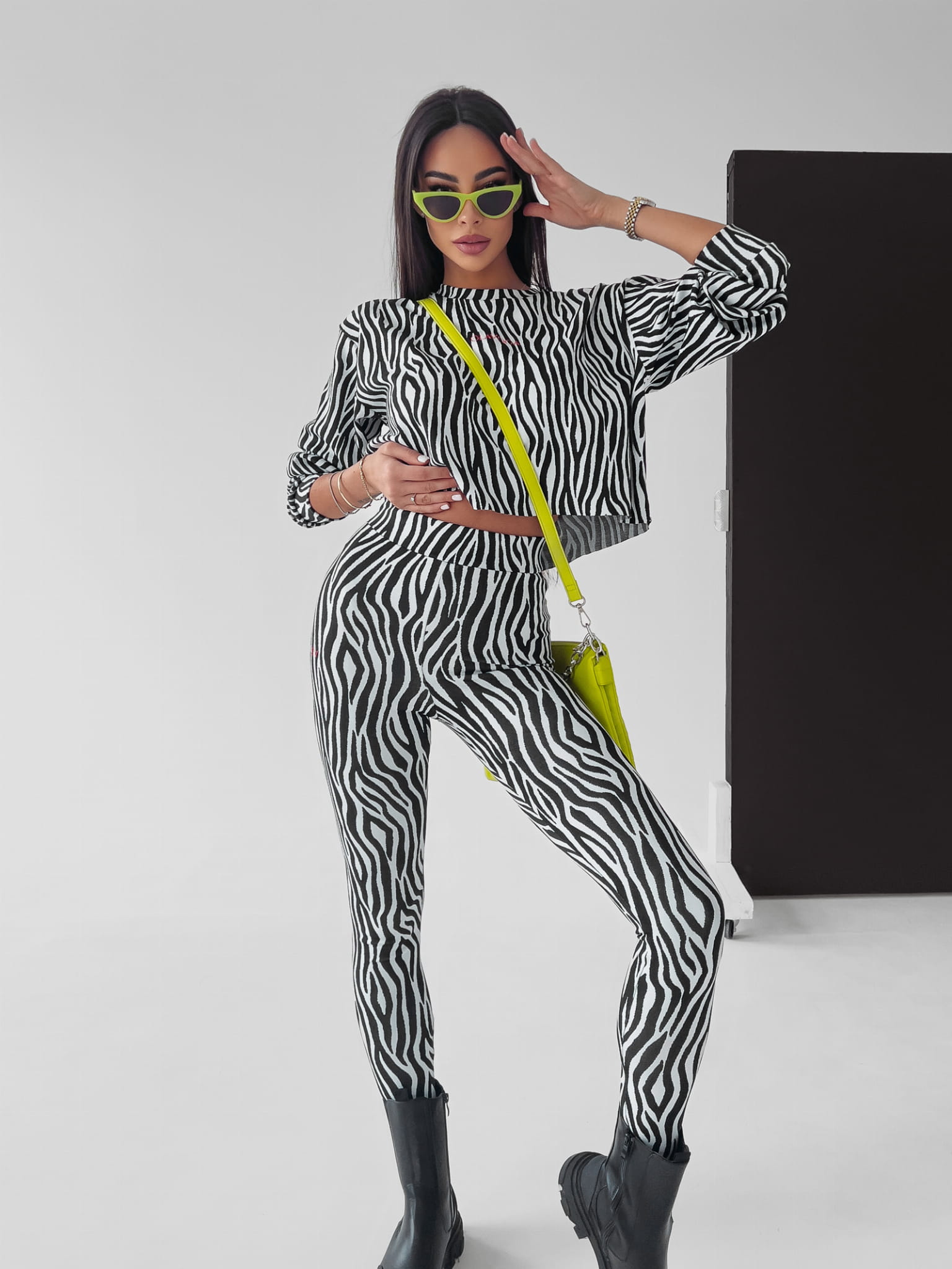Stylowy, nietuzinkowy komplet drukowany w mocny, zwierzęcy print typu zebra. Górę stanowi cienka, rozszerzana ku dołowi bluza. Na przodzie różowy haft OLAVOGA, rękawy z delikatnie obniżoną liczbą ramion. Legginsy z wysokim stanem, optycznie wyszczuplającym talię.