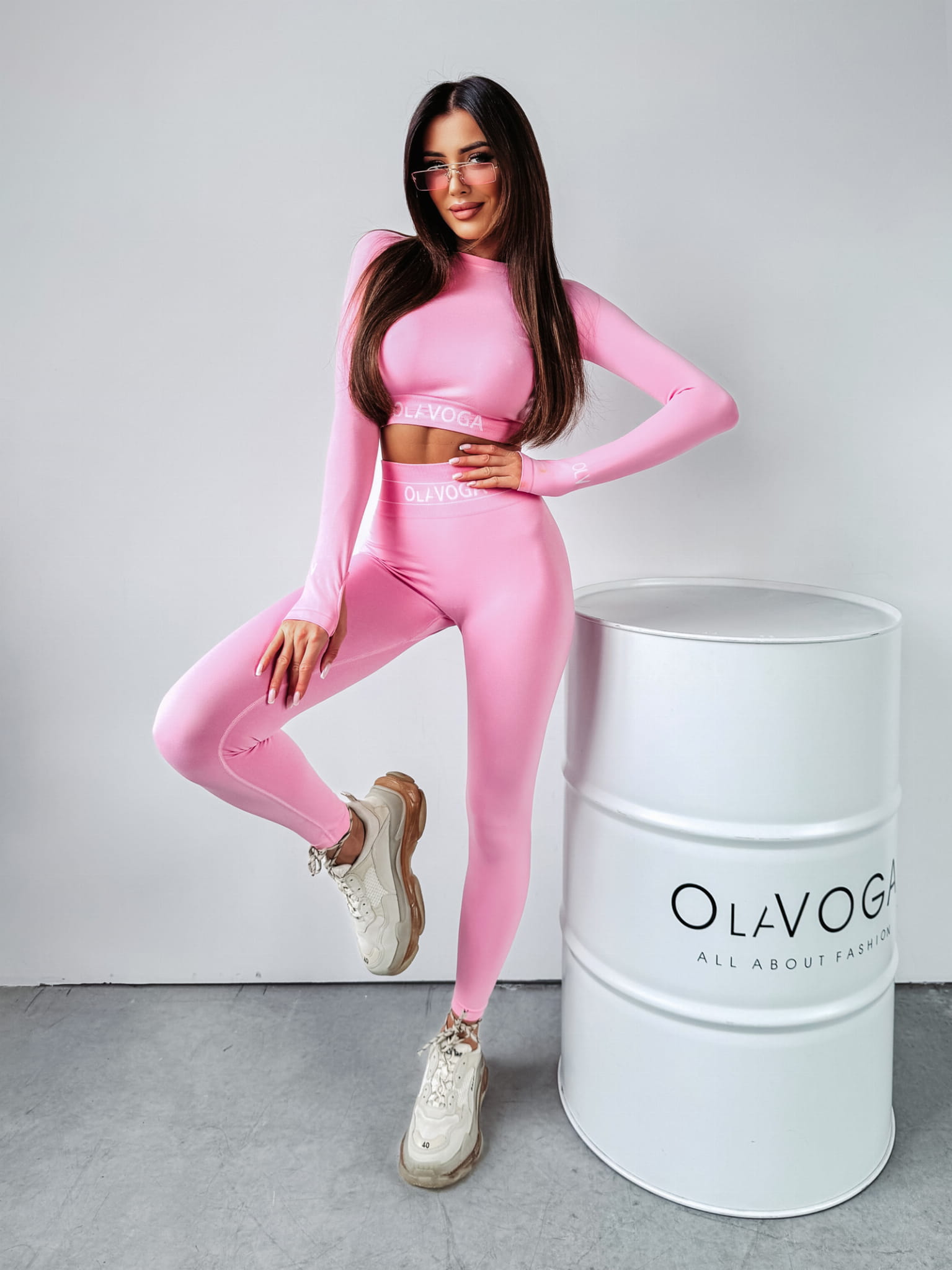 Dopasowany, sportowy komplet, wykonany z wysokiej jakości materiału. Góra - bluzka z długim rękawem. Na jednym z rękawów logo marki i stylowe wycięcie na palec. Dół - idealnie podkreślające sylwetkę legginsy, z wyższym stanem. Góra i dół kompletu posiada logowana gumę