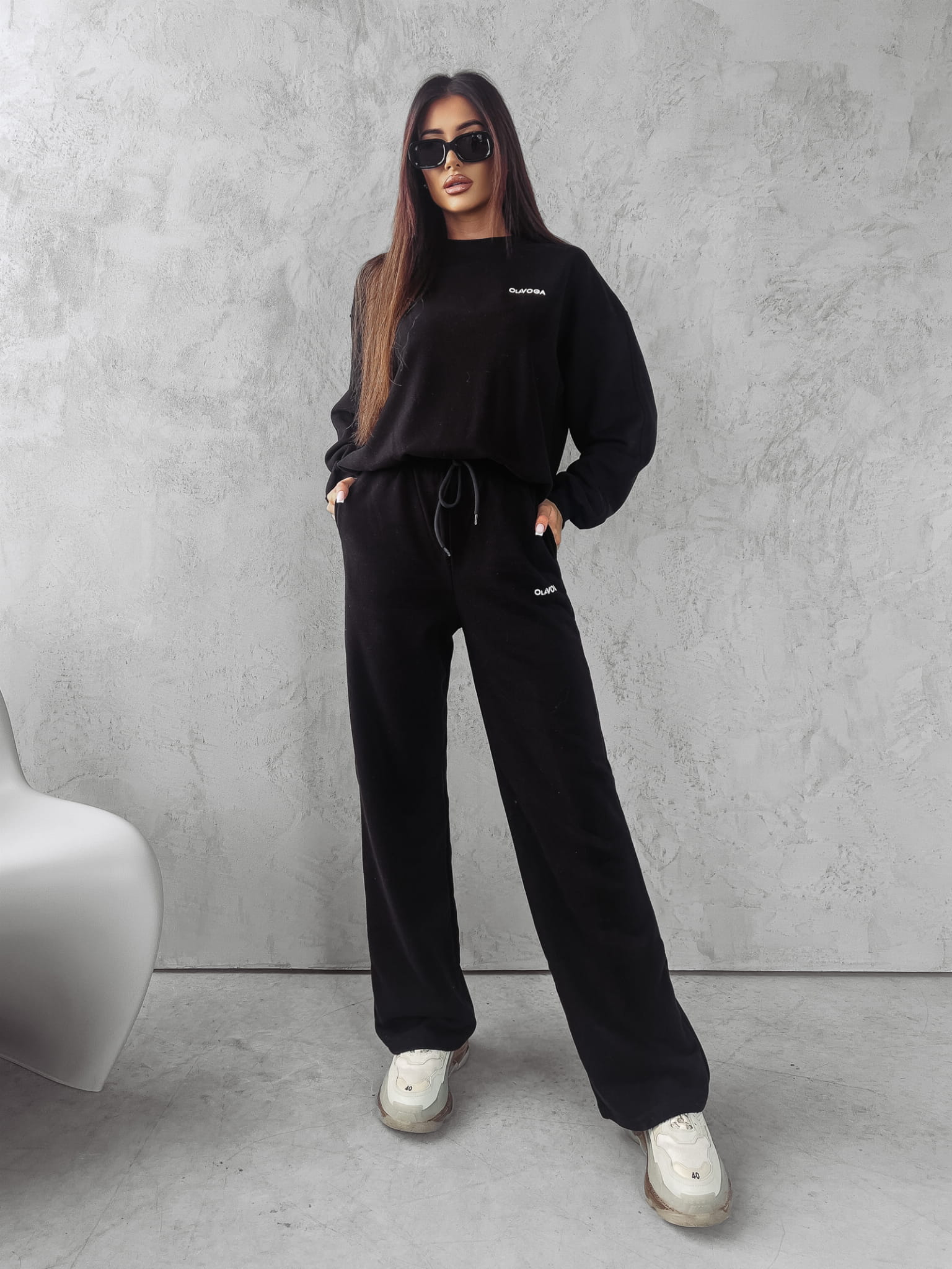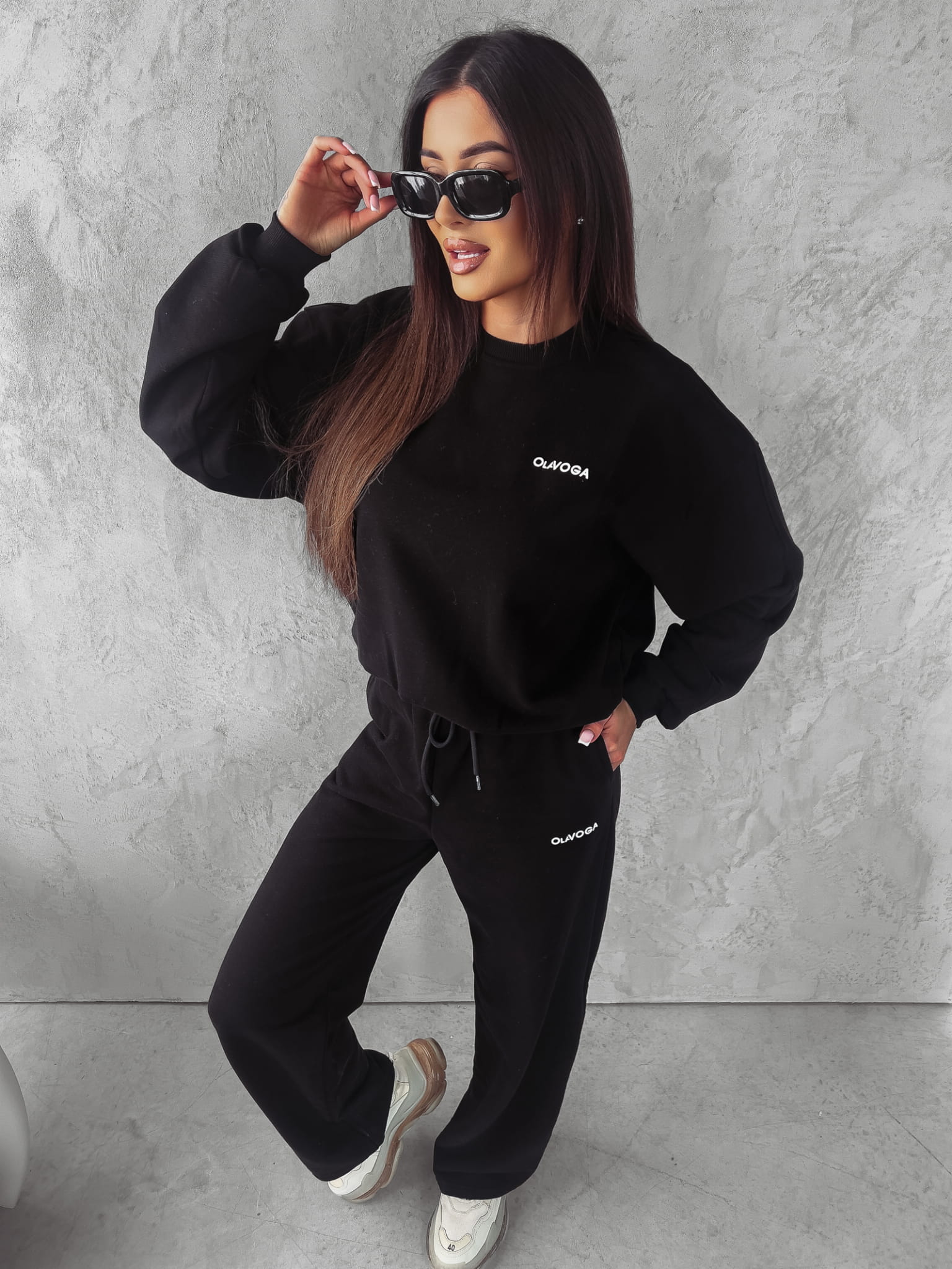 Komplet uszyty z wysokiej jakości materiału bawełnianego. Góra kompletu to bluza typu crewneck. Posiada na przodzie delikatne logo marki oraz prążkowane ściągacze. Dół kompletu to spodnie z nogawką rozszerzaną ku dołowi. Na boku minimalistyczne logo OLAVOGA.