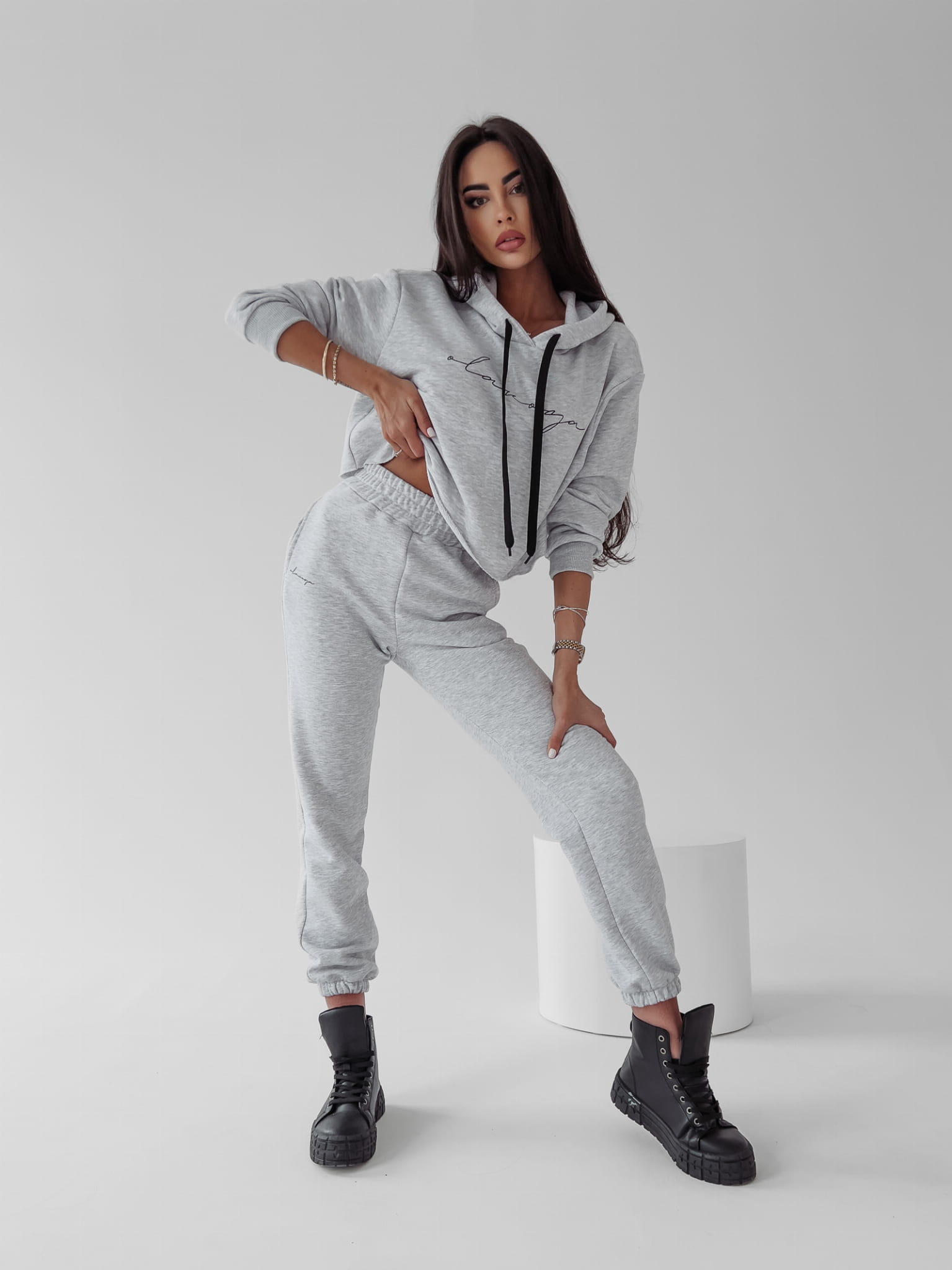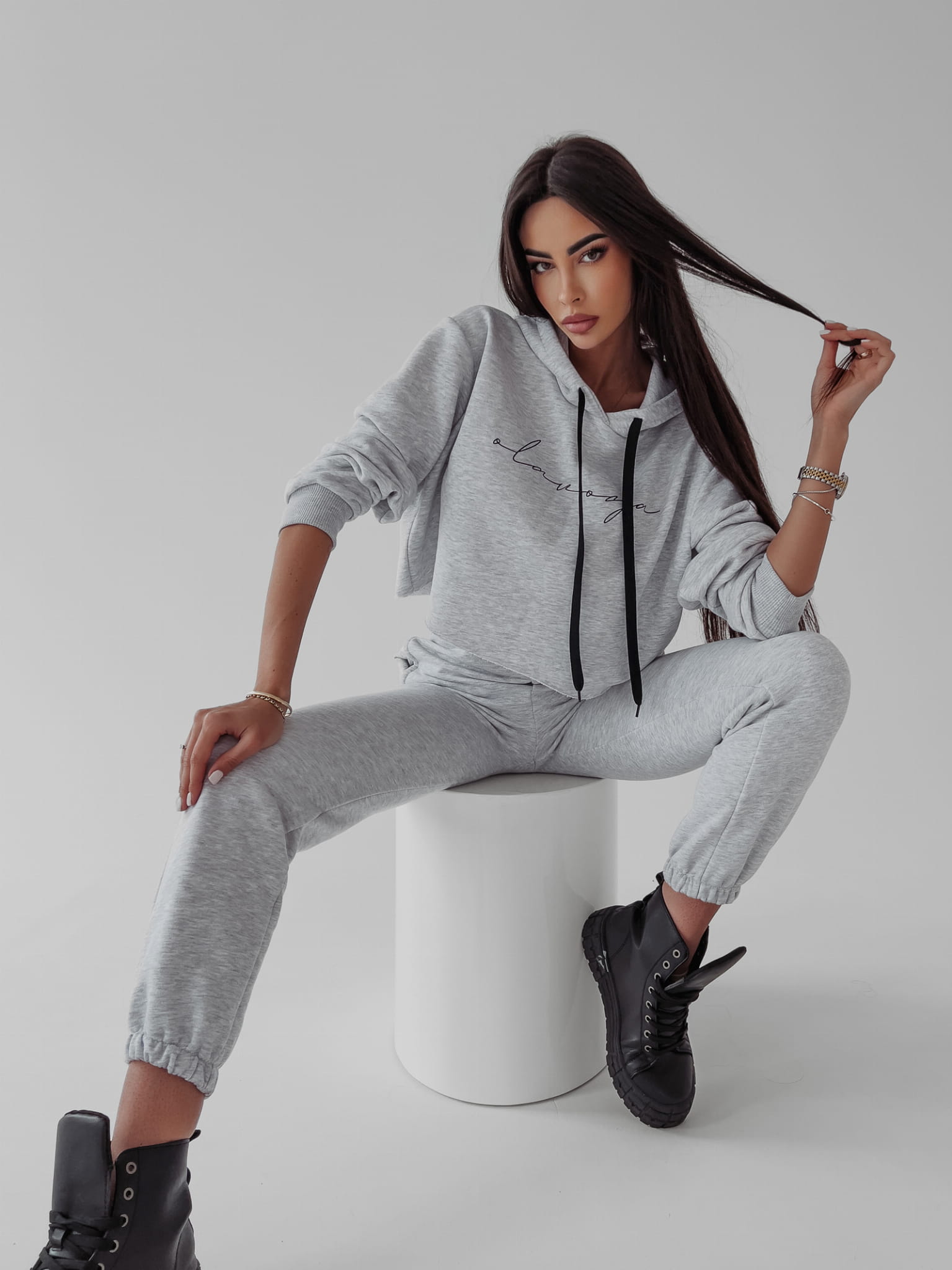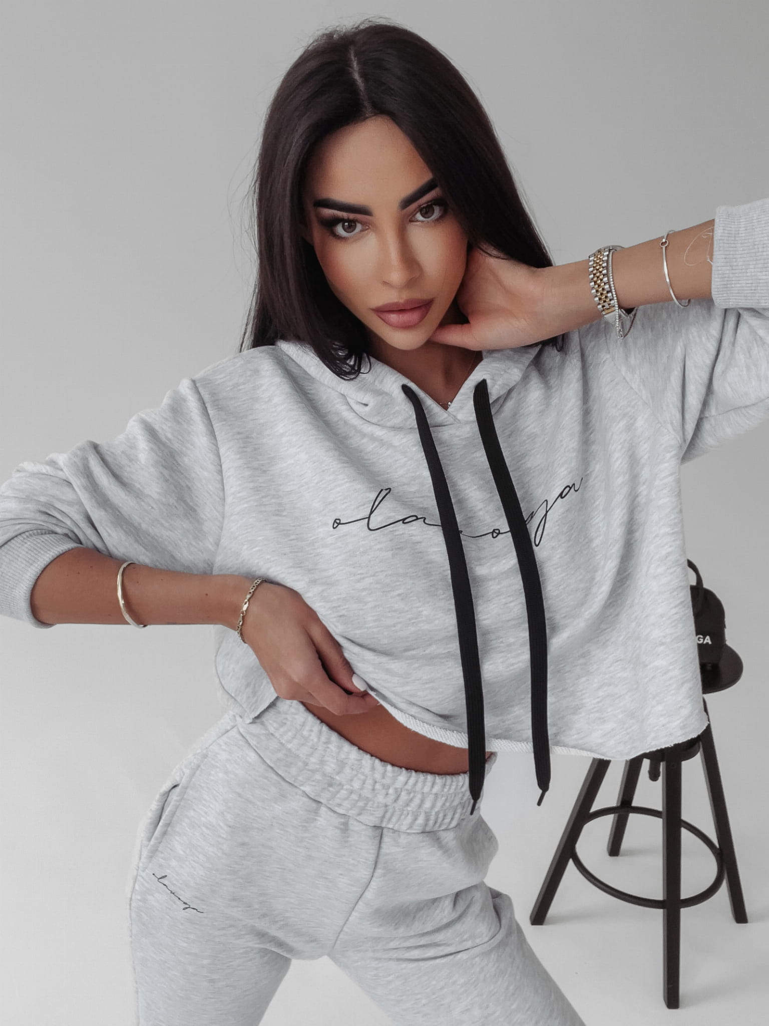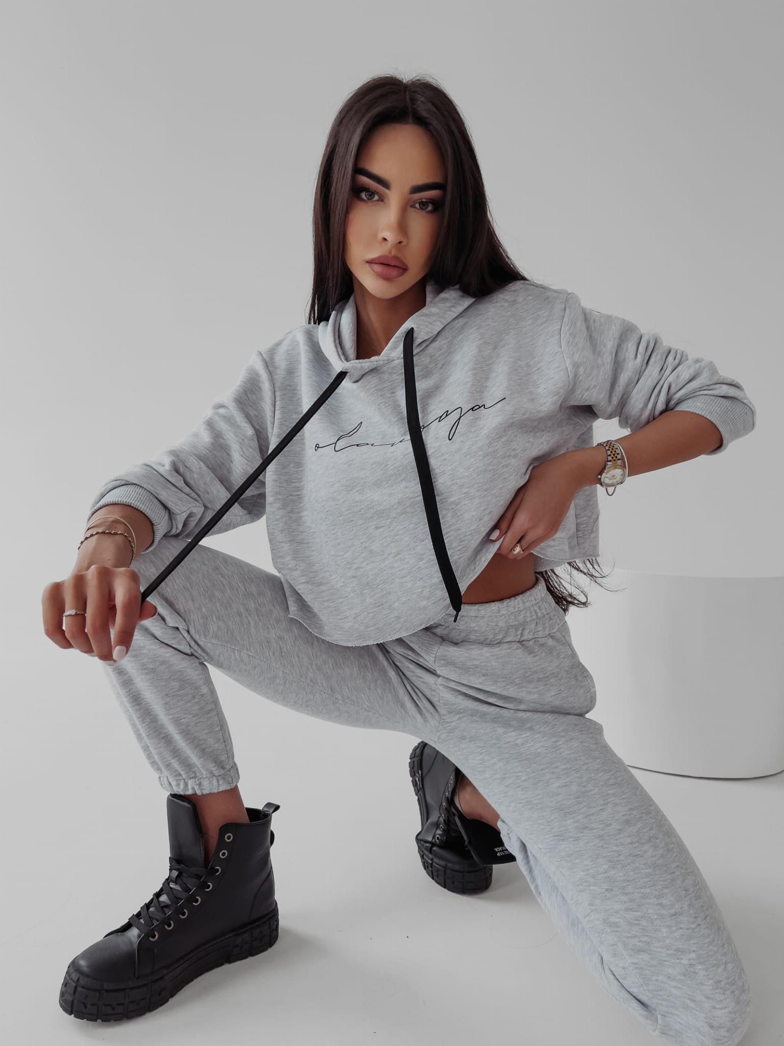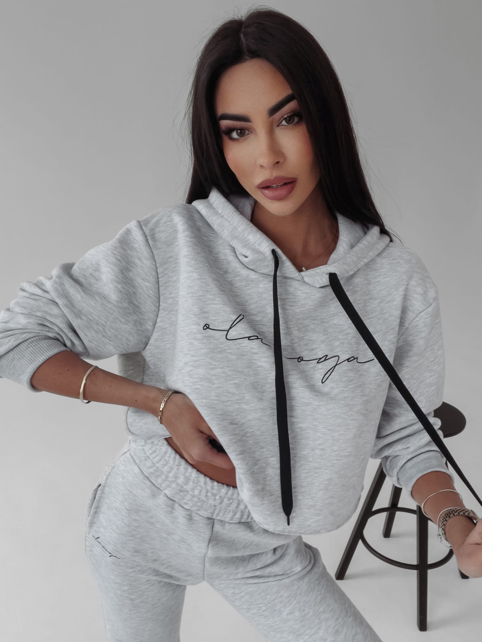Dwuczęściowy, dresowy komplet – luźne spodnie i lekko oversizowa bluza z kapturem. Na przodzie napis – pisane logo OLAVOGA. Komplet uszyty z myślą o miłośniczkach luzu i wygody, chcących podążać za najnowszymi trendami.