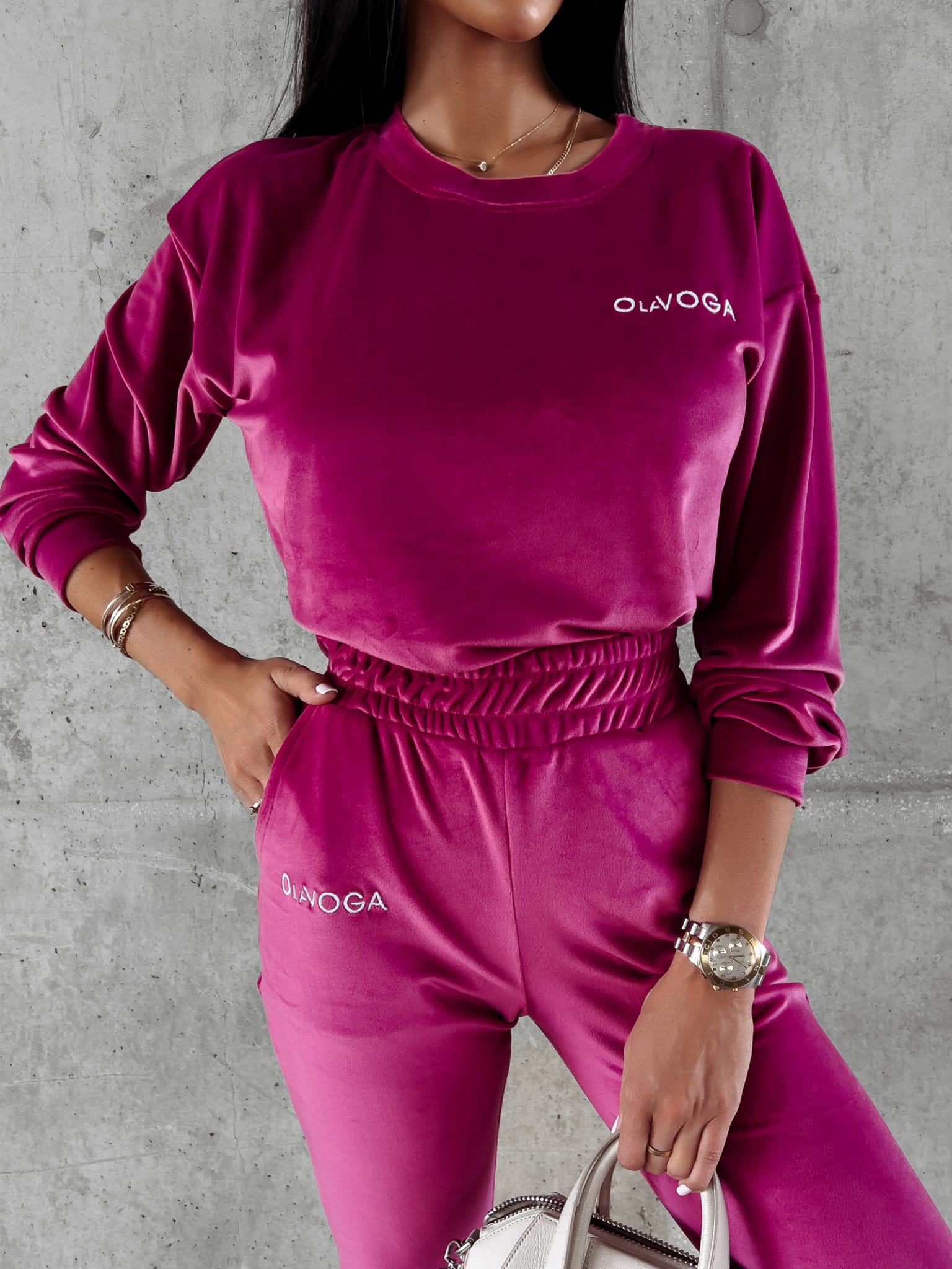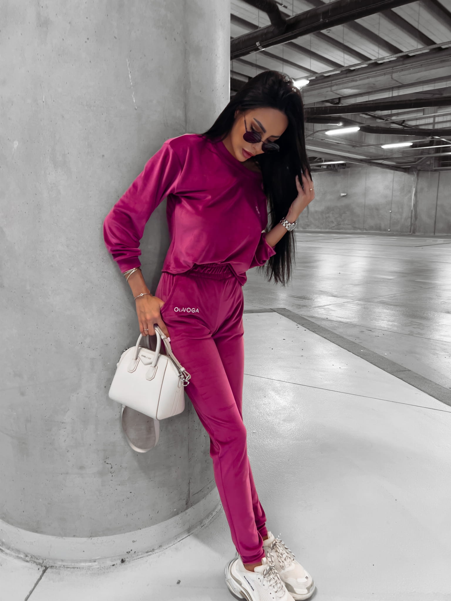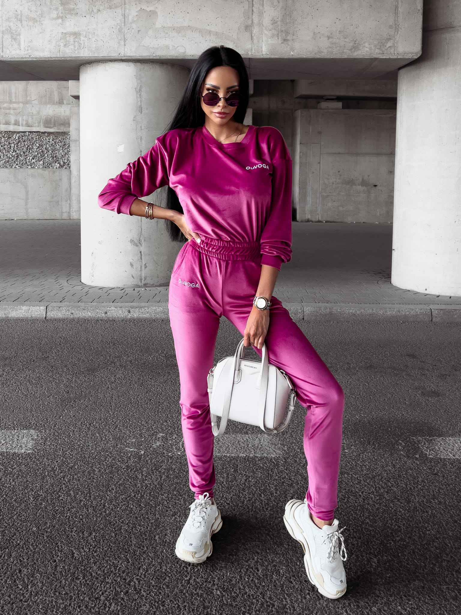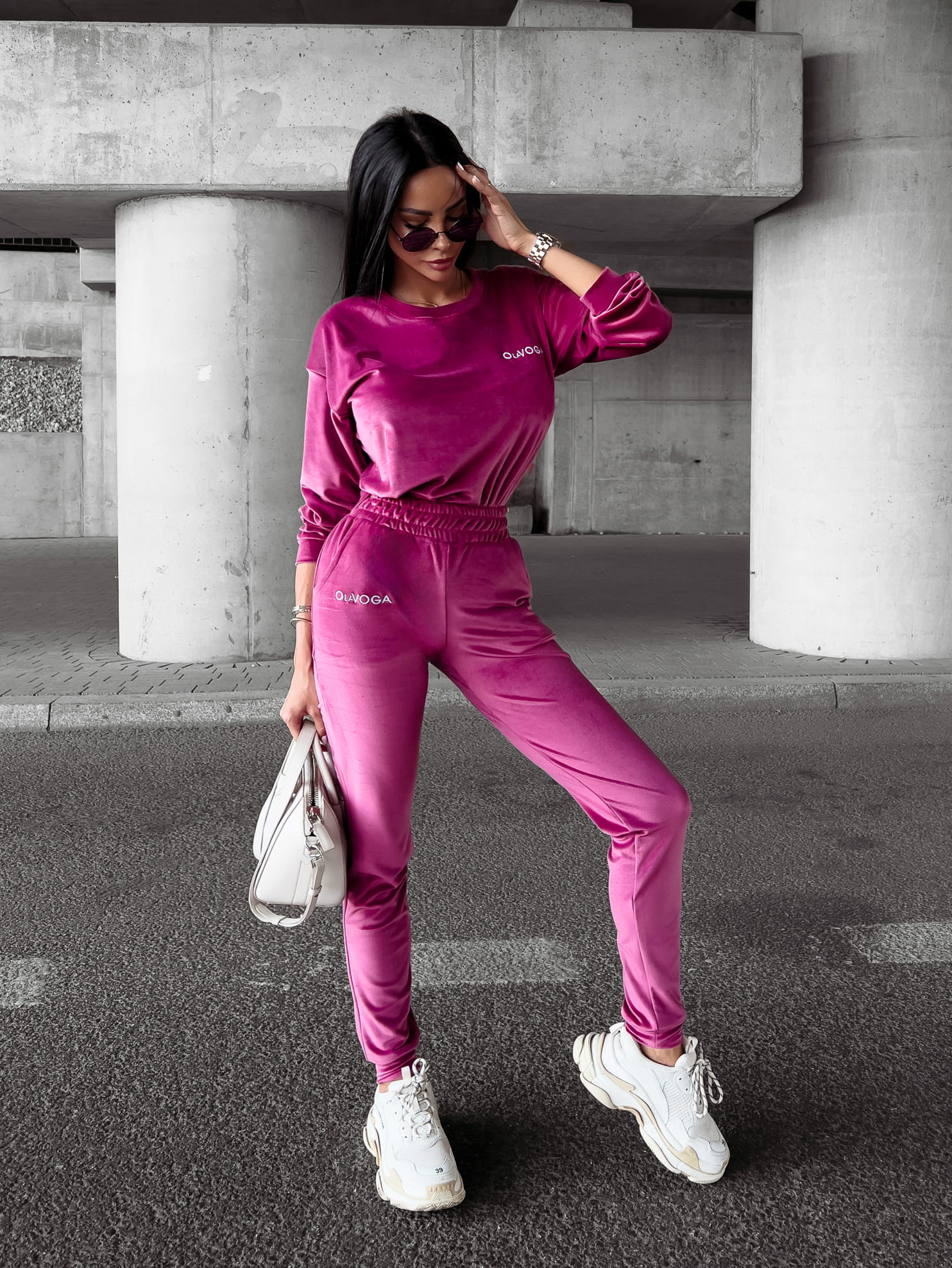 Welurowy, klasyczny damski komplet dresowy. Brzegi zakończone ściągaczem, na przodzie bluzy i nogawki biały, kontrastowy haft z logo.