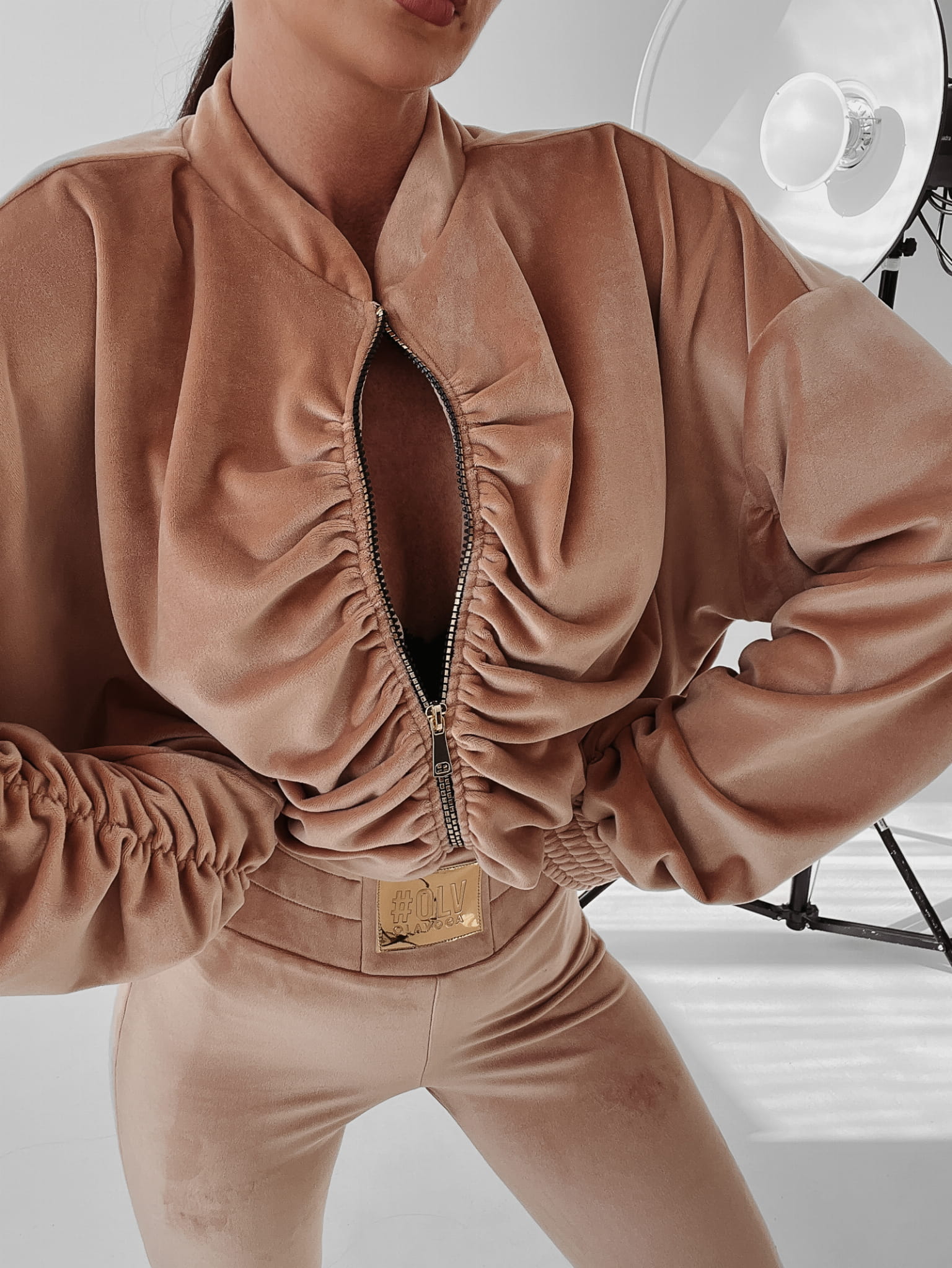 Welurowy, elegancki komplet ze złotymi emblematami, dodającemu stylizacji charakteru glamour. Rozpinana, marszczona bluza o luźnym kroju w stylu nietoperz i dopasowane spodnie ozdobione zostały dodatkowo złotą naszywką OLV.