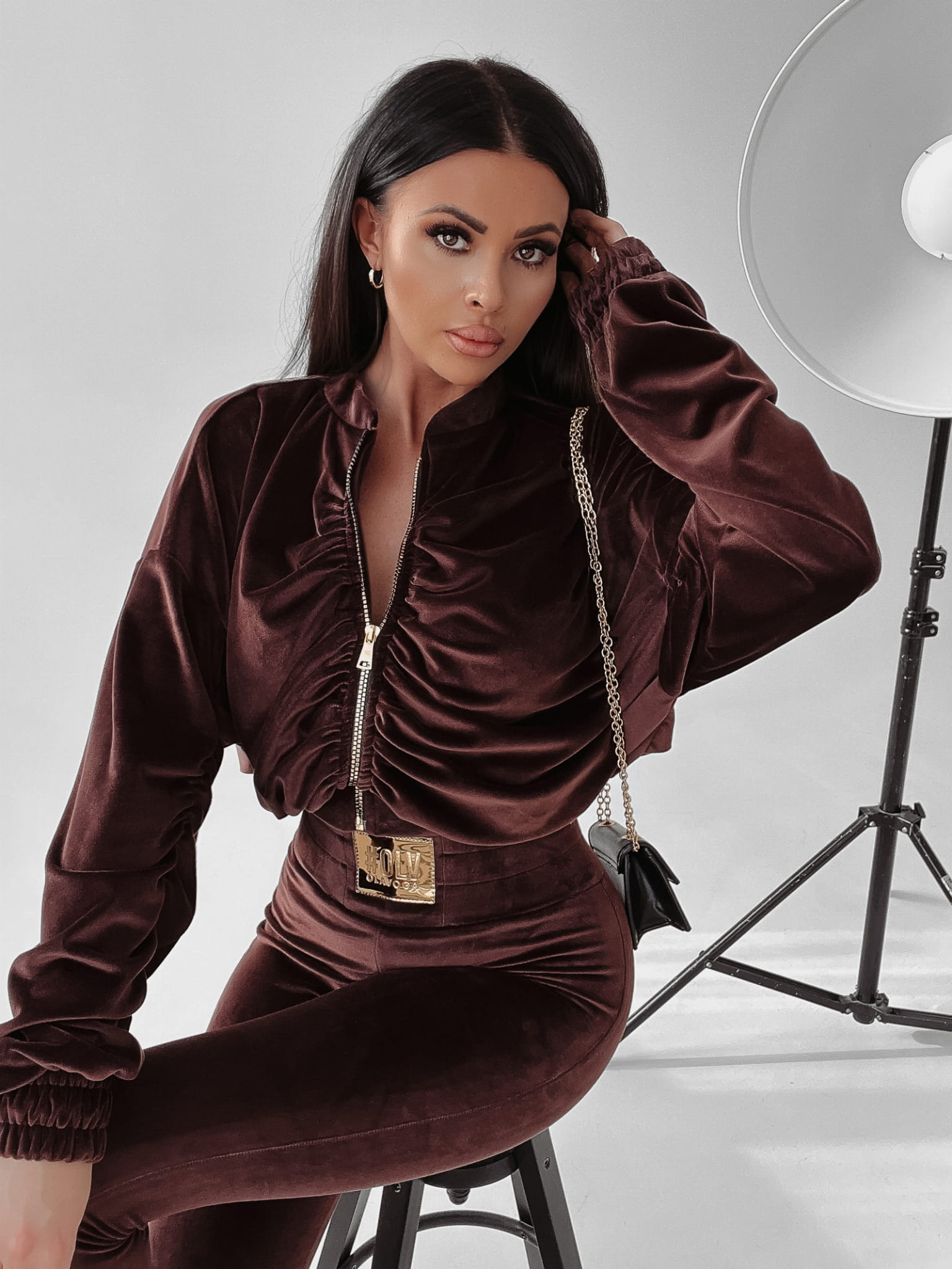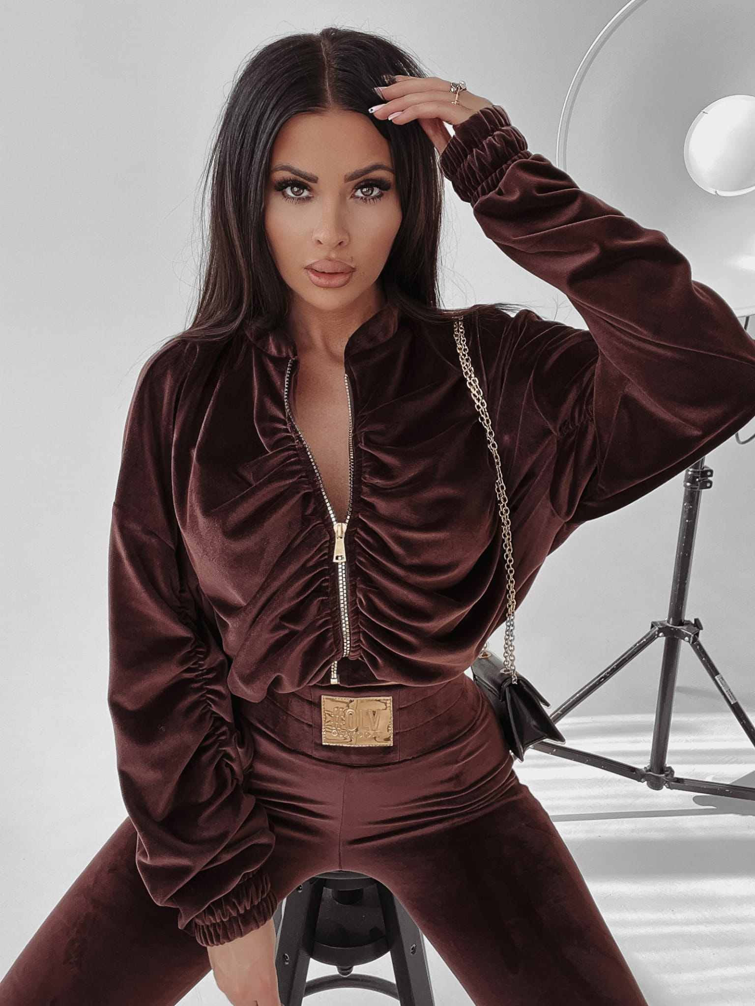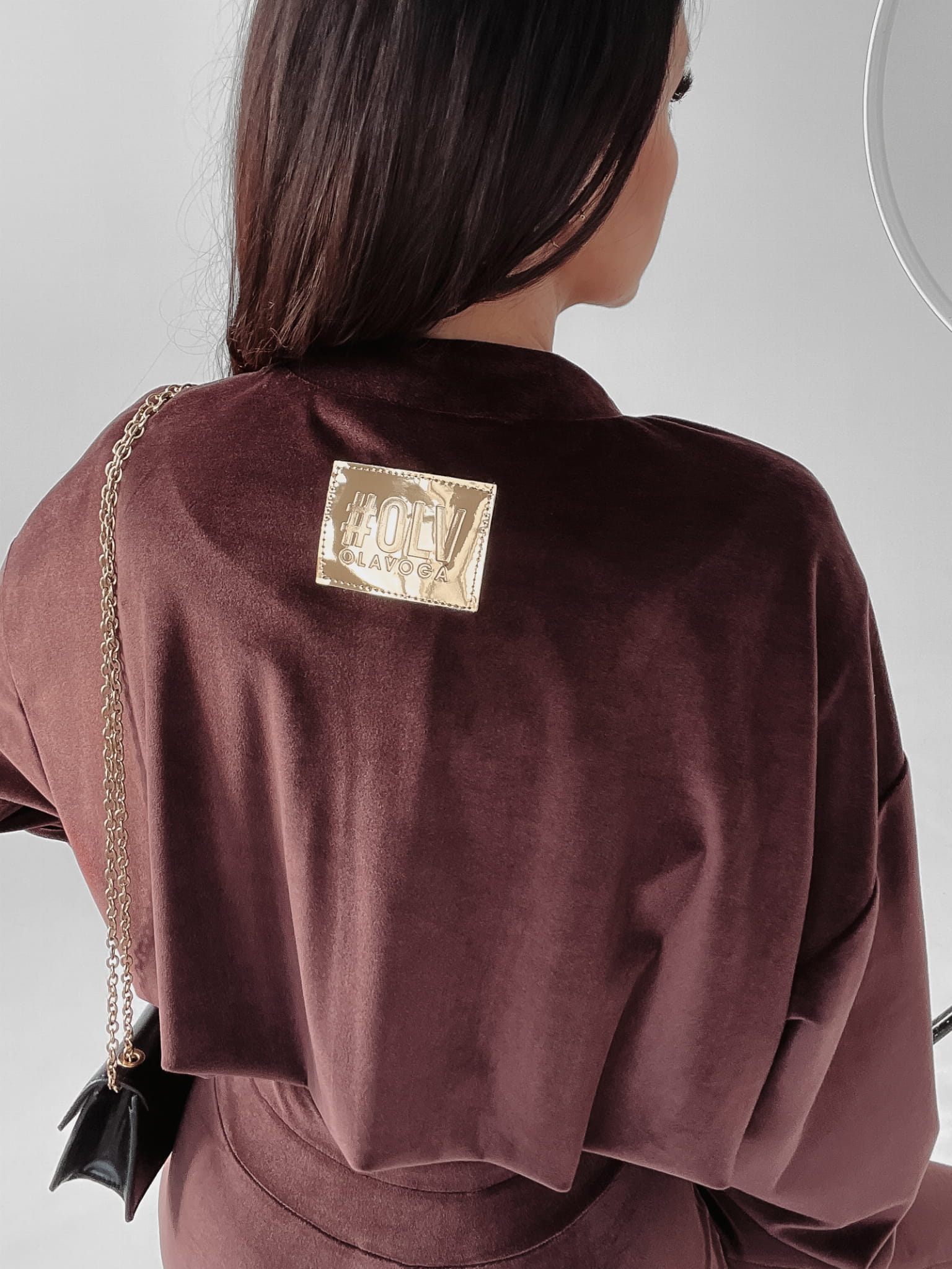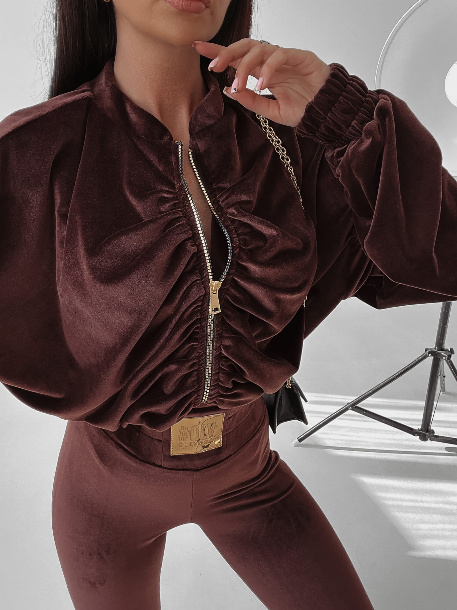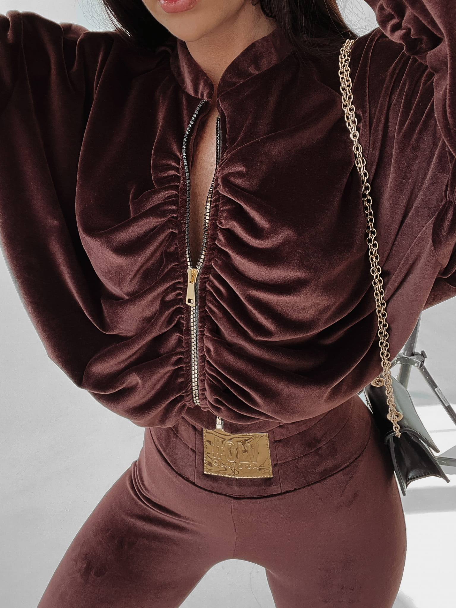 Welurowy, elegancki komplet ze złotymi emblematami, dodającemu stylizacji charakteru glamour. Rozpinana, marszczona bluza o luźnym kroju w stylu nietoperz i dopasowane spodnie ozdobione zostały dodatkowo złotą naszywką OLV.