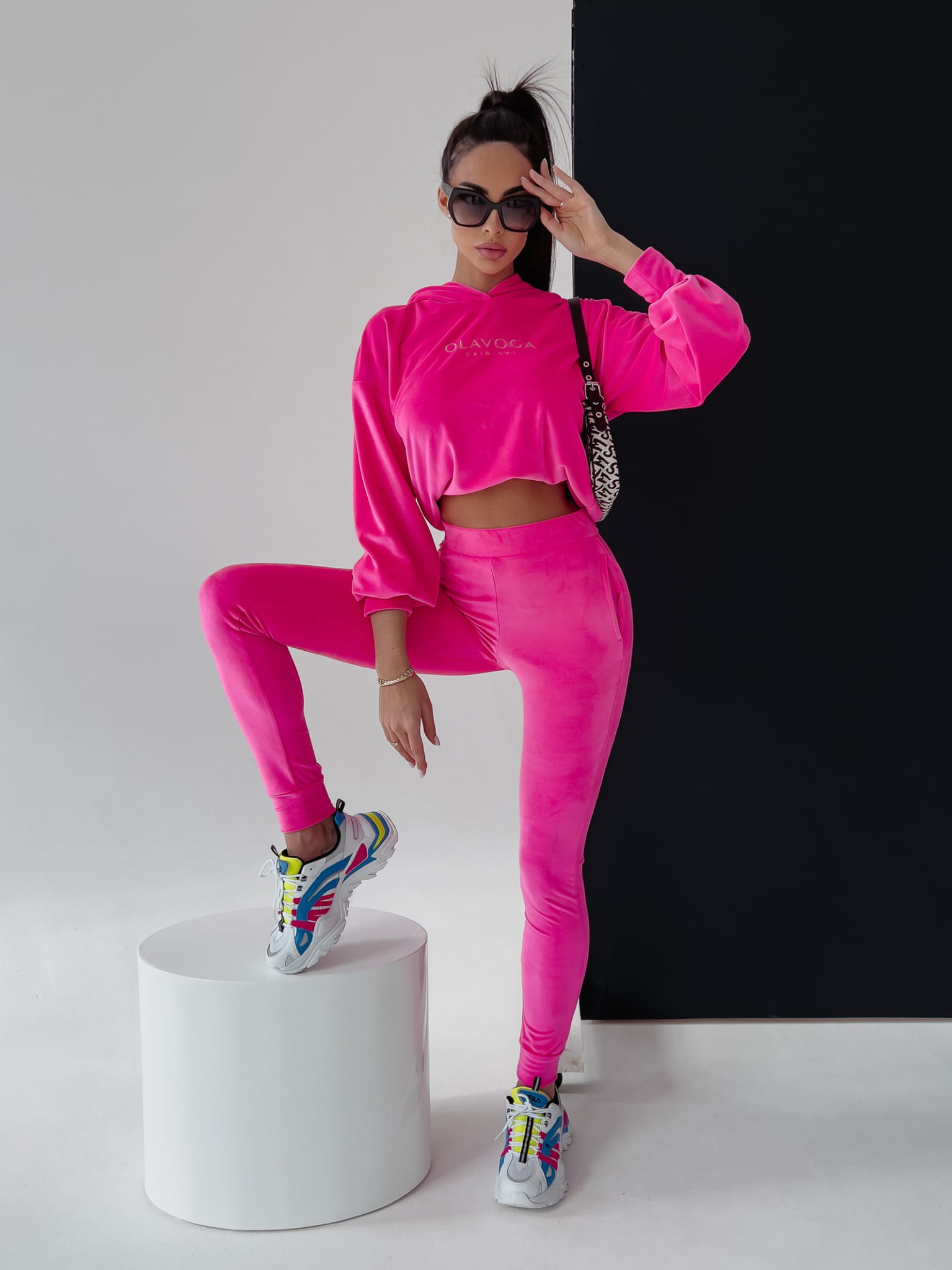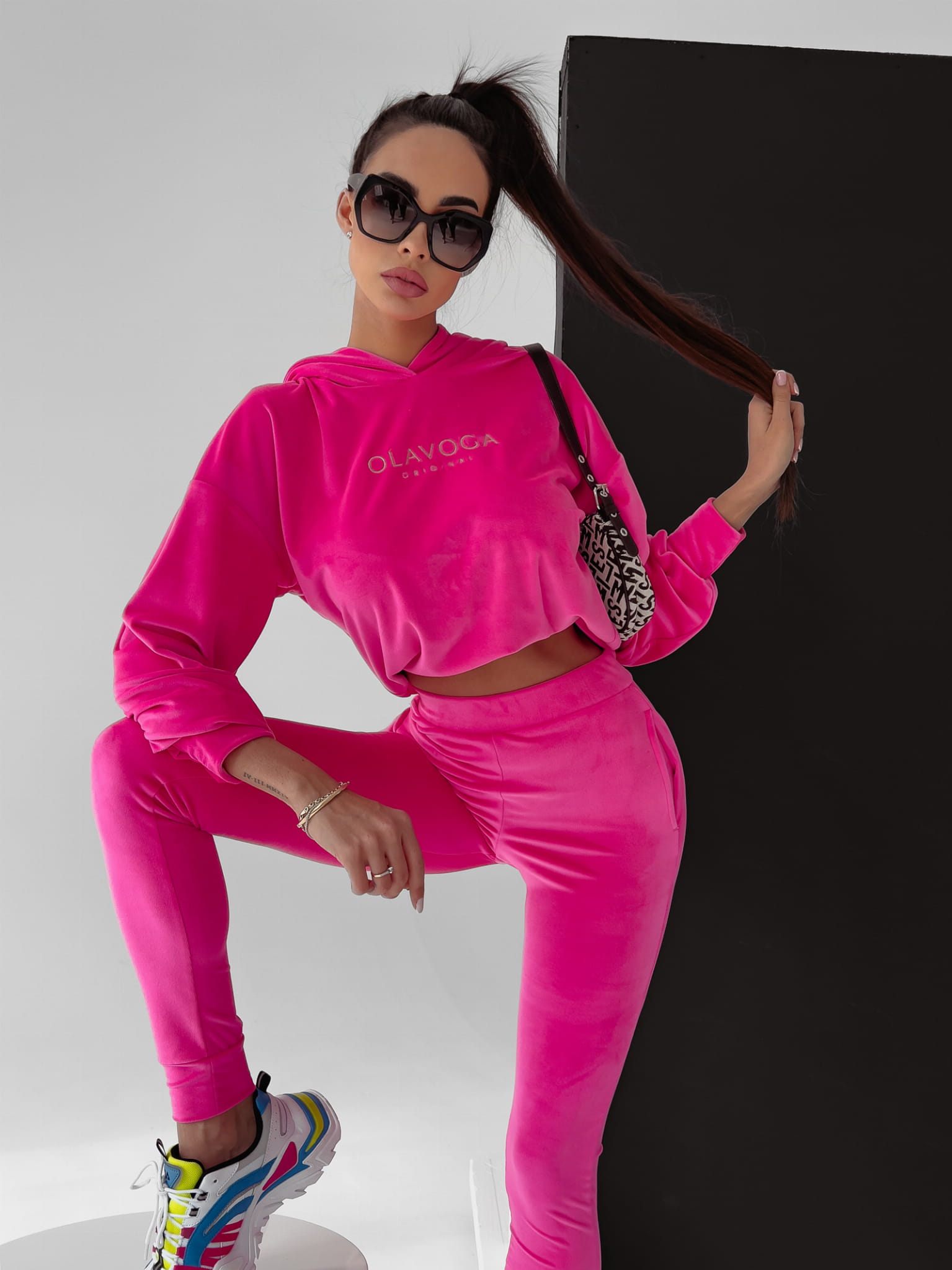 Dresowy, welurowy komplet dla miłośniczek wygody i casualowego stylu. Luźna bluza z kapturem i haftem OLAVOGA ORIGINAL na przodzie. Mankiety i nogawki wykończone ściągaczem. W pasie elastyczna guma, zapewniająca komfort noszenia.