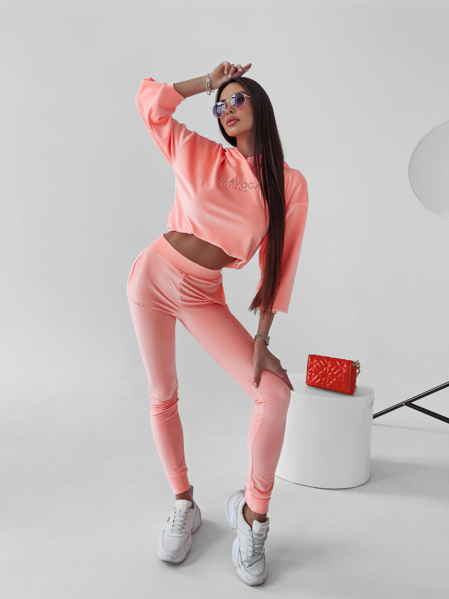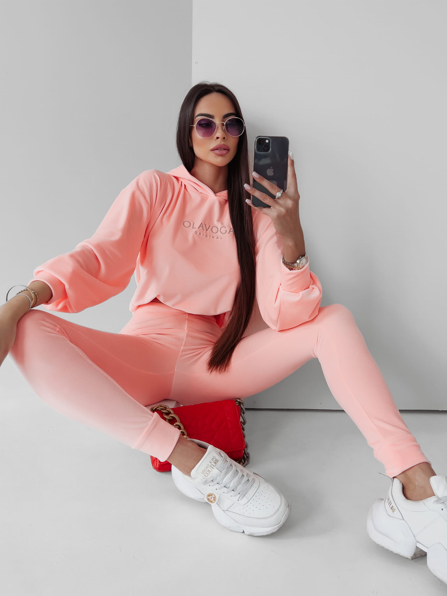 Dresowy, welurowy komplet dla miłośniczek wygody i casualowego stylu. Luźna bluza z kapturem i haftem OLAVOGA ORIGINAL na przodzie. Mankiety i nogawki wykończone ściągaczem. W pasie elastyczna guma, zapewniająca komfort noszenia.