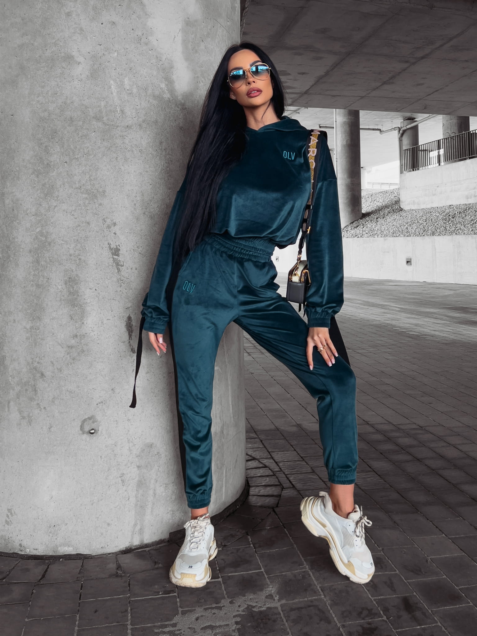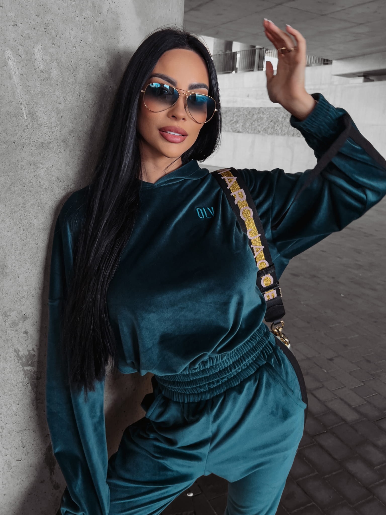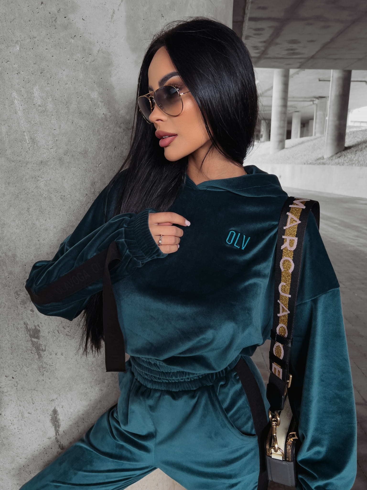 Welurowy komplet dresowy – bluza z kapturem i joggery z logowanym lampasem. Przy rękawach doszyte finezyjnie opadające taśmy. Świetnej jakości, mięsisty welur. Na przodzie haft 3d z logo OLV. Brzegi kompletu zakończone ściągaczem.