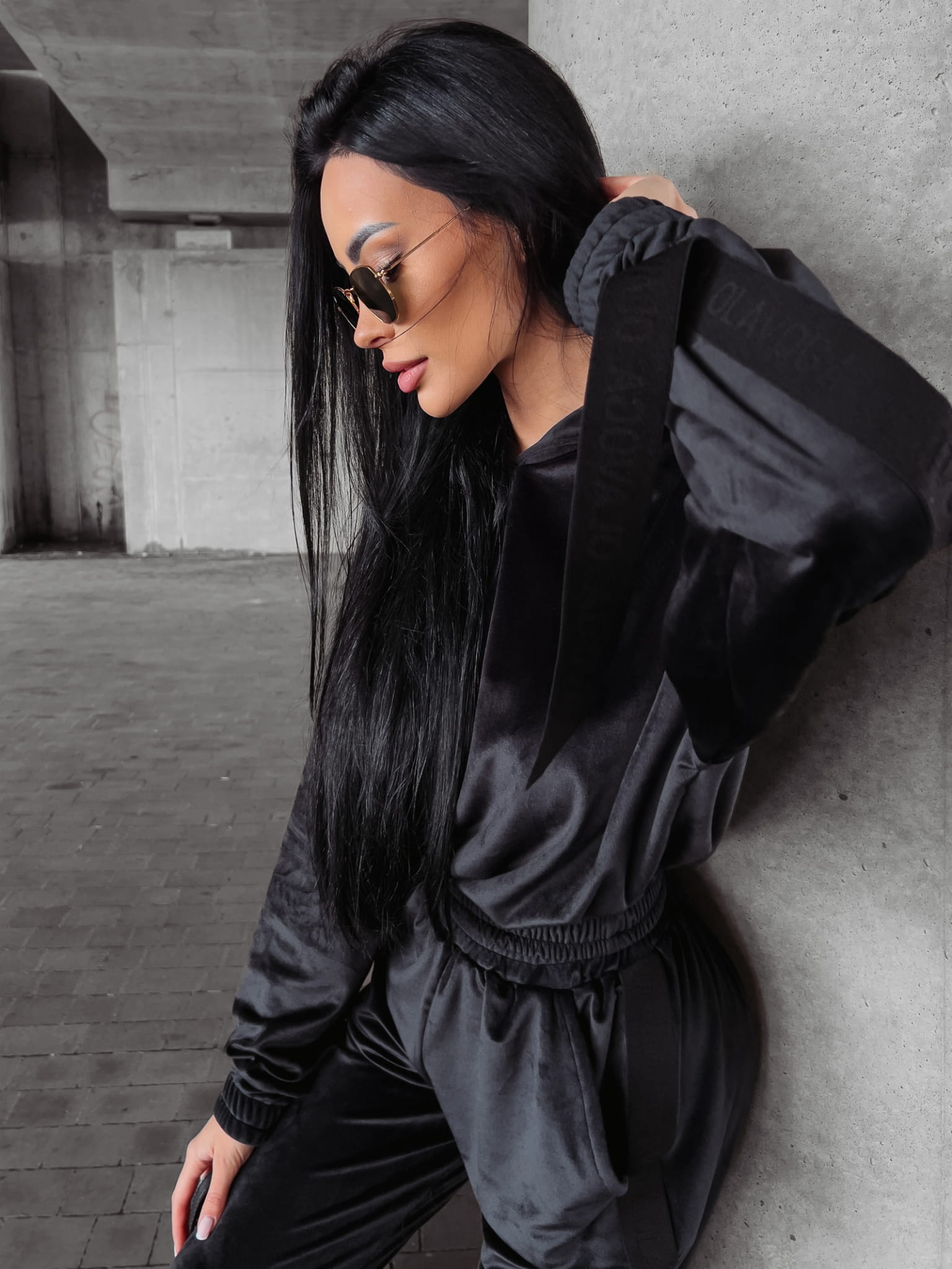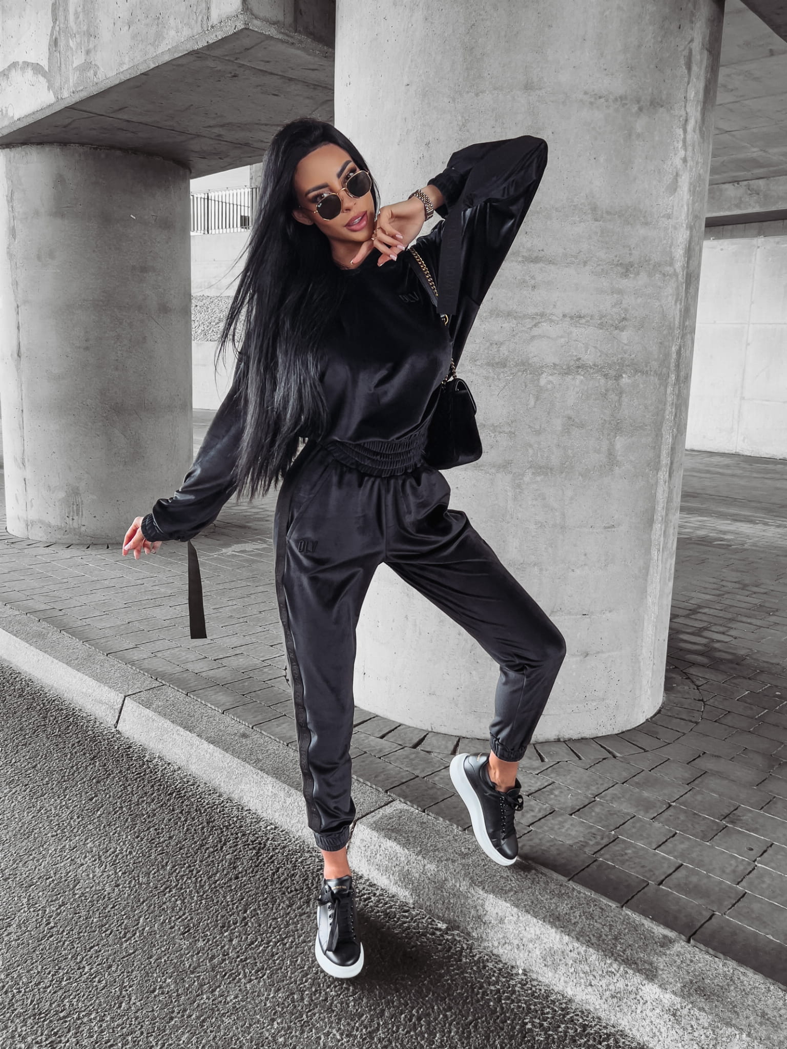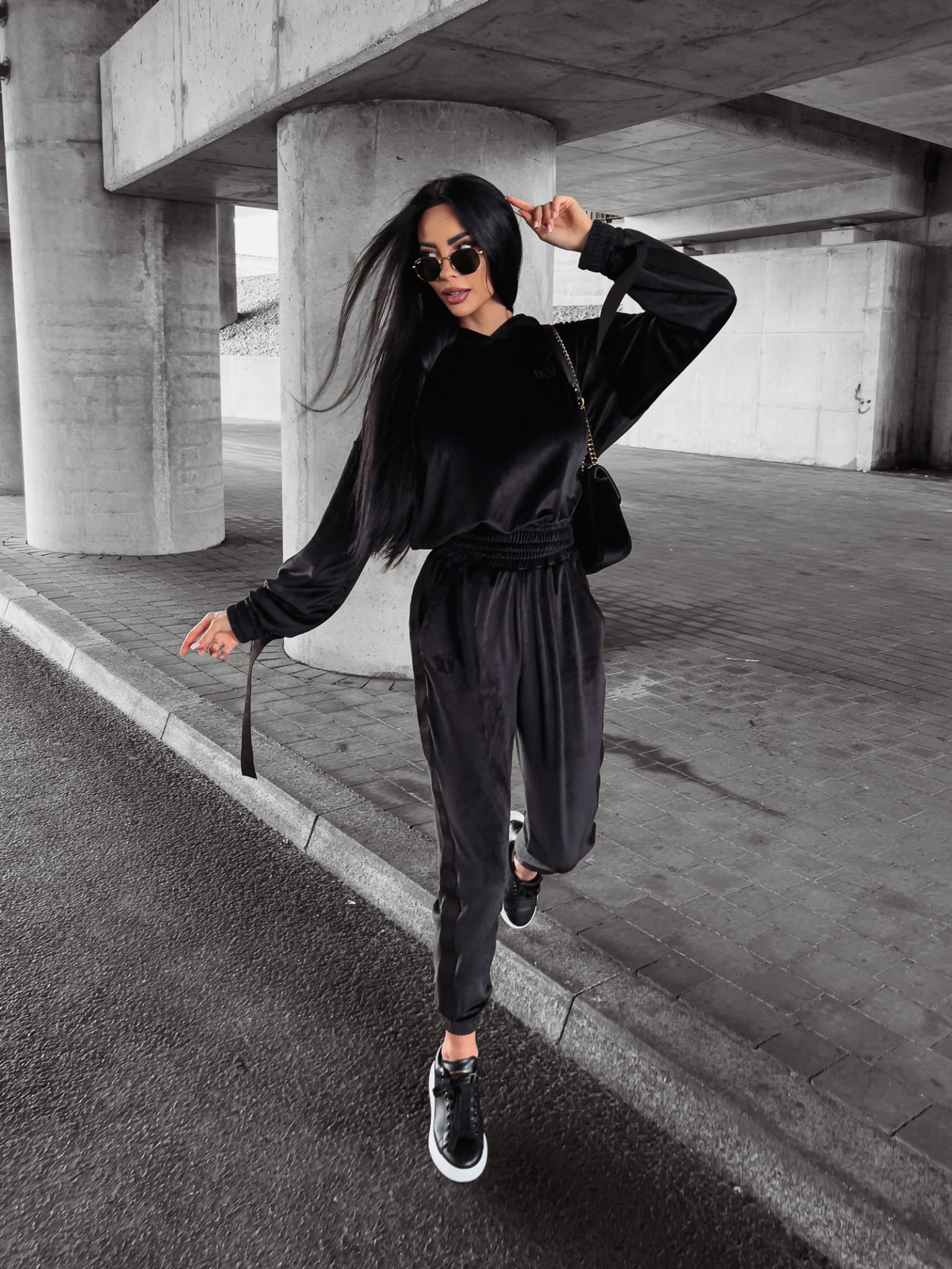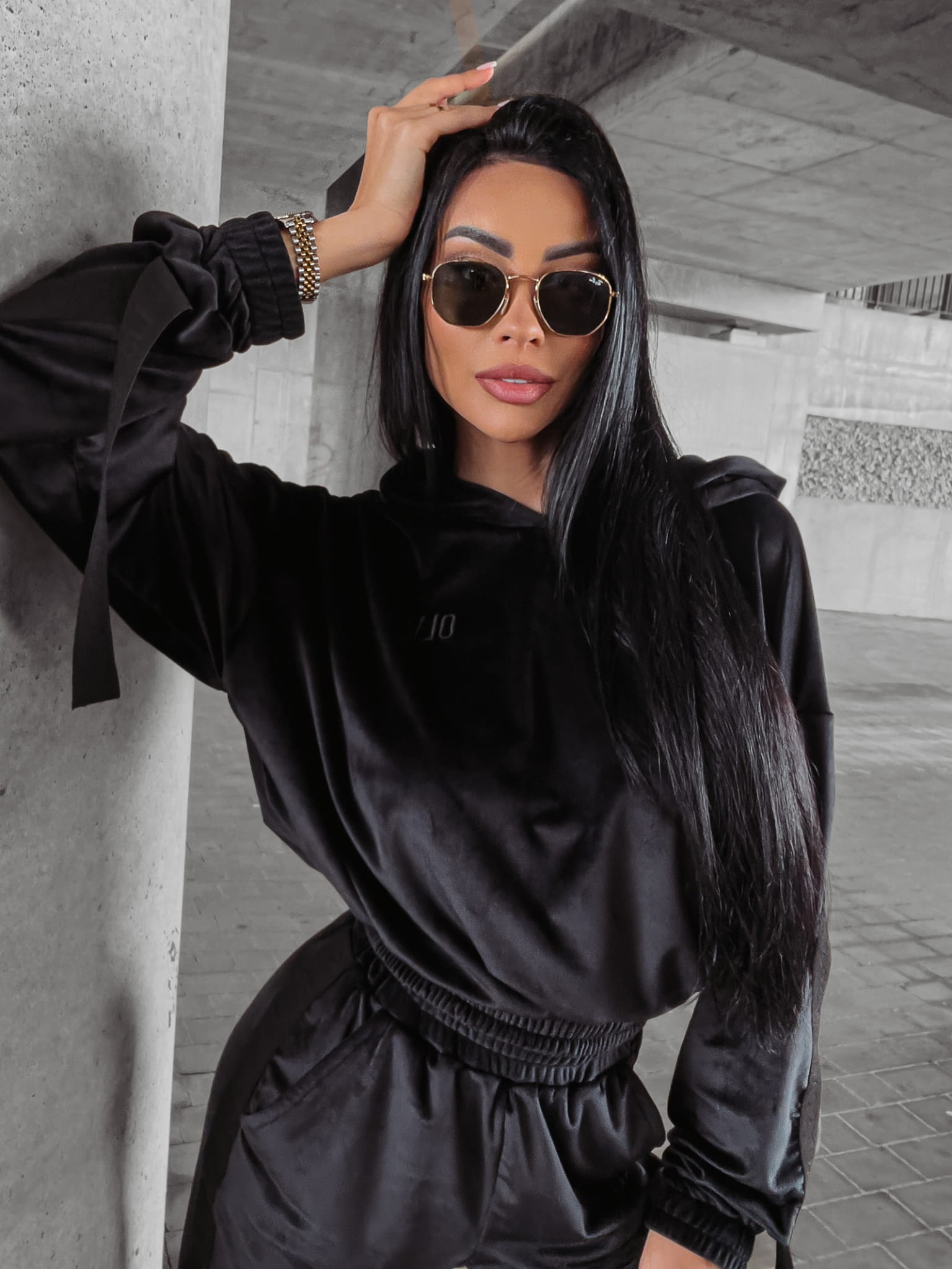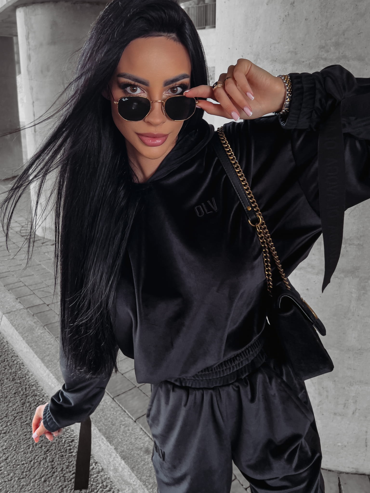 Welurowy komplet dresowy – bluza z kapturem i joggery z logowanym lampasem. Przy rękawach doszyte finezyjnie opadające taśmy. Świetnej jakości, mięsisty welur. Na przodzie haft 3d z logo OLV. Brzegi kompletu zakończone ściągaczem.