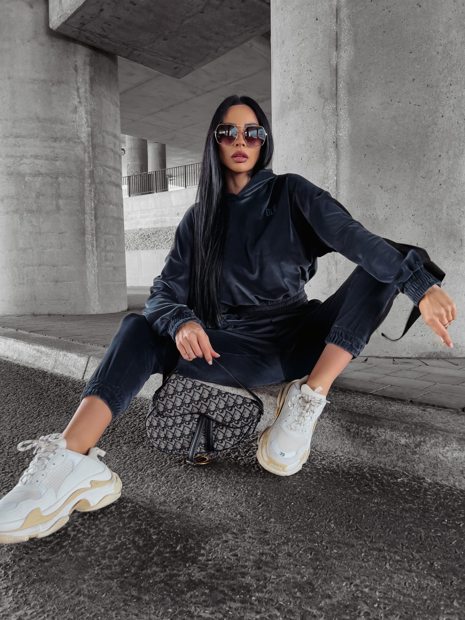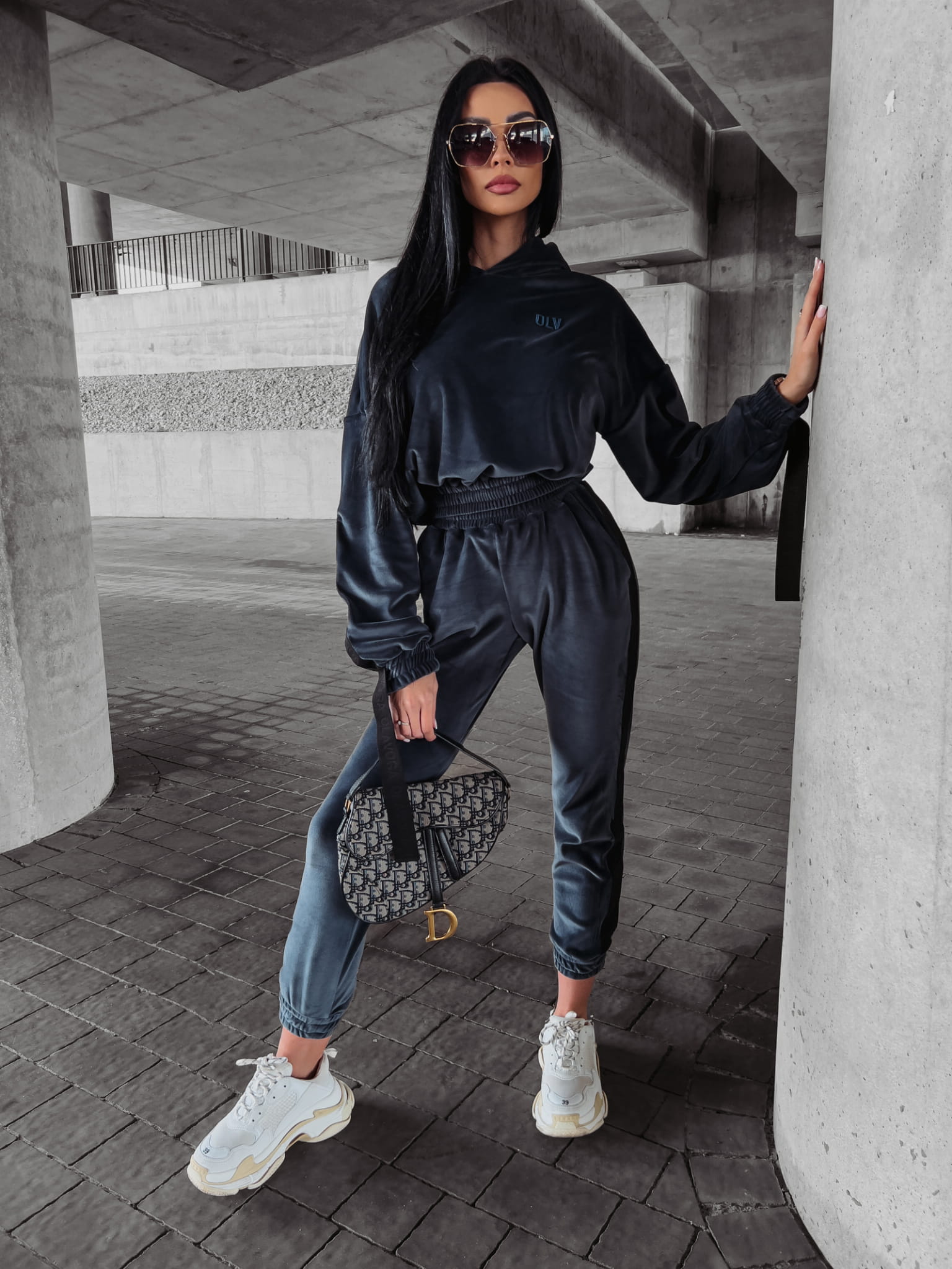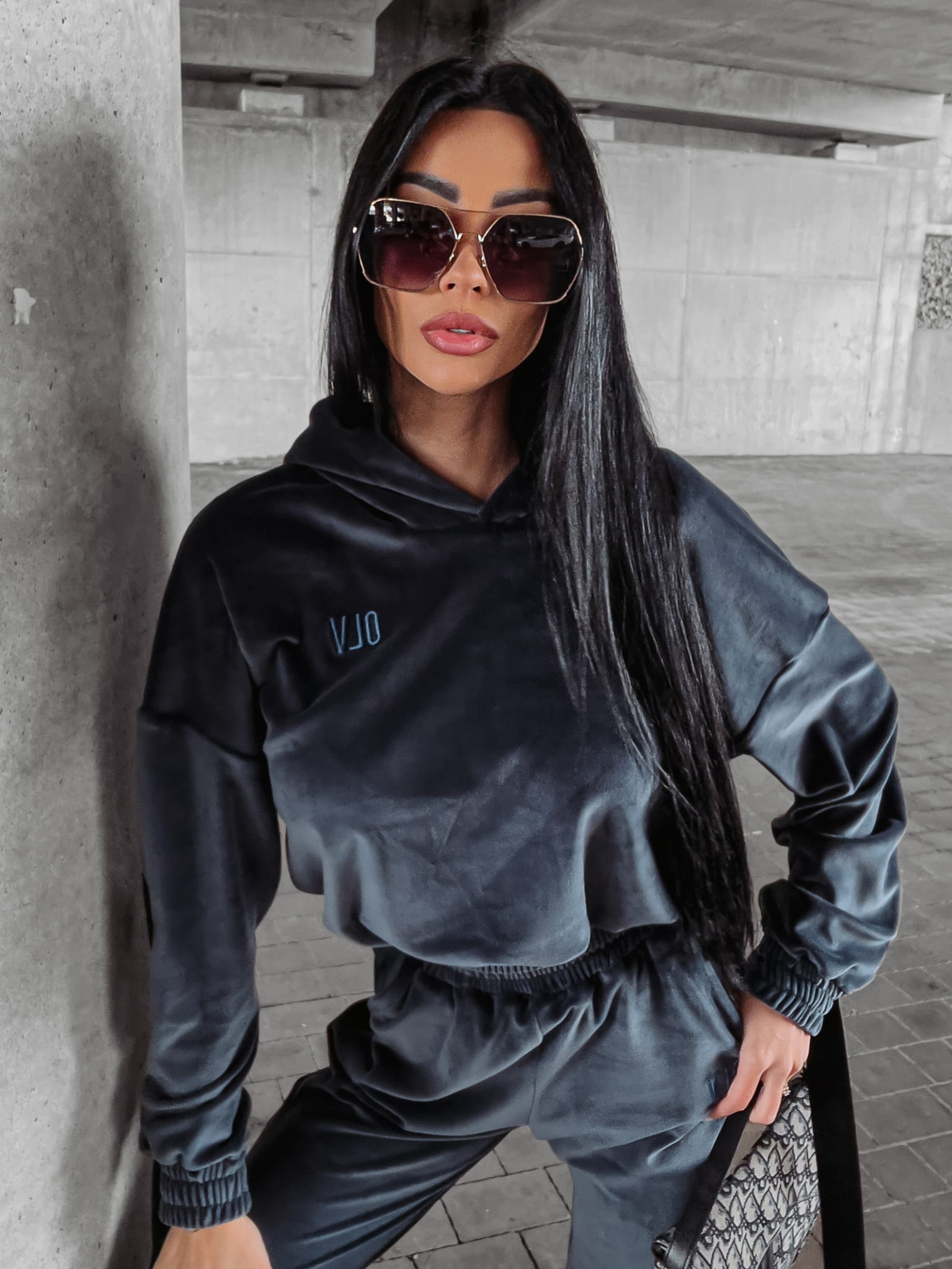Welurowy komplet dresowy – bluza z kapturem i joggery z logowanym lampasem. Przy rękawach doszyte finezyjnie opadające taśmy. Świetnej jakości, mięsisty welur. Na przodzie haft 3d z logo OLV. Brzegi kompletu zakończone ściągaczem.