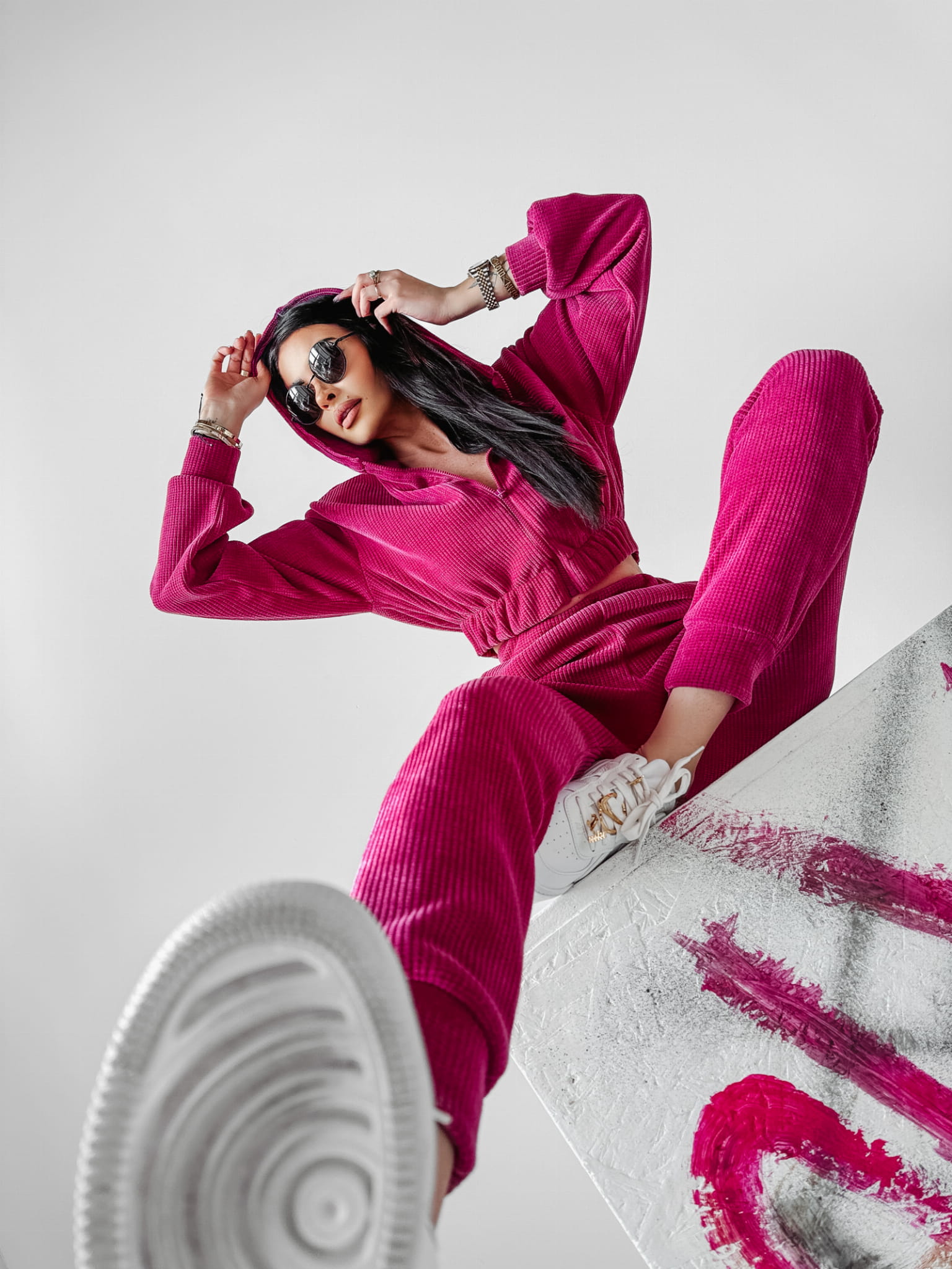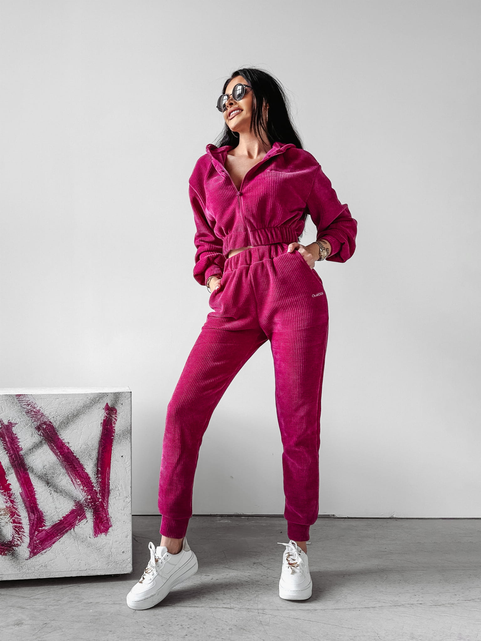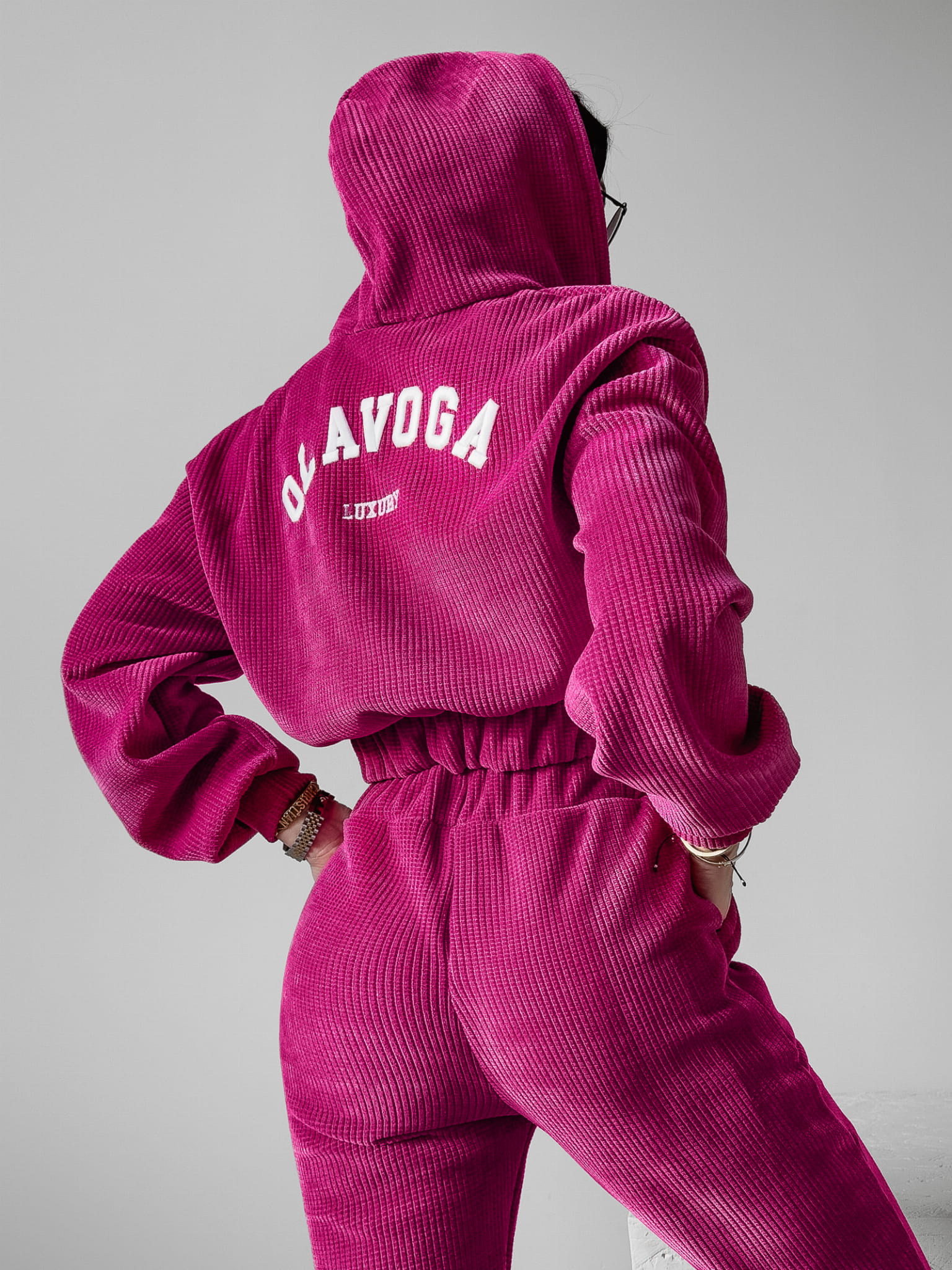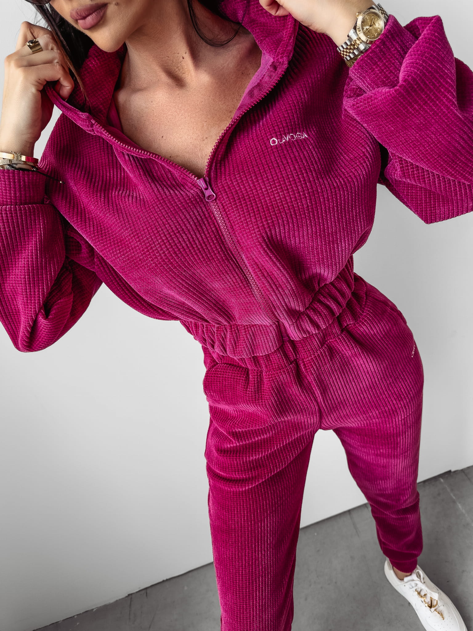 Sportowy komplet uszyty z wysokiej jakości, prążkowanego materiału. Krótka. rozpinana bluza z kapturem. Na przodzie bluzy minimalistyczny haft z logo marki, na tyle duży kontrastowy napis OLAVOGA LUXURY. Dół stanowią dopasowane legginsy - całość idealnie podkreśla sylwetkę.