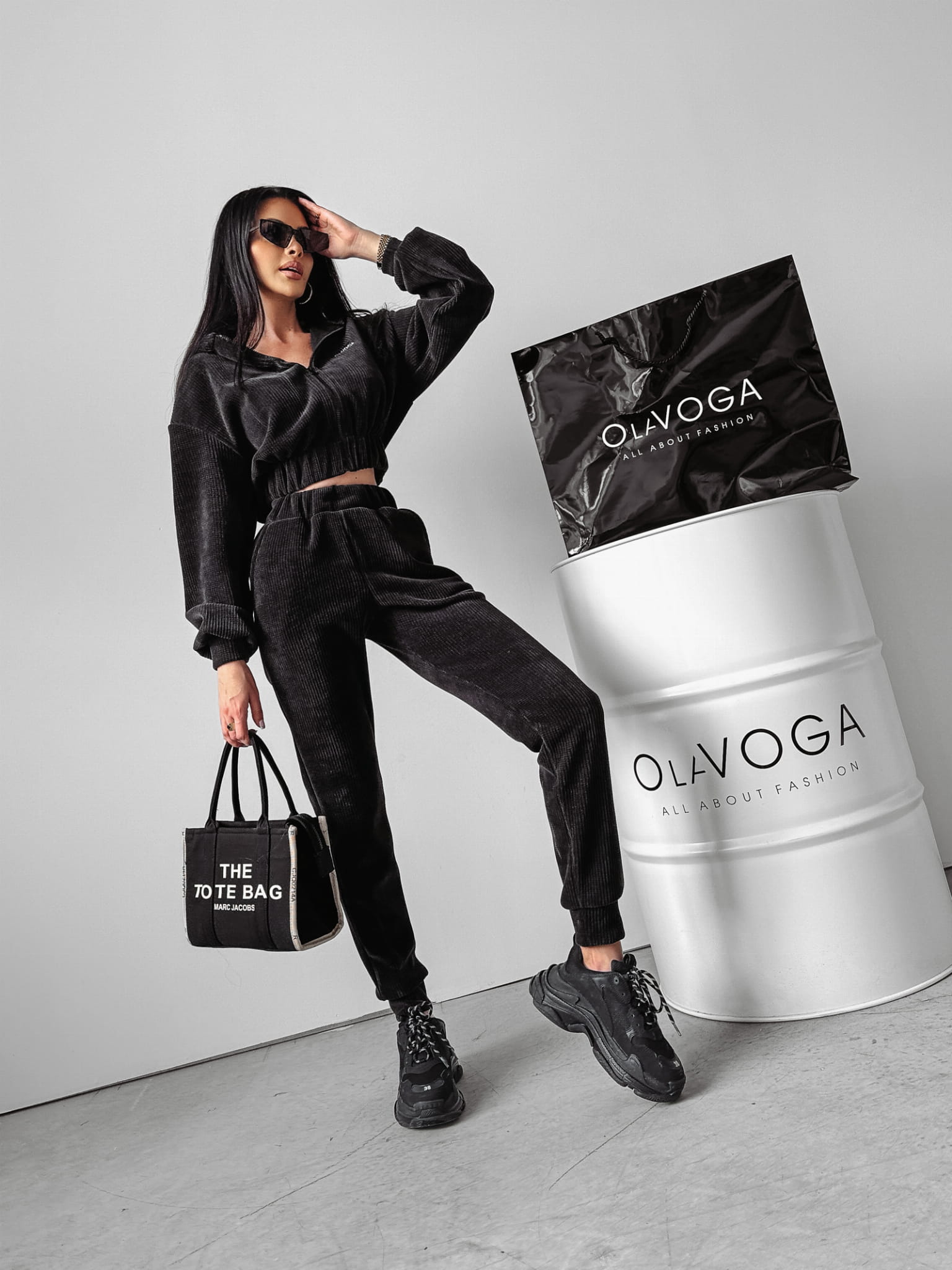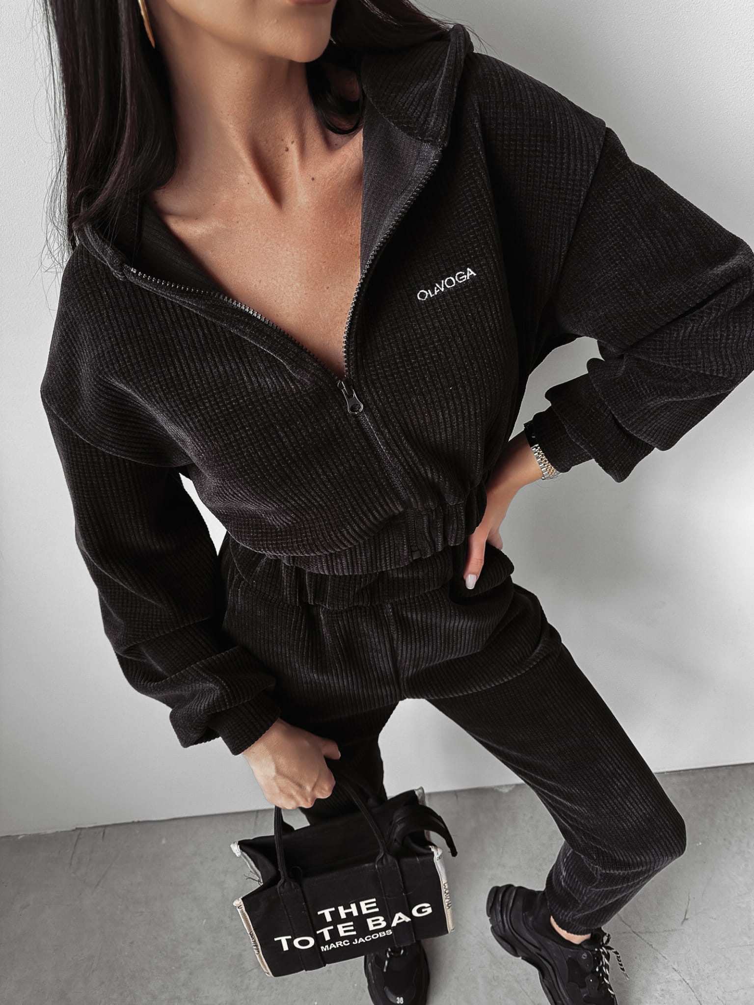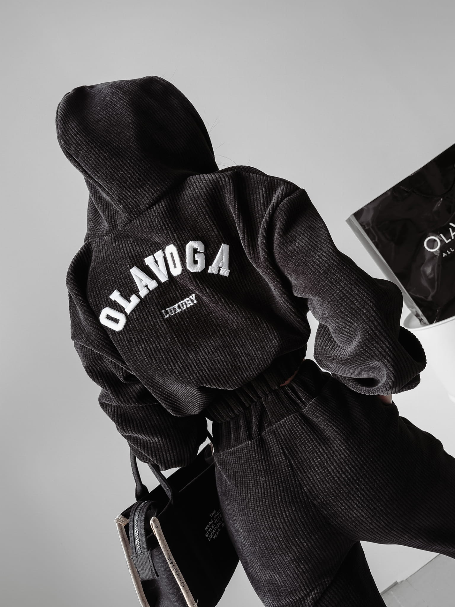Sportowy komplet uszyty z wysokiej jakości, prążkowanego materiału. Krótka. rozpinana bluza z kapturem. Na przodzie bluzy minimalistyczny haft z logo marki, na tyle duży kontrastowy napis OLAVOGA LUXURY. Dół stanowią dopasowane legginsy - całość idealnie podkreśla sylwetkę.