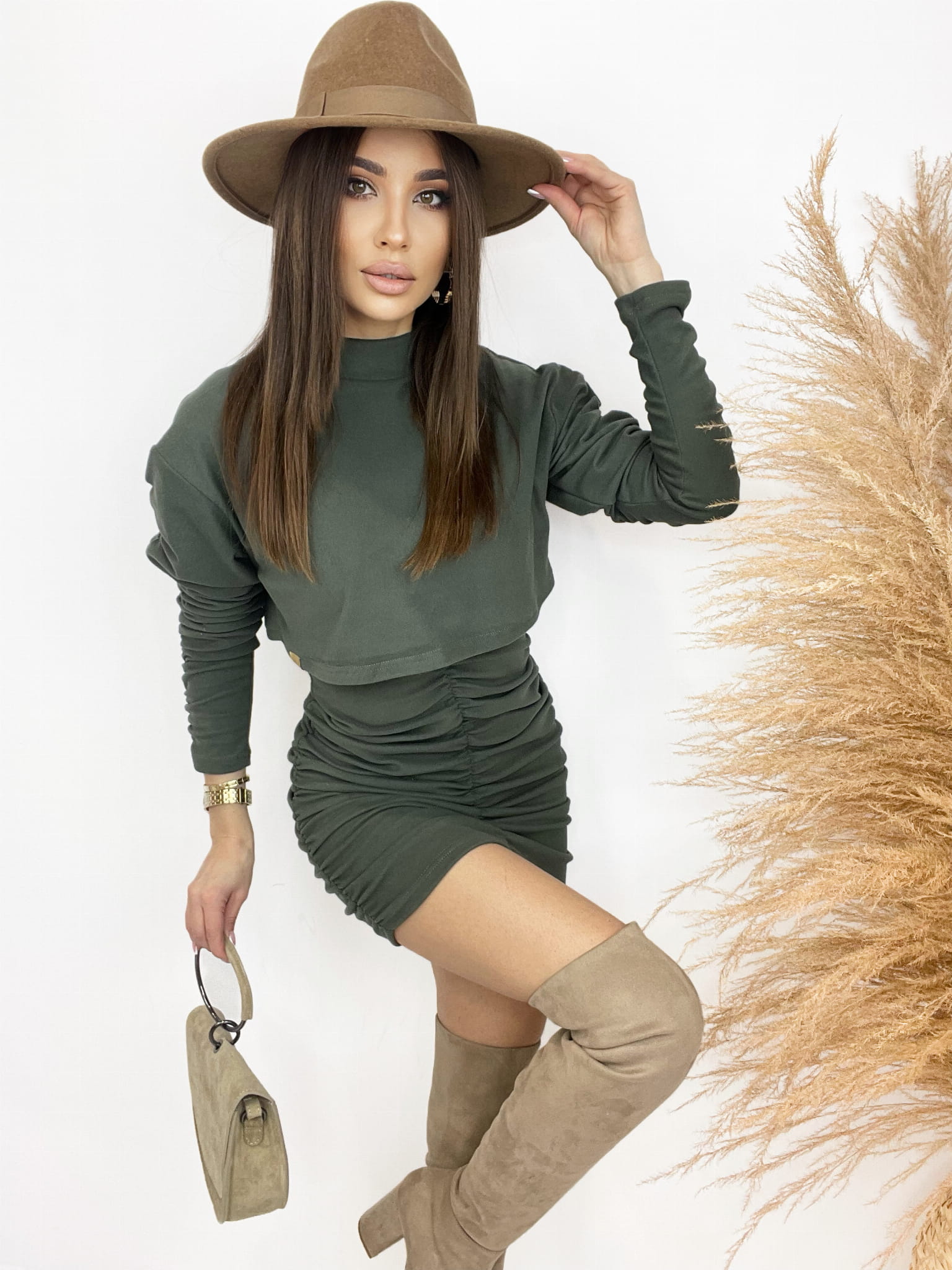 Komplet inny niż wszystkie. Niesamowicie kobiecy, składający się z oversize`owej bluzy i marszczonej sukienki. Bluzę i sukienkę możesz założyć razem lub osobno co pozwala stworzyć nieskończenie wiele stylizacji.