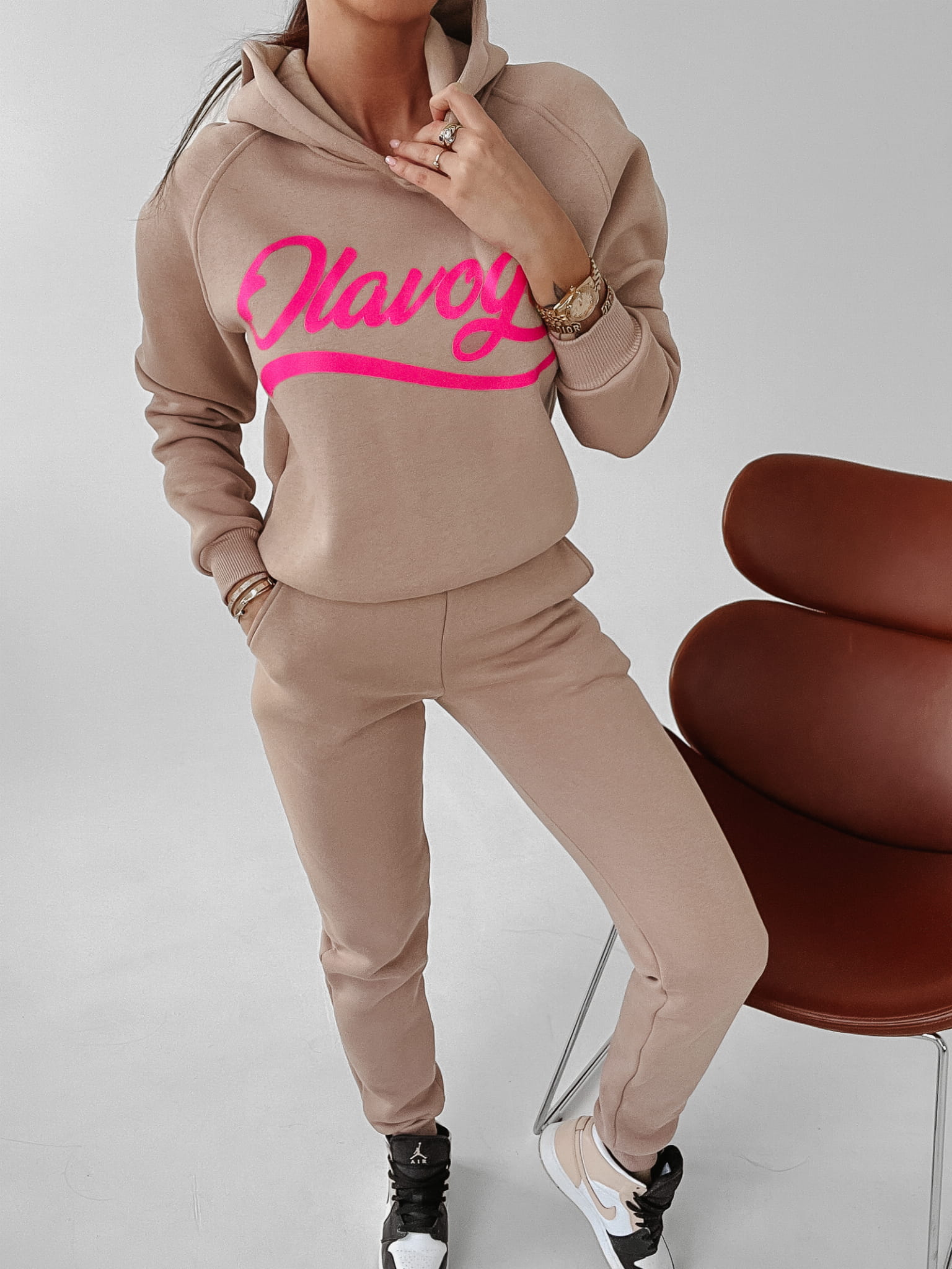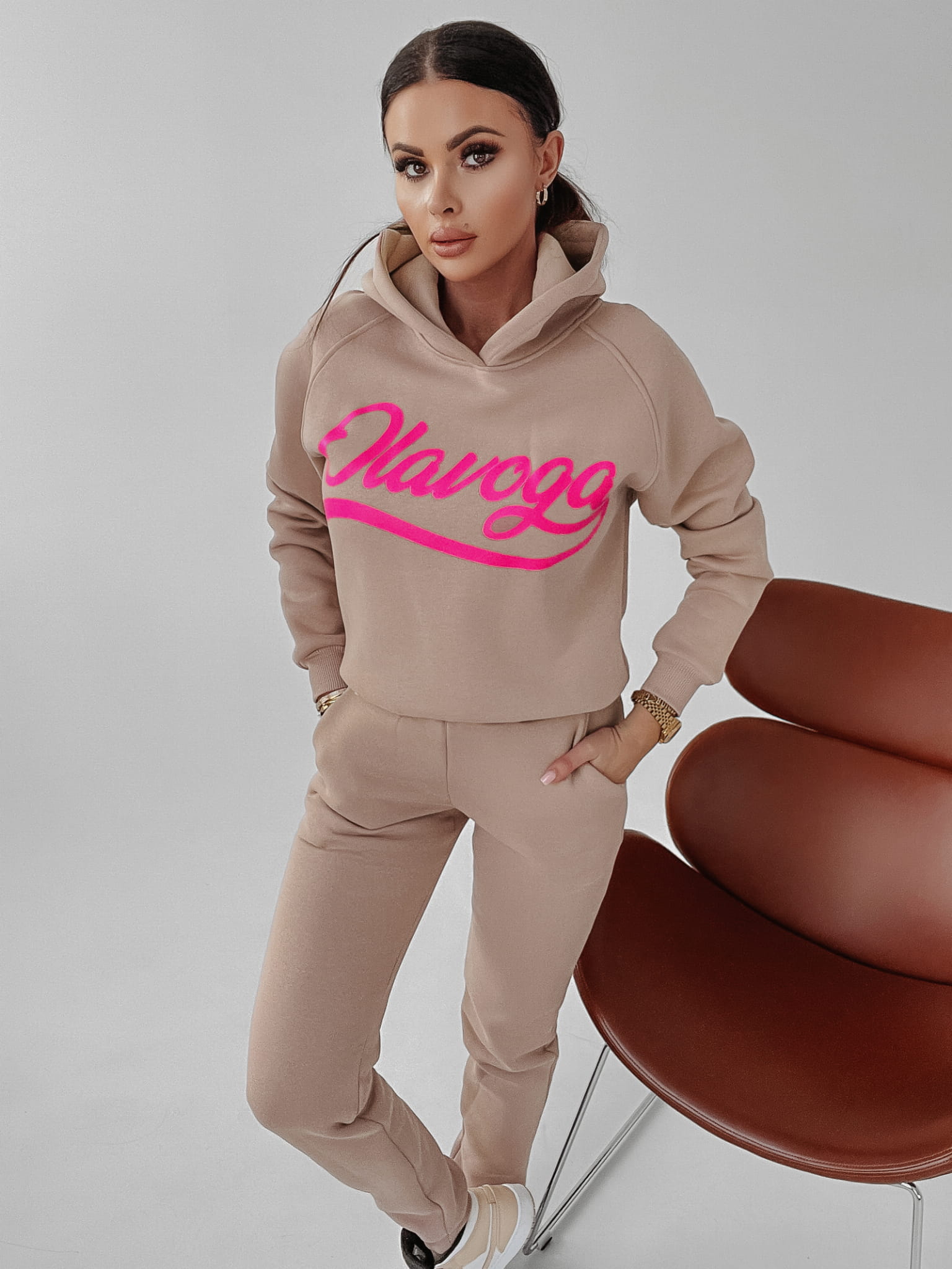Dresowy komplet składający się z bluzy z kapturem i klasycznych, dresowych spodni. Na przodzie bluzy duży, różowy nadruk OLAVOGA w klimacie vintage. Przyjemna w dotyku dresówka sprawia, że ten komplet, raz założony, od razu stanie się Twoim faworytem.