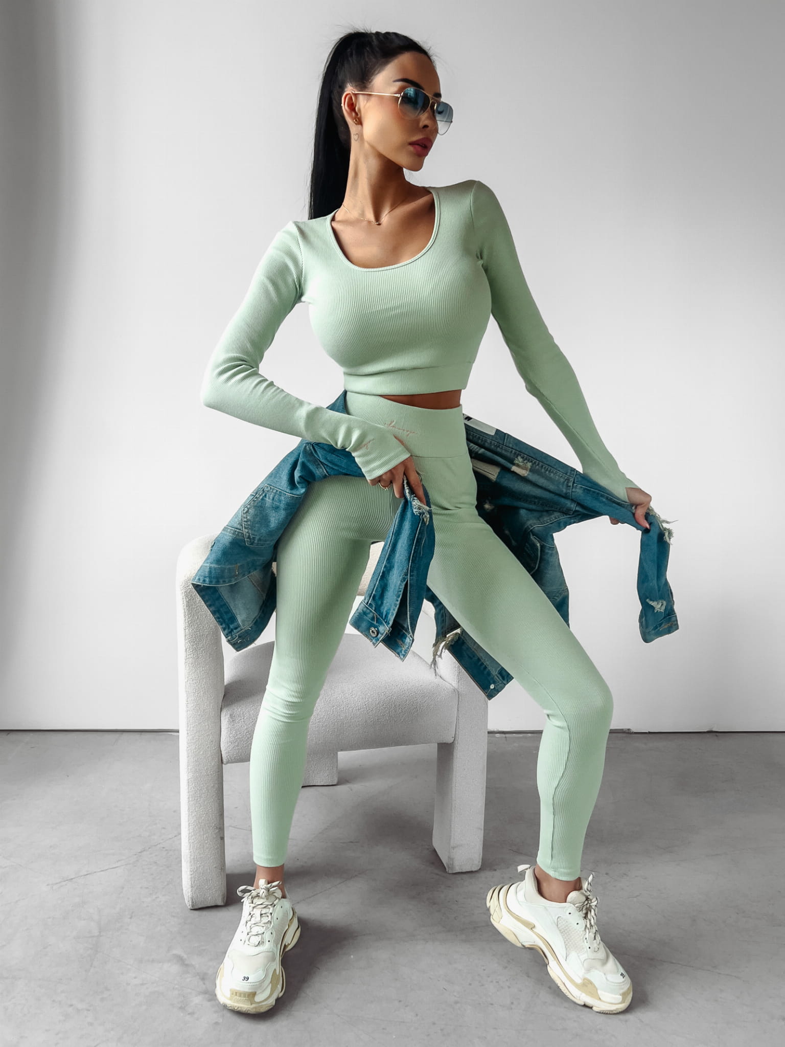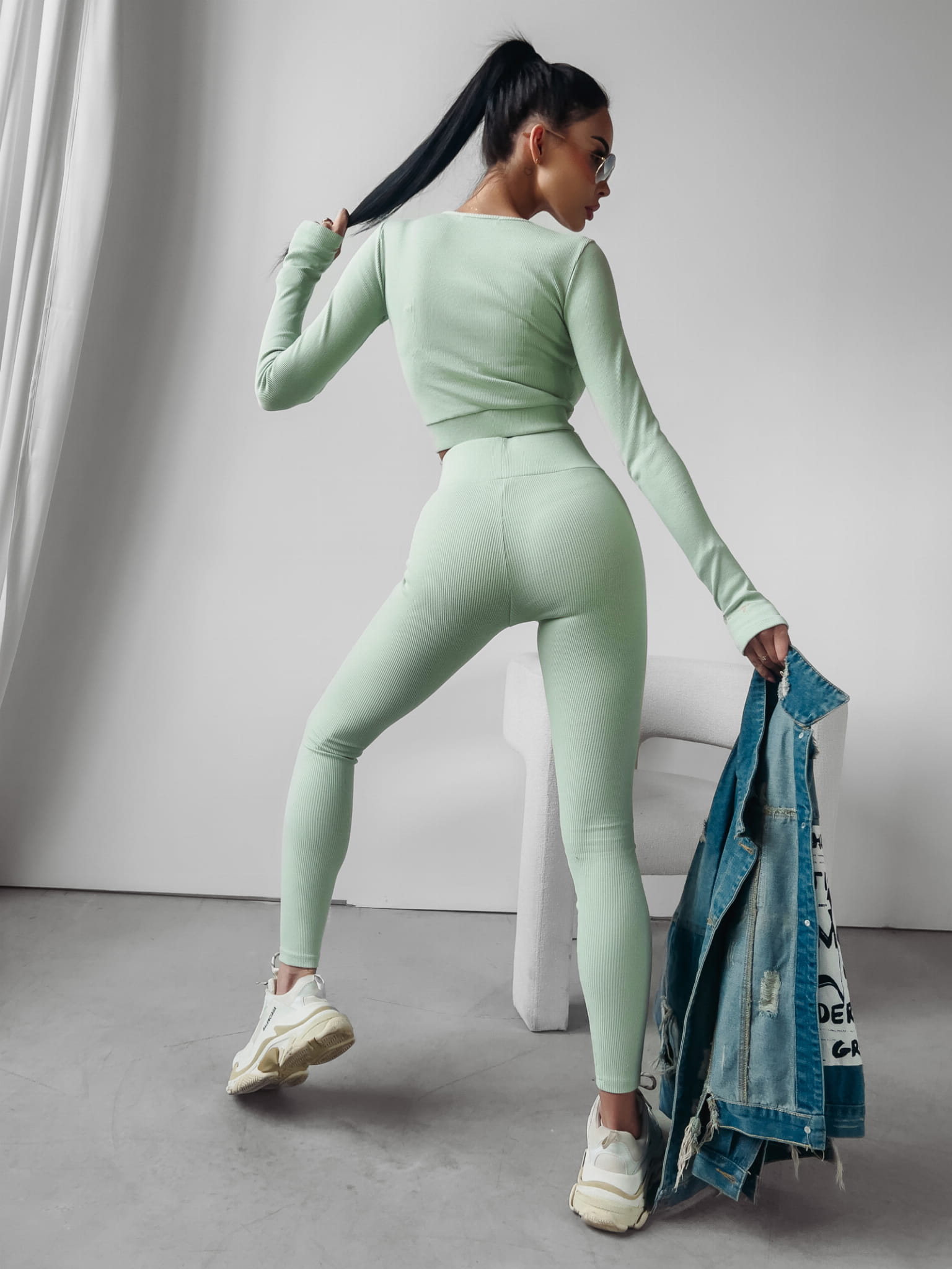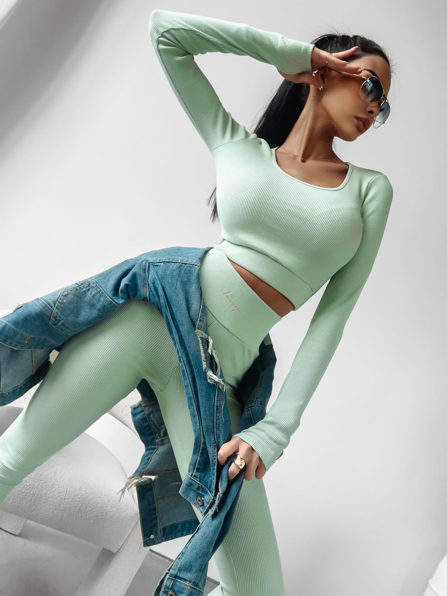 Modelujący komplet wykonany z elastycznego, prążkowanego materiału. Idealnie podkreśla sylwetkę. Góra kompletu posiada długi rękaw z wycięciem na kciuk. Obszerny, okrągły dekolt. Komplet posiada ozdobny haft na rękawie i w pasie.