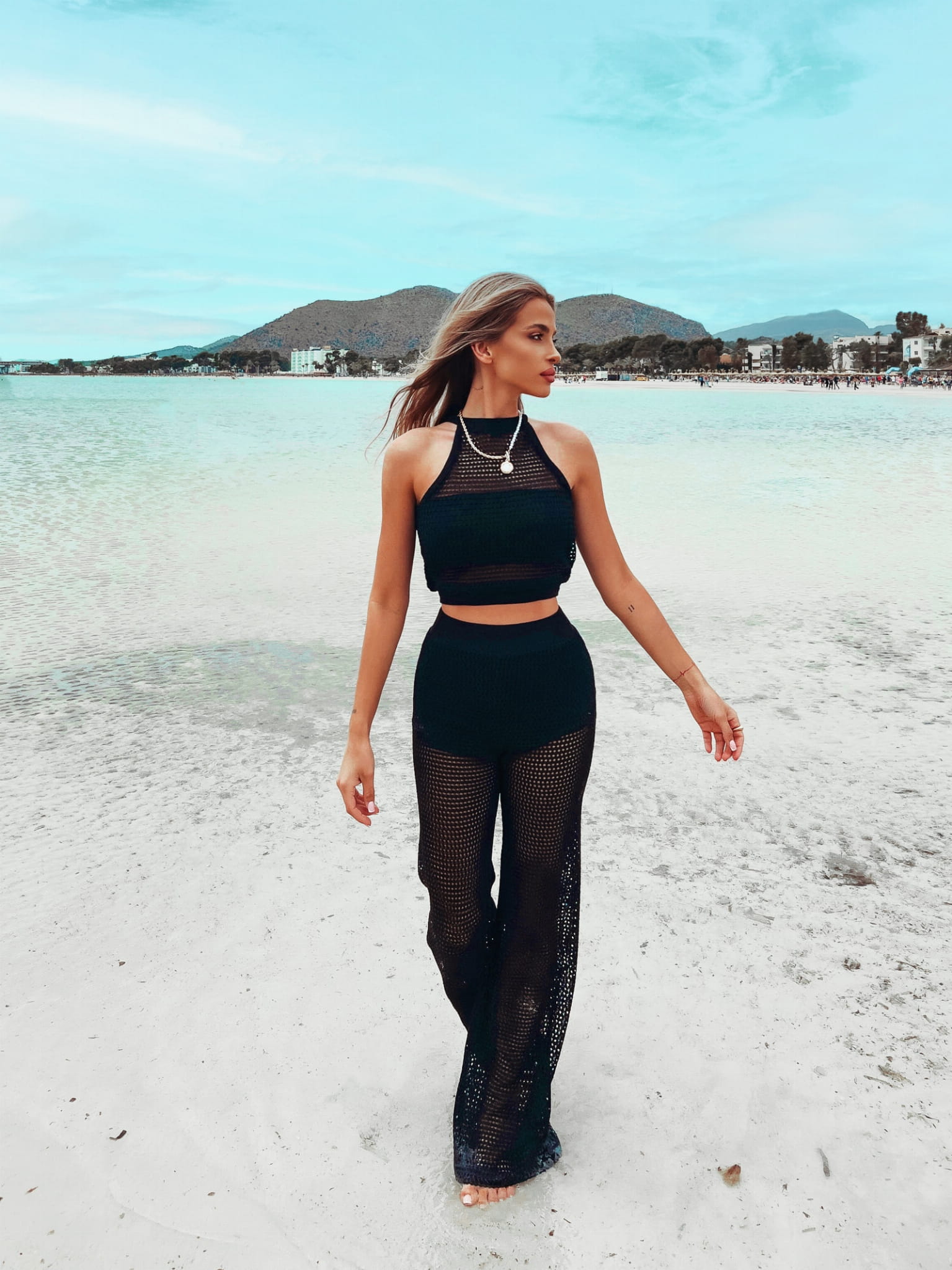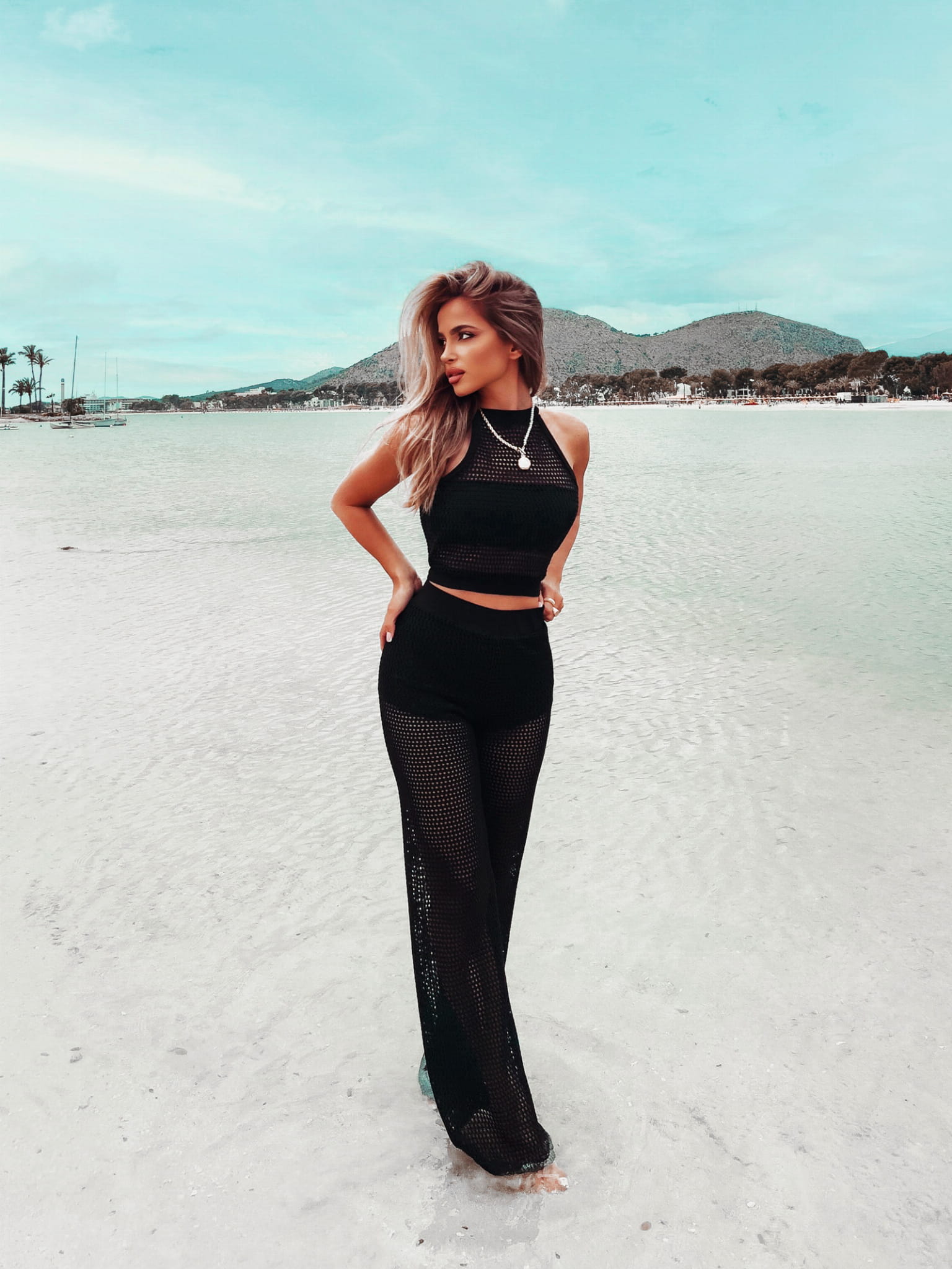 Dwuczęściowy zestaw w stylu boho uszyty z ażurowej tkaniny, o pięknym, delikatnym splocie. Krótki top bez rękawów i spodnie o kroju lekko rozszerzonych dzwonów doskonale wydłużają sylwetkę. Komplet Vero to must have nadchodzących wakacji.